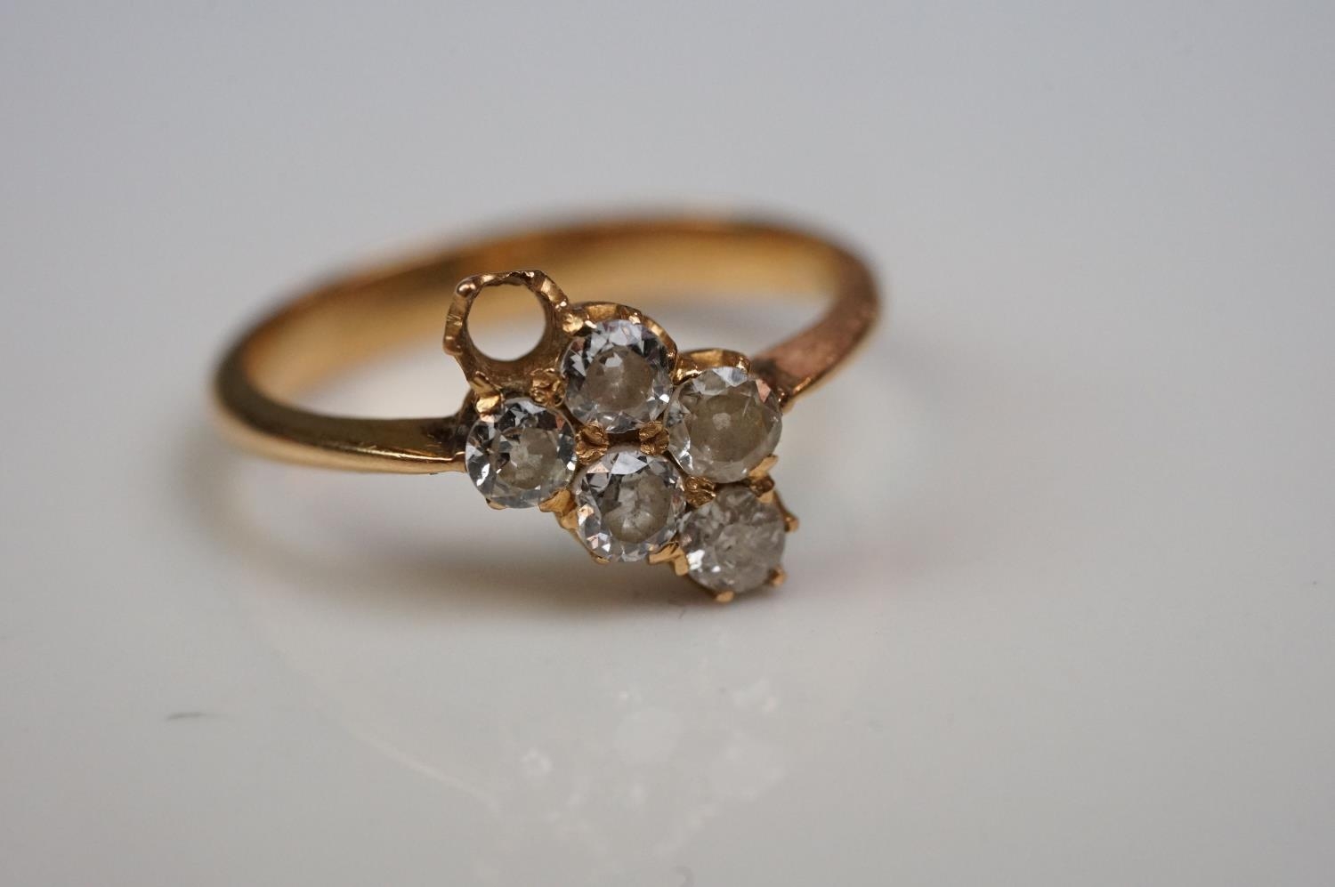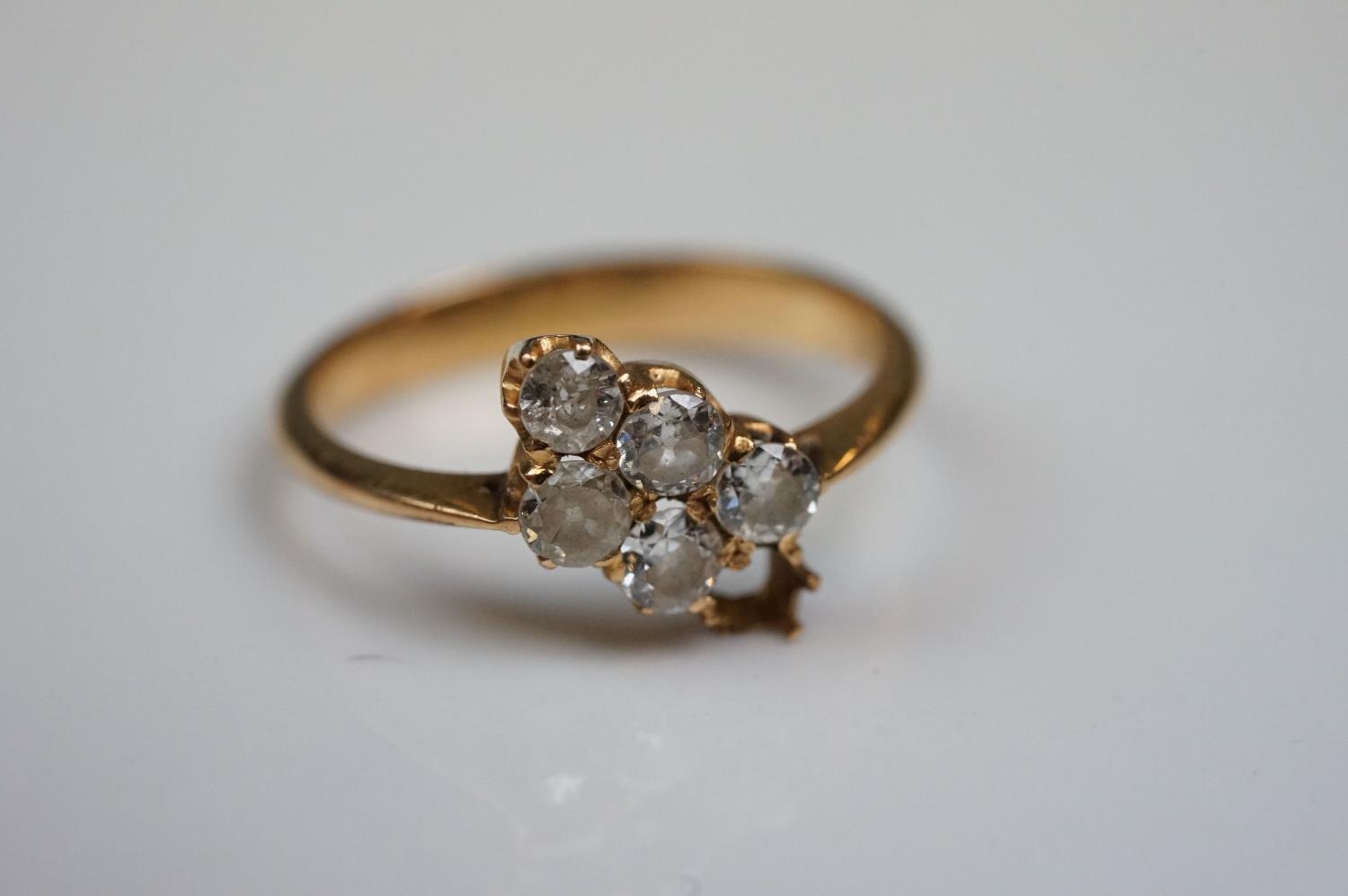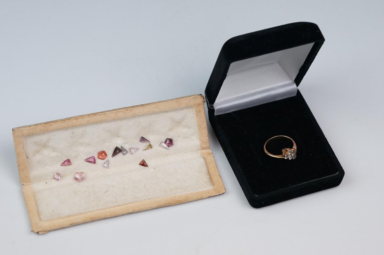 Diamond five stone yellow gold ring (one stone deficient) five round brilliant cut diamonds, claw settings, test as a minimum of 18ct gold together with a small quantity of loose faceted gemstones to include garnet, tourmaline, morganite etc