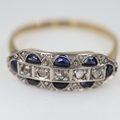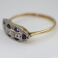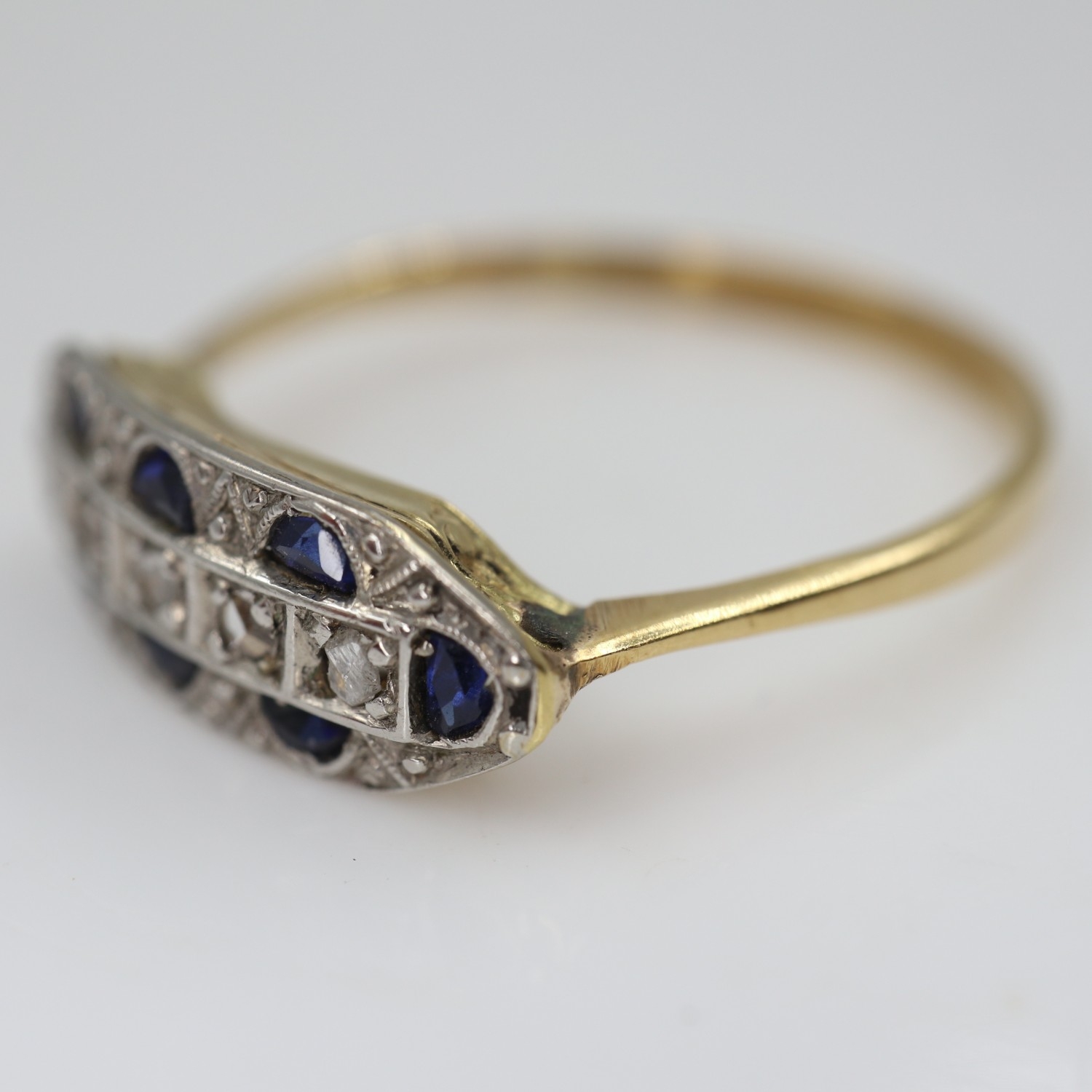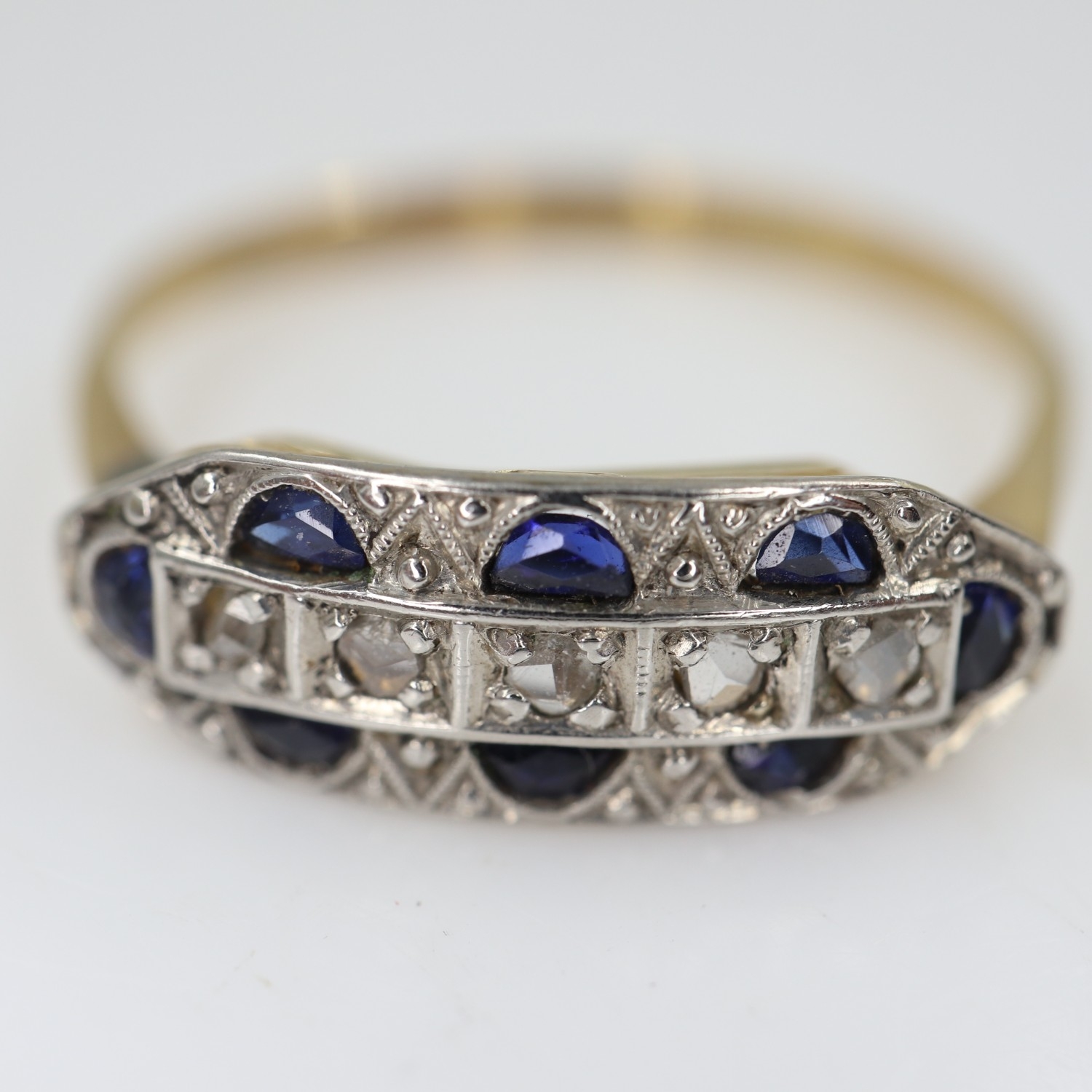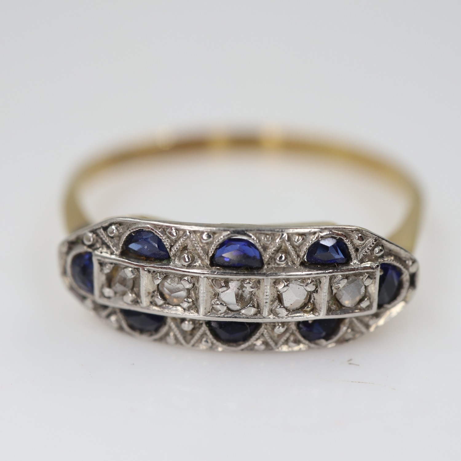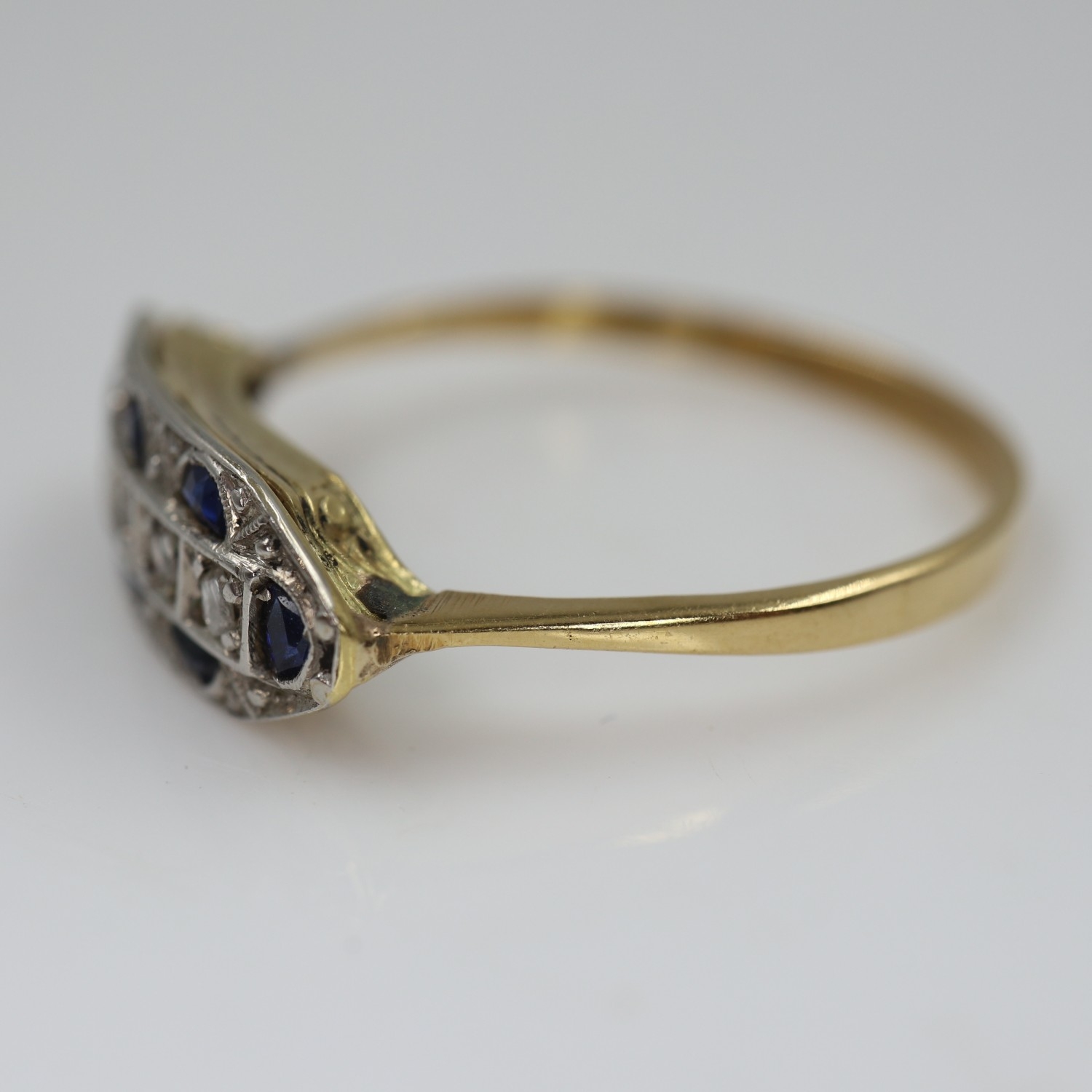An Art Deco period 18ct gold ring set with a multitude of sapphires and diamonds, size N, 1.5g. UK P&P Group 0 (£7+VAT for the first lot and £1+VAT for subsequent lots)