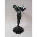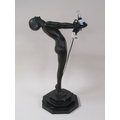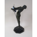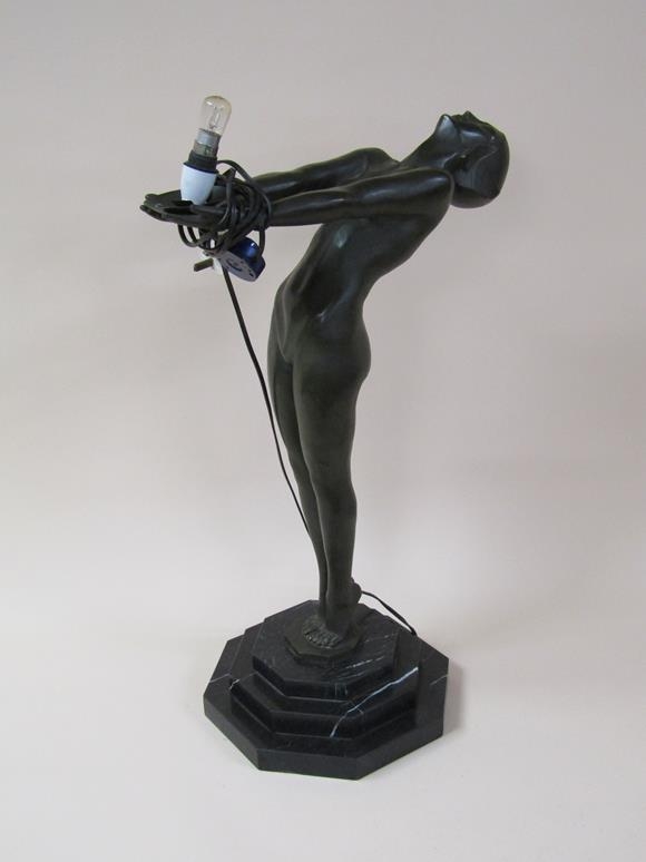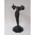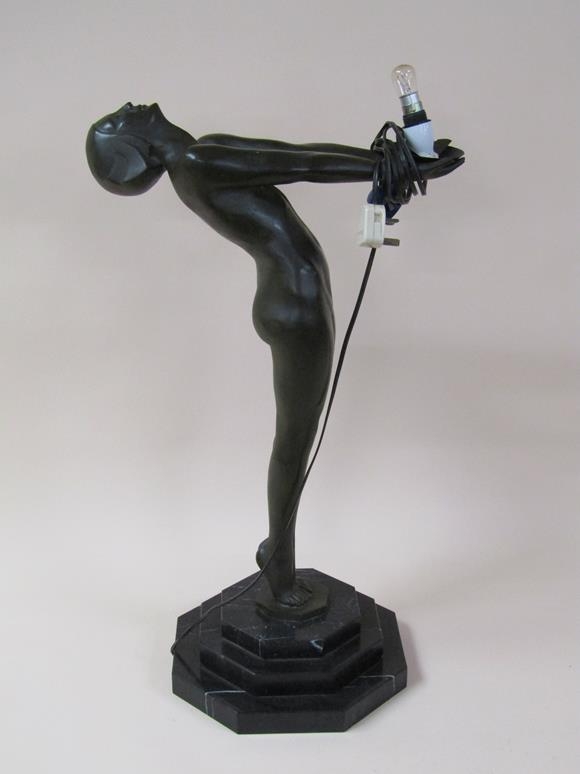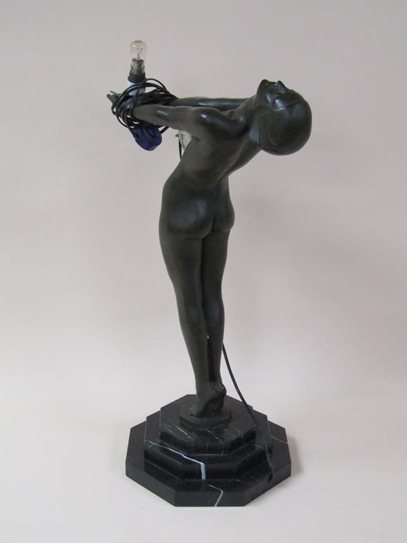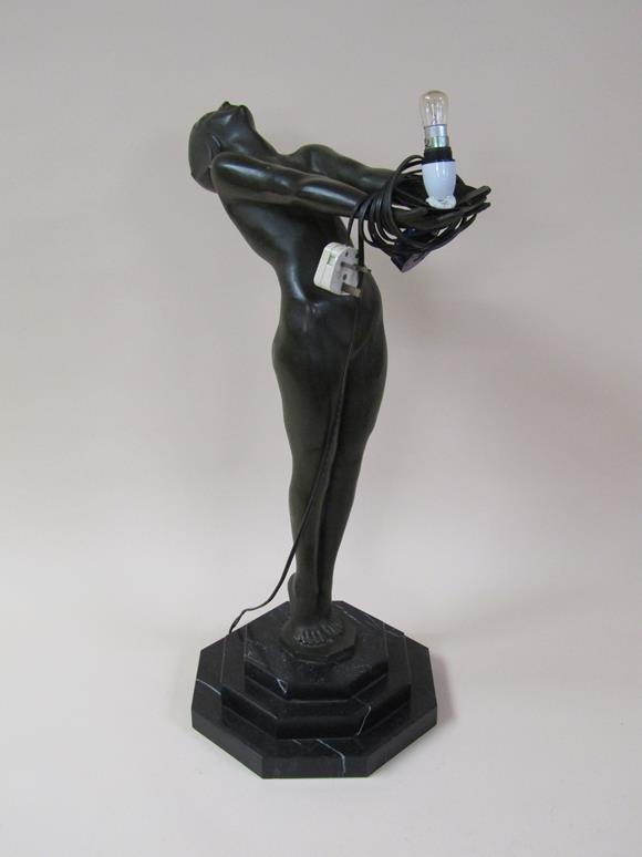 A 1920/30's bronze standing electrolier in the form of a naked female on a stepped marble base, the figure 64cm h, with base 74cm h.