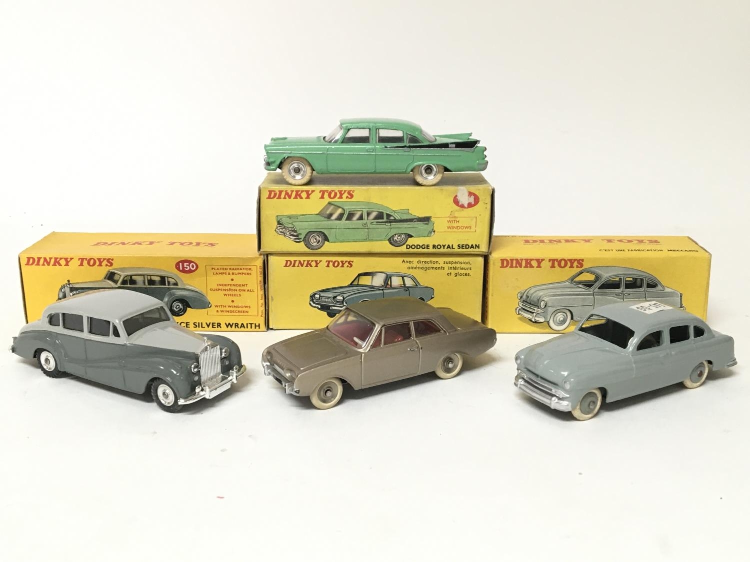 Dinky toys, #559 Ford Taurus 17M, #24X Ford Vedette 54, #150 Rolls Royce silver wraith and #191 Dodge royal sedan, boxed