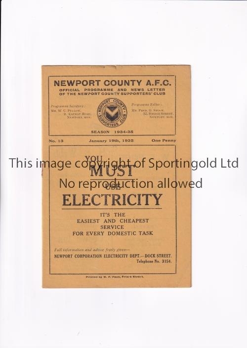 1935 NEWPORT COUNTY V MILLWALL Programme for the match at Newport 19/1/35. Good