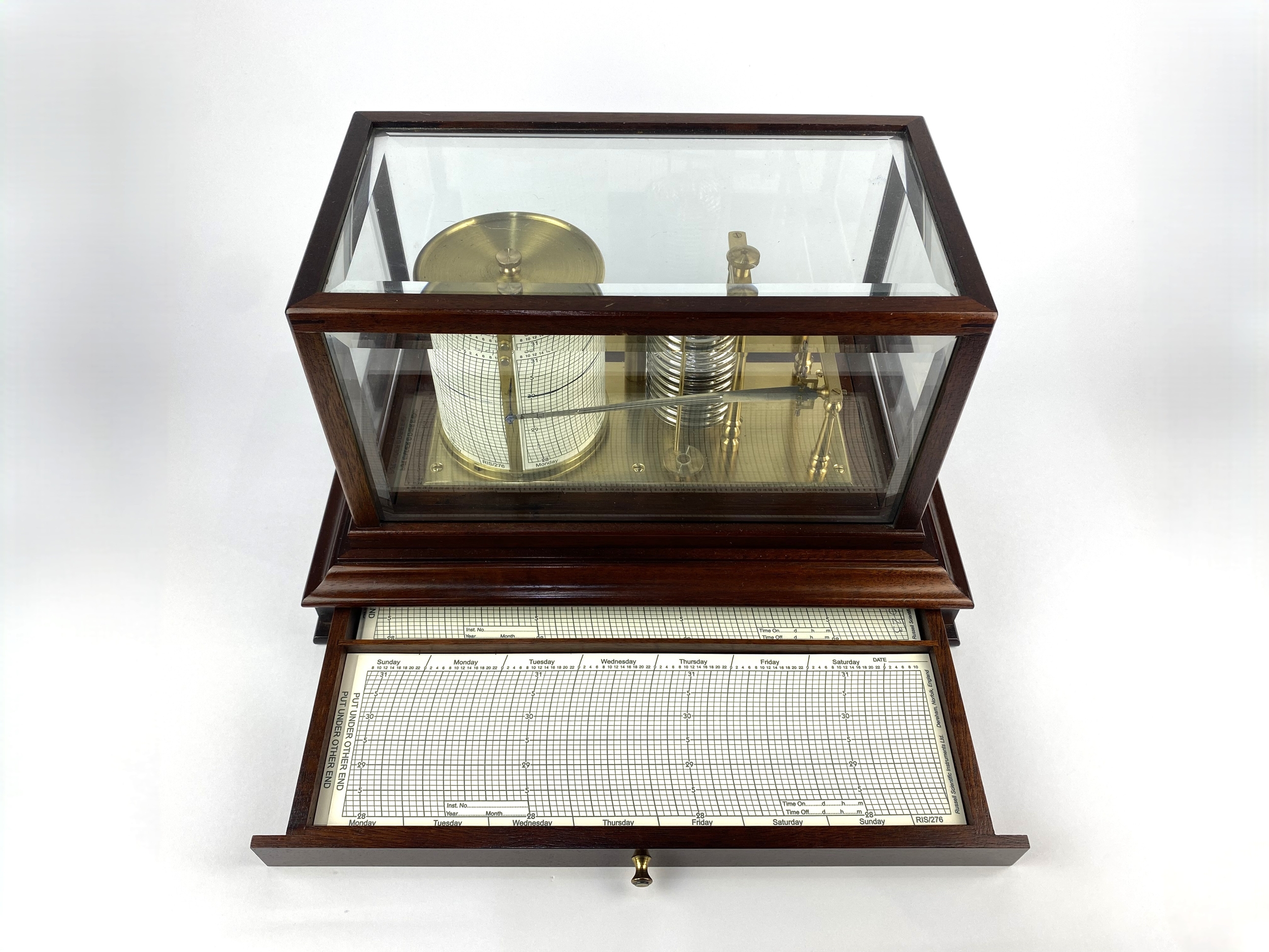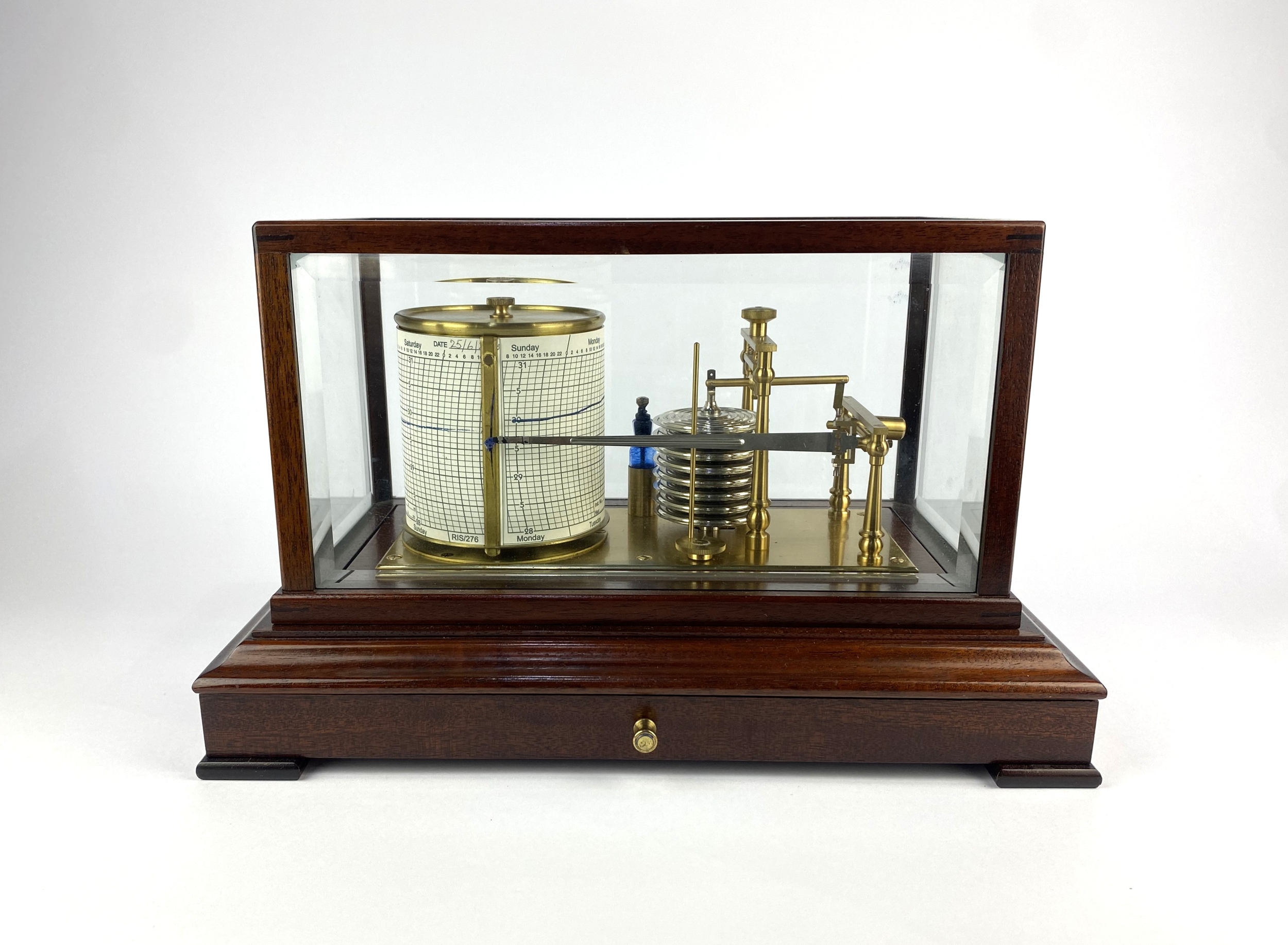 A 20th century mahogany cased barograph, with graph drawer to base containing graph papers, 22cm high, 36cm wide, 22cm deep