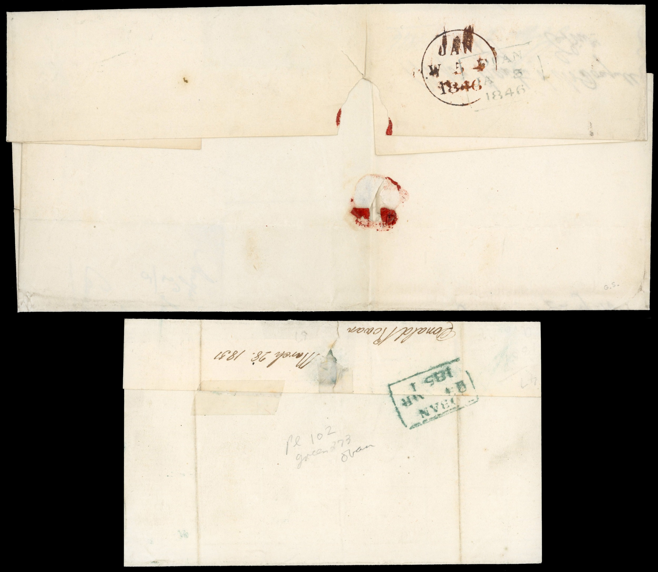 1841 2d blue, Plate 3 horizontal pair (JC-JD), large to enormous margins showing parts of next stamps, on cover tied by blue barred â??273â?? numeral of Oban, backstamped with boxed (1.3.46) handstamp and Edinburgh (5.1) arrival cds and 1841 1d red-brown, plate 102 (OJ), good to enormous margins, on large piece tied by inverted â??273â?? blue-green numeral, backstamped by Oban (25.3.51) boxed despatch; both have filing folds away from the adhesives. An unusual pair.