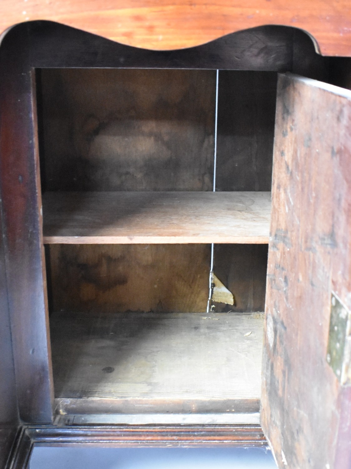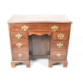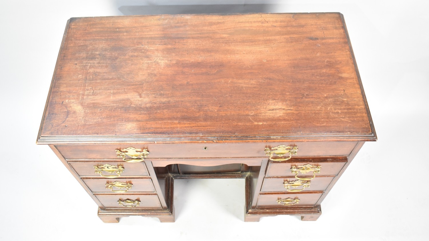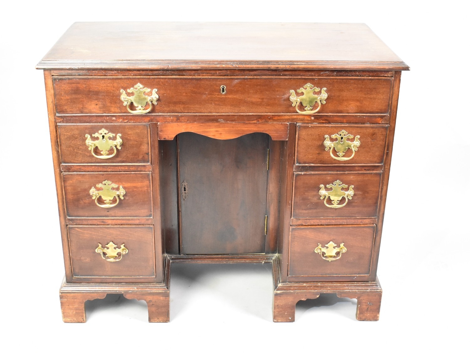 A 19th Century Mahogany Kneehole Writing Desk with Brass Drop Handles to Single Long Top Drawer and Three Short Drawers Either Side Kneehole with Door to Shelved Central Cupboard, 90cms Wide and 77cms High