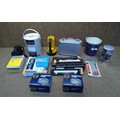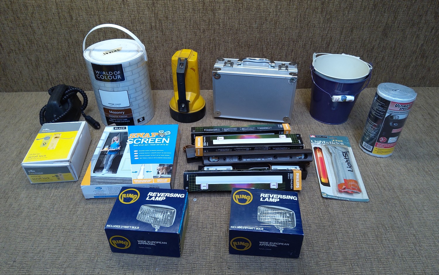 Mixed items including Nicky Clarke hair clipper set, Cream masonry paint and brass door handles.