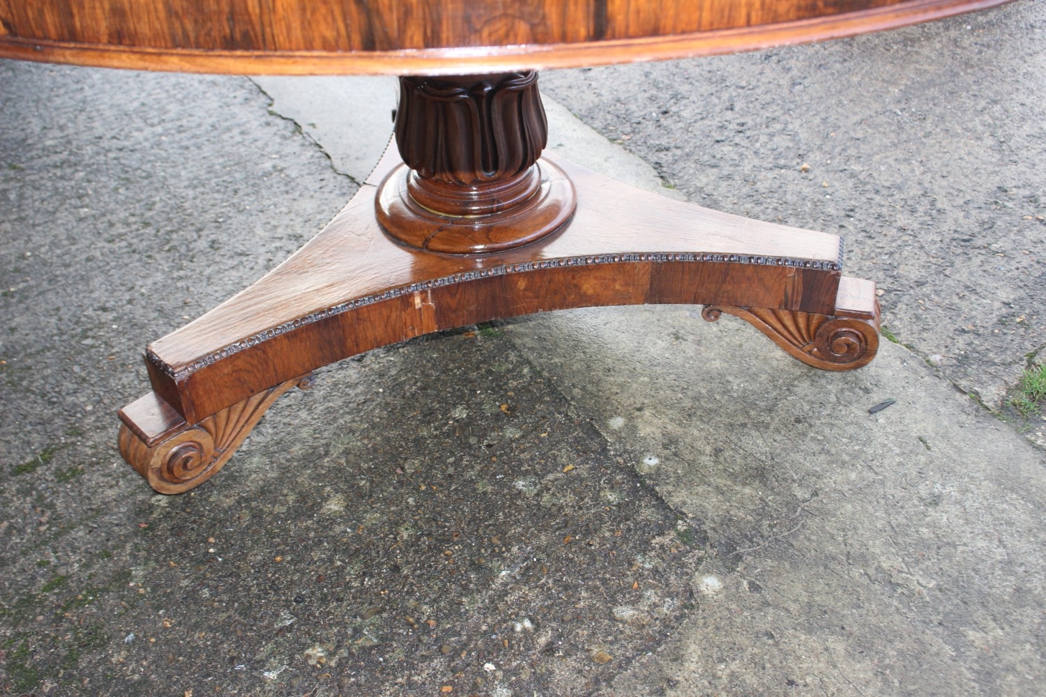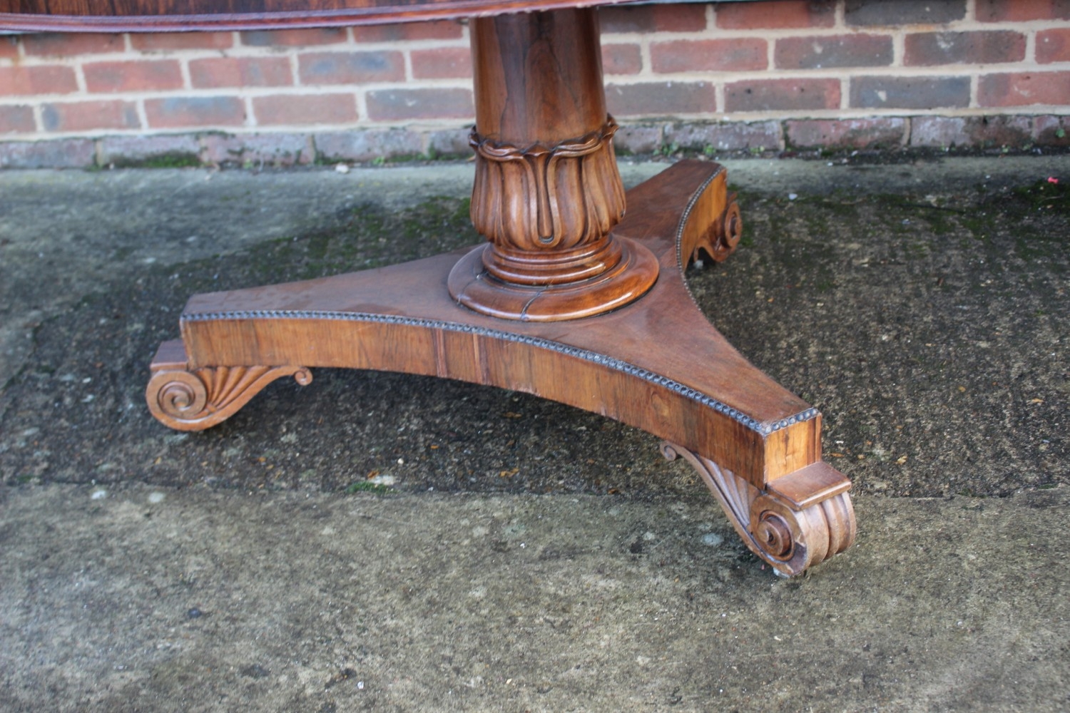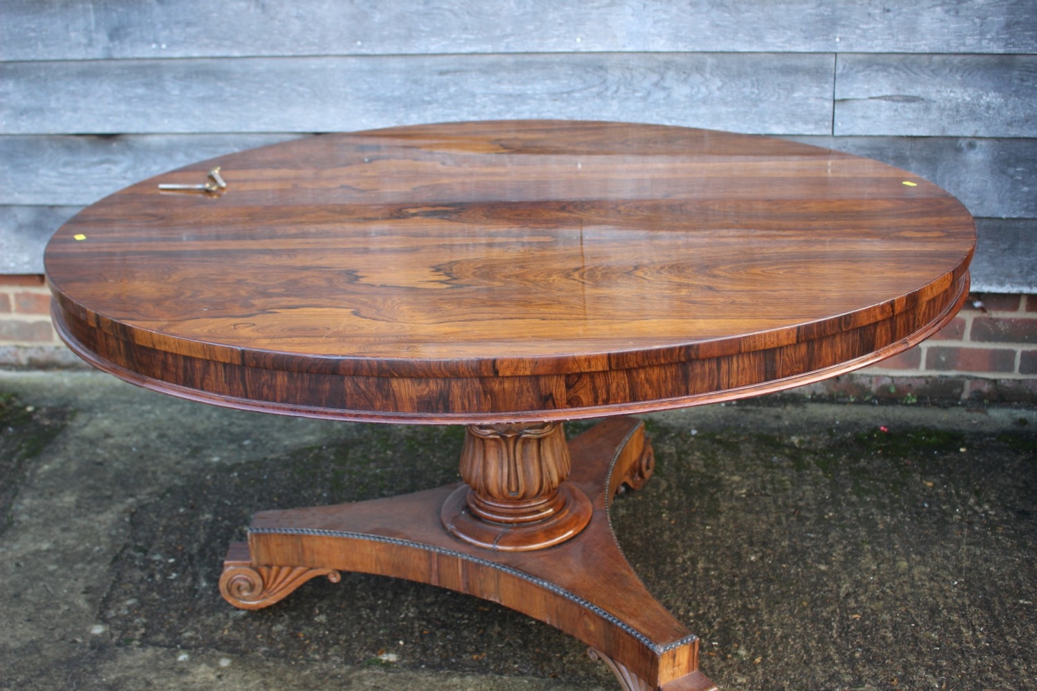 A Regency rosewood circular tilt-top dining table, on turned and carved column, triform base and carved feet, 55" deep x 28" high