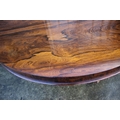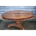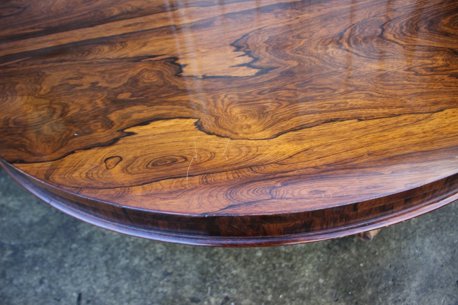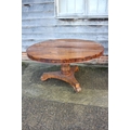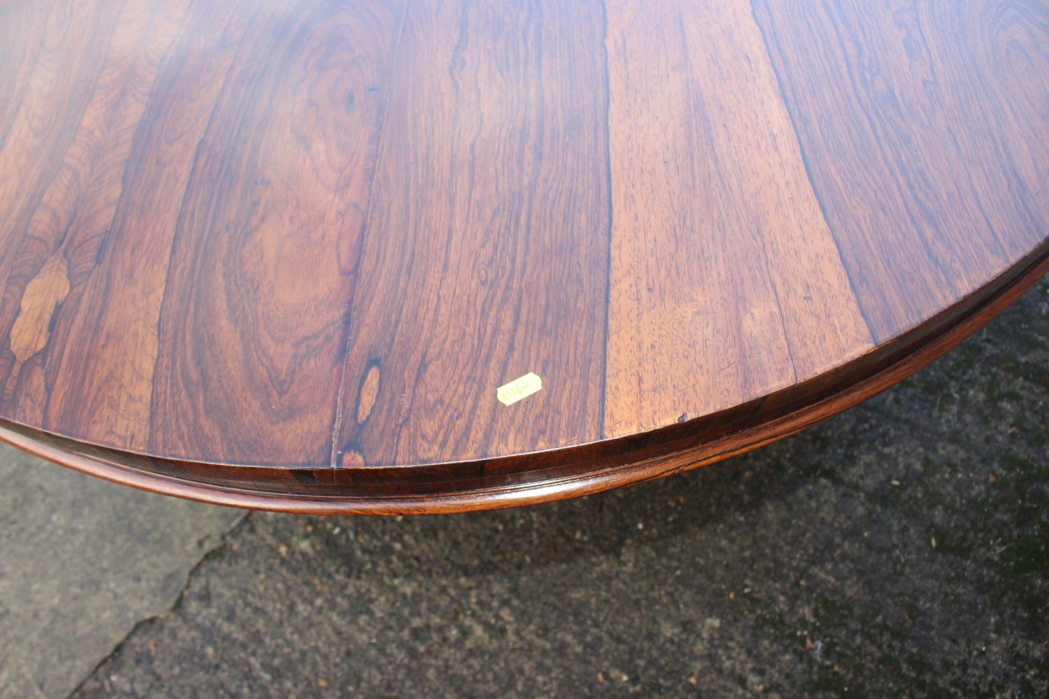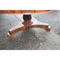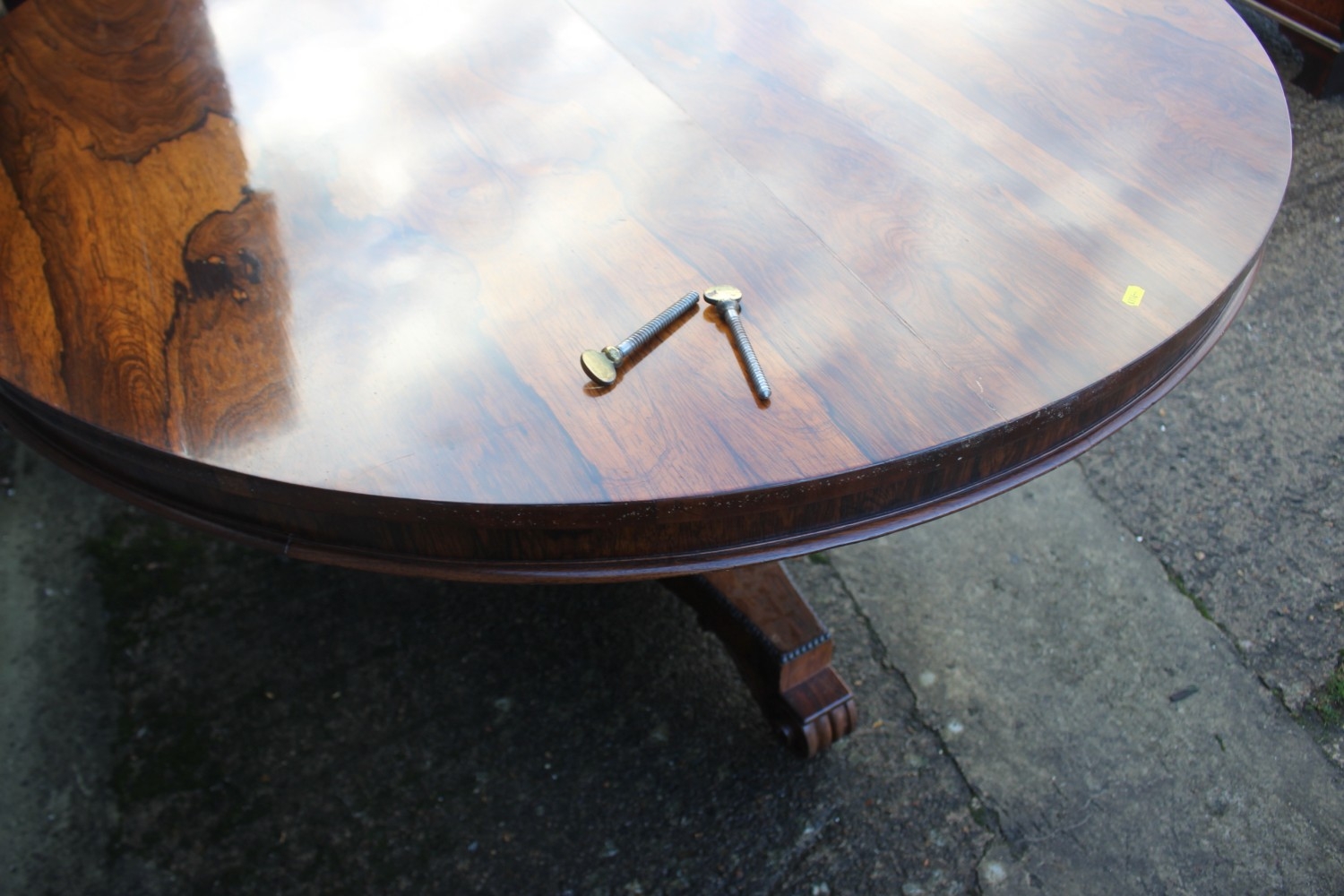A Regency rosewood circular tilt-top dining table, on turned and carved column, triform base and carved feet, 55" deep x 28" high