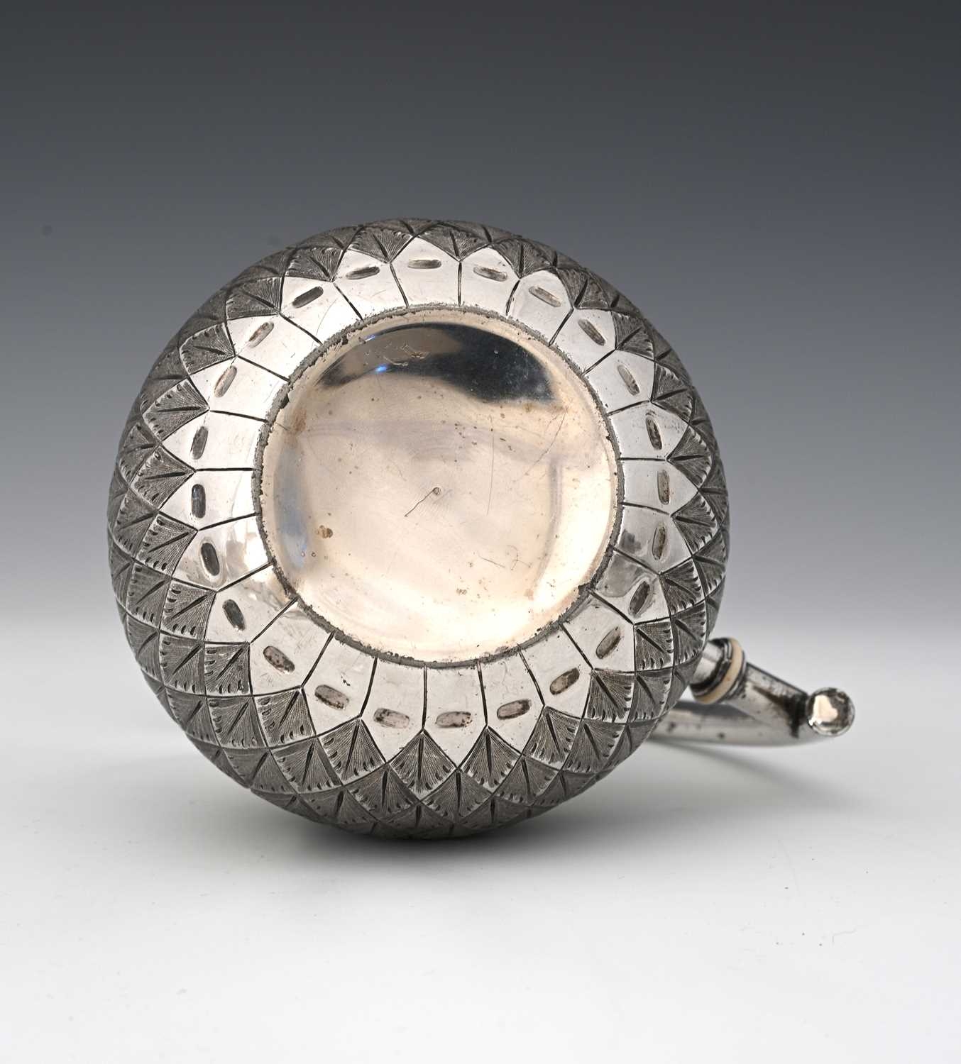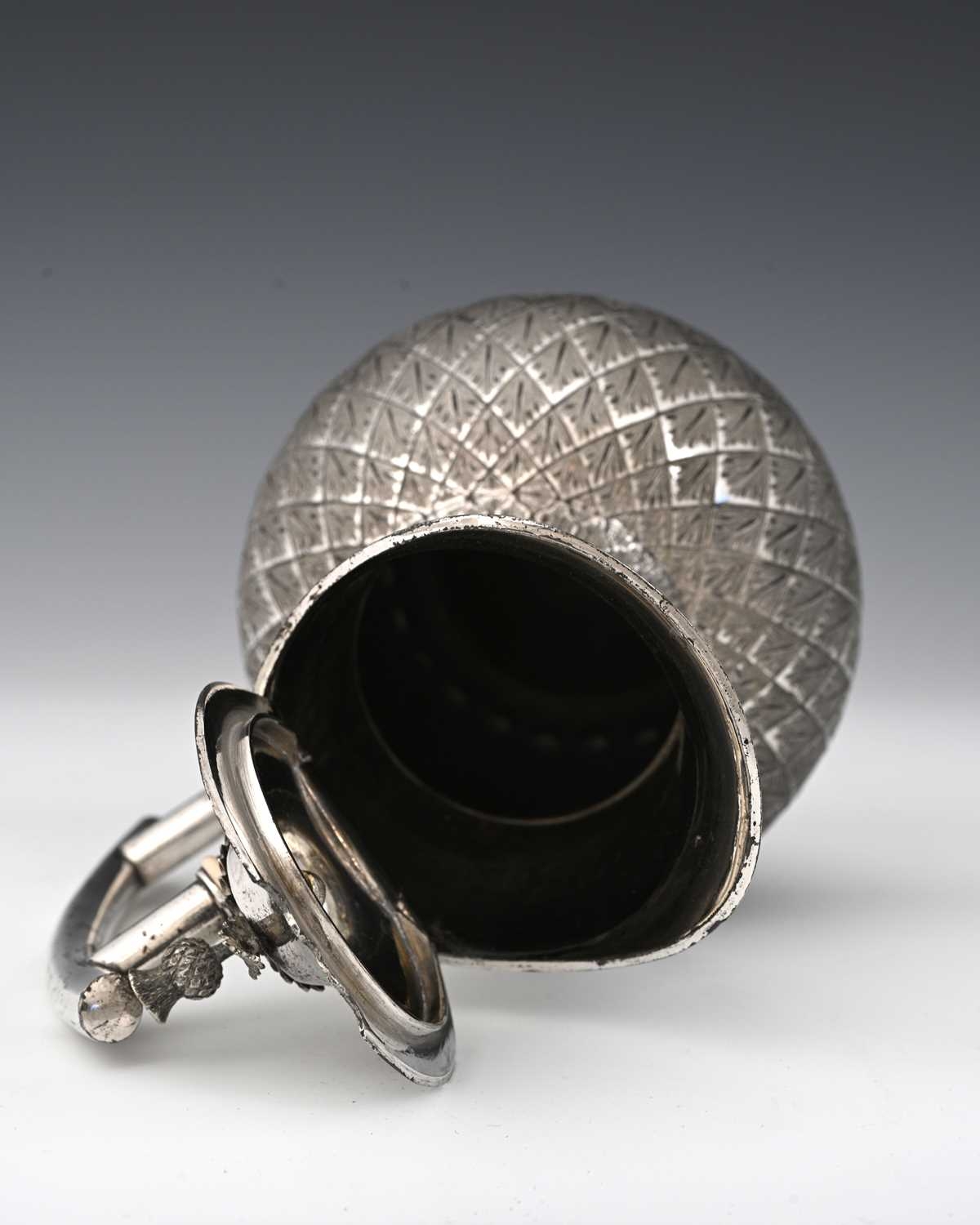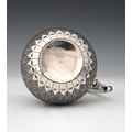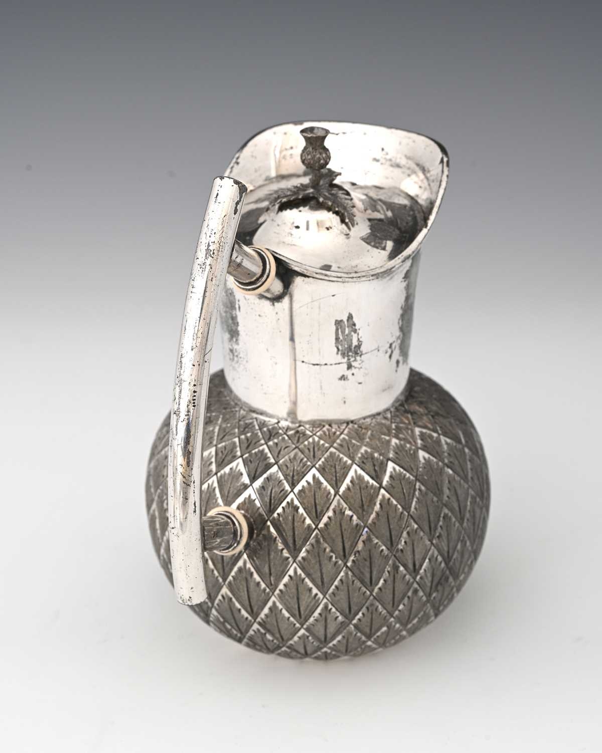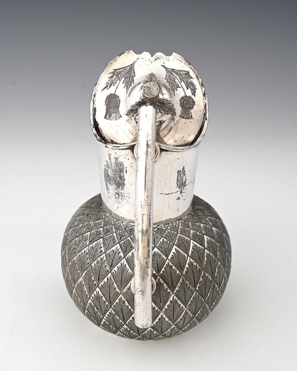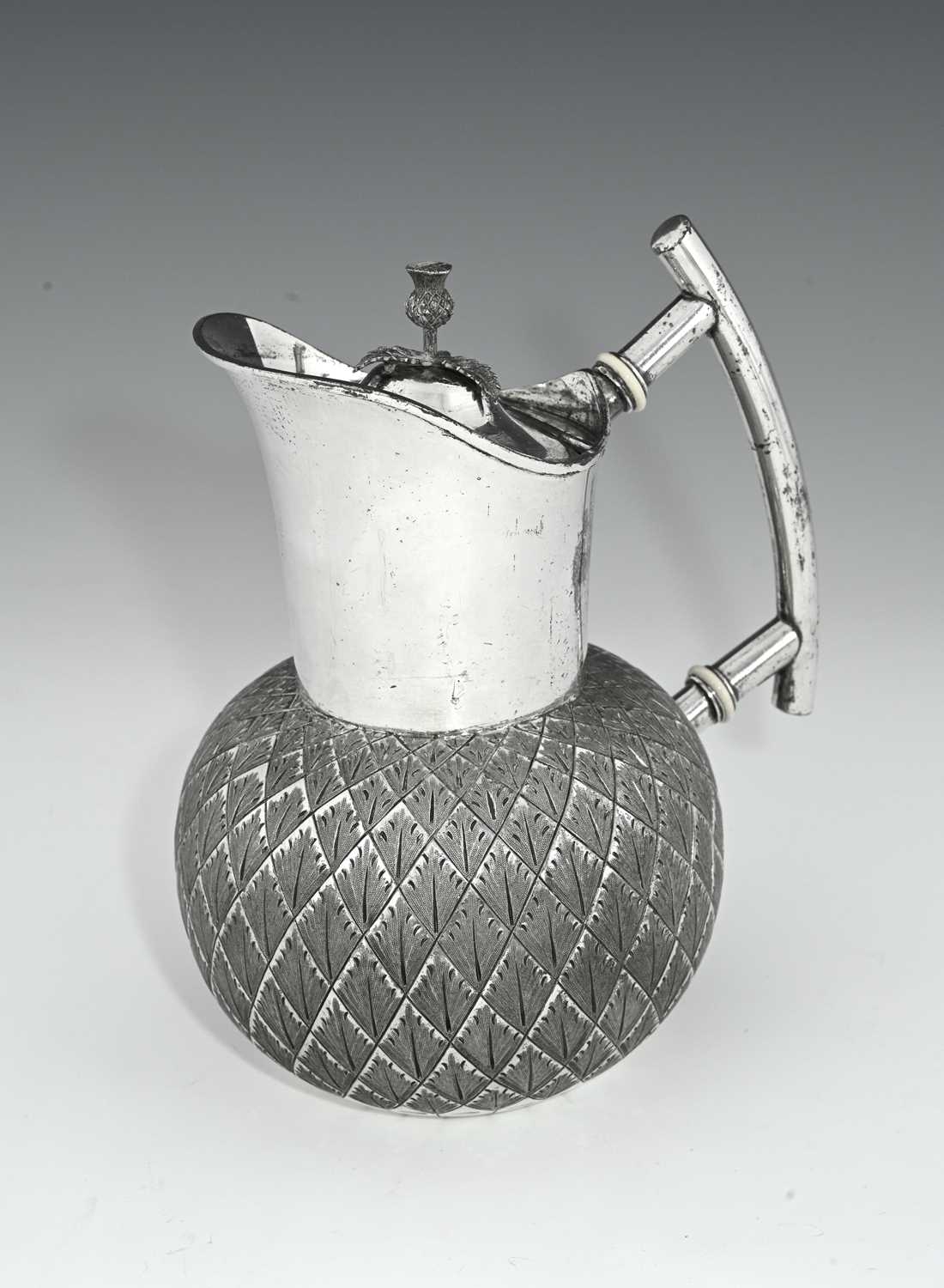 A Scottish Aesthetic Movement novelty silver plated claret jug or water jug, circa 1870, in the form of a thistle flower, the spherical body engraved with foliate diaper pattern, tapered neck and domed lid with floral finial, the handle of tubular rod construction with ceramic insulators, 21cm high