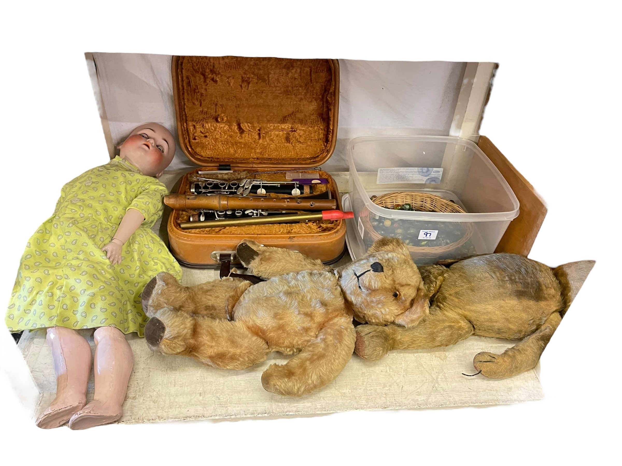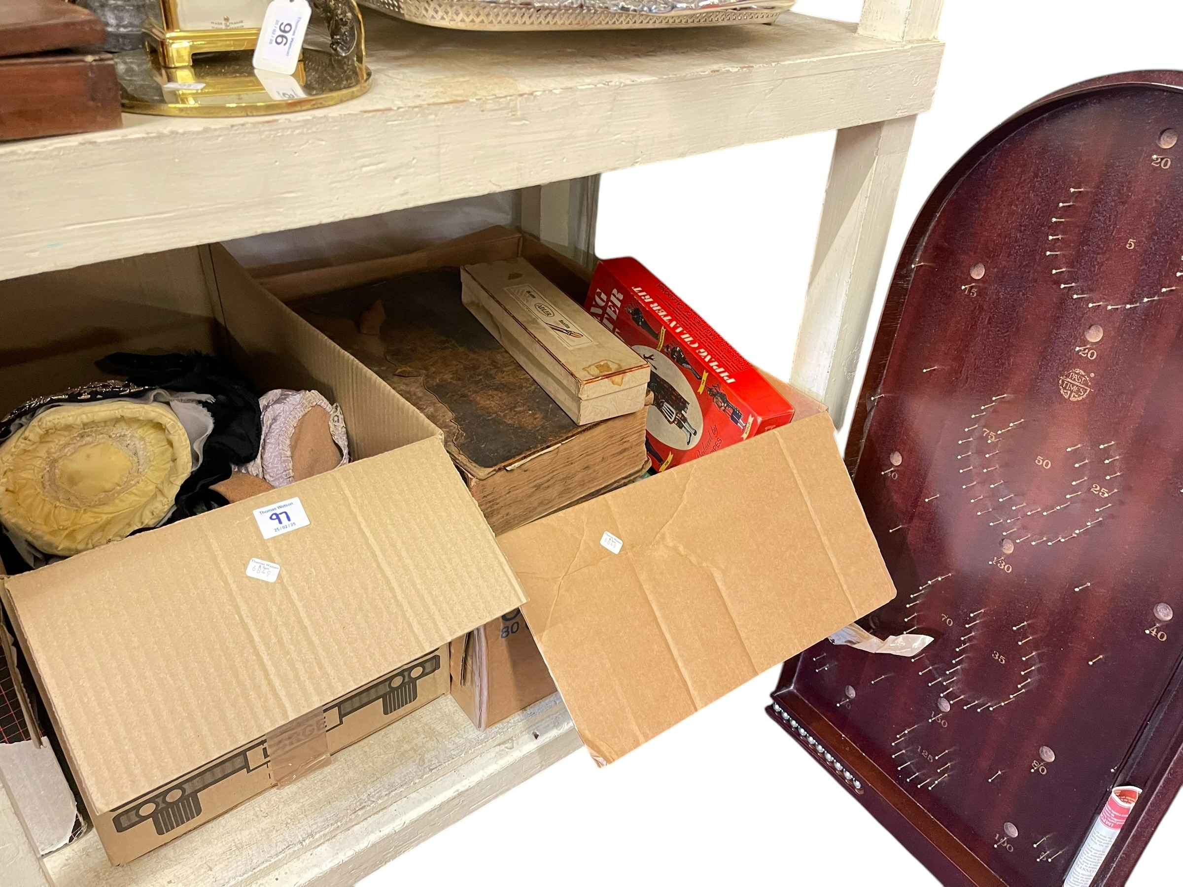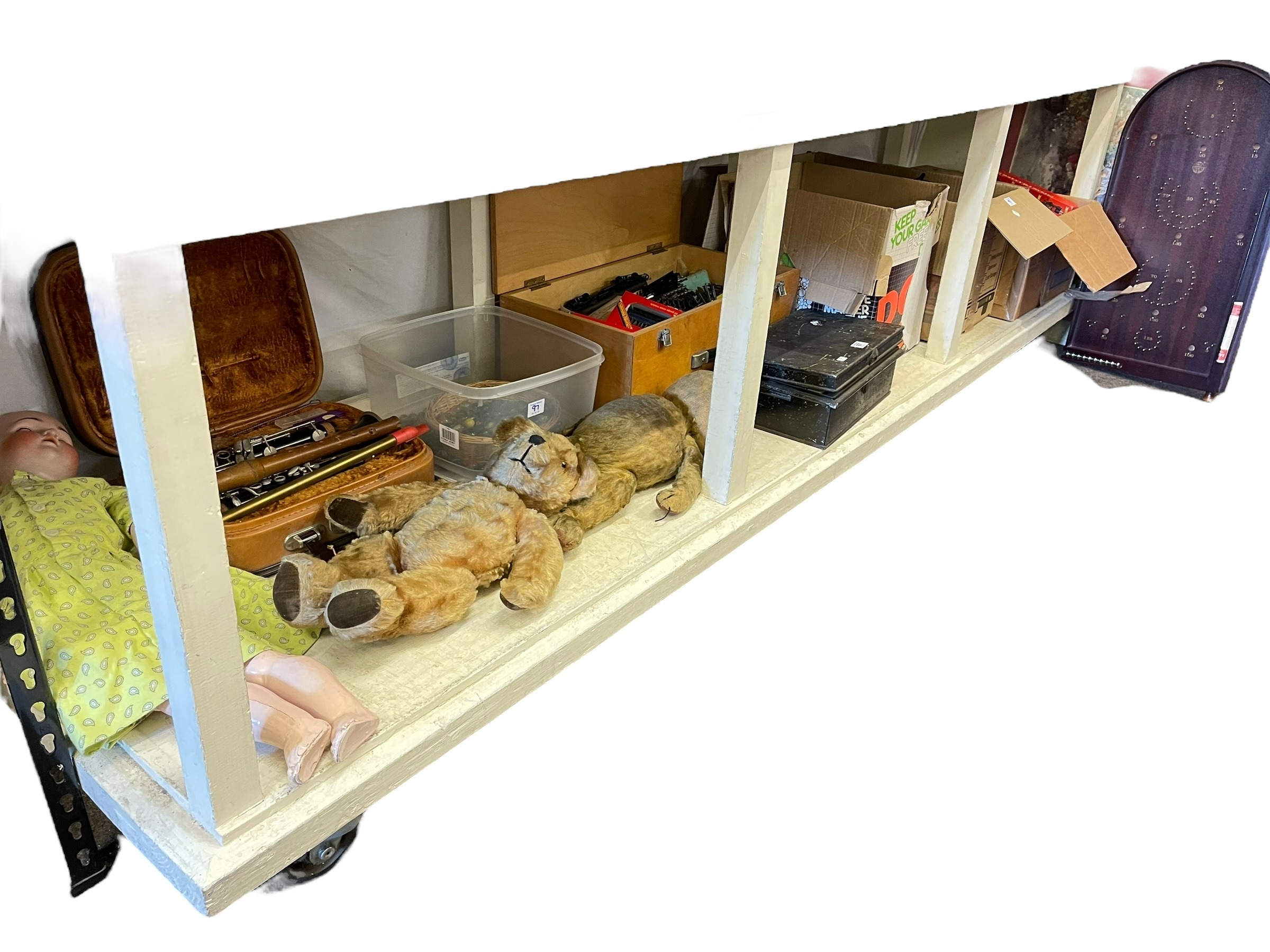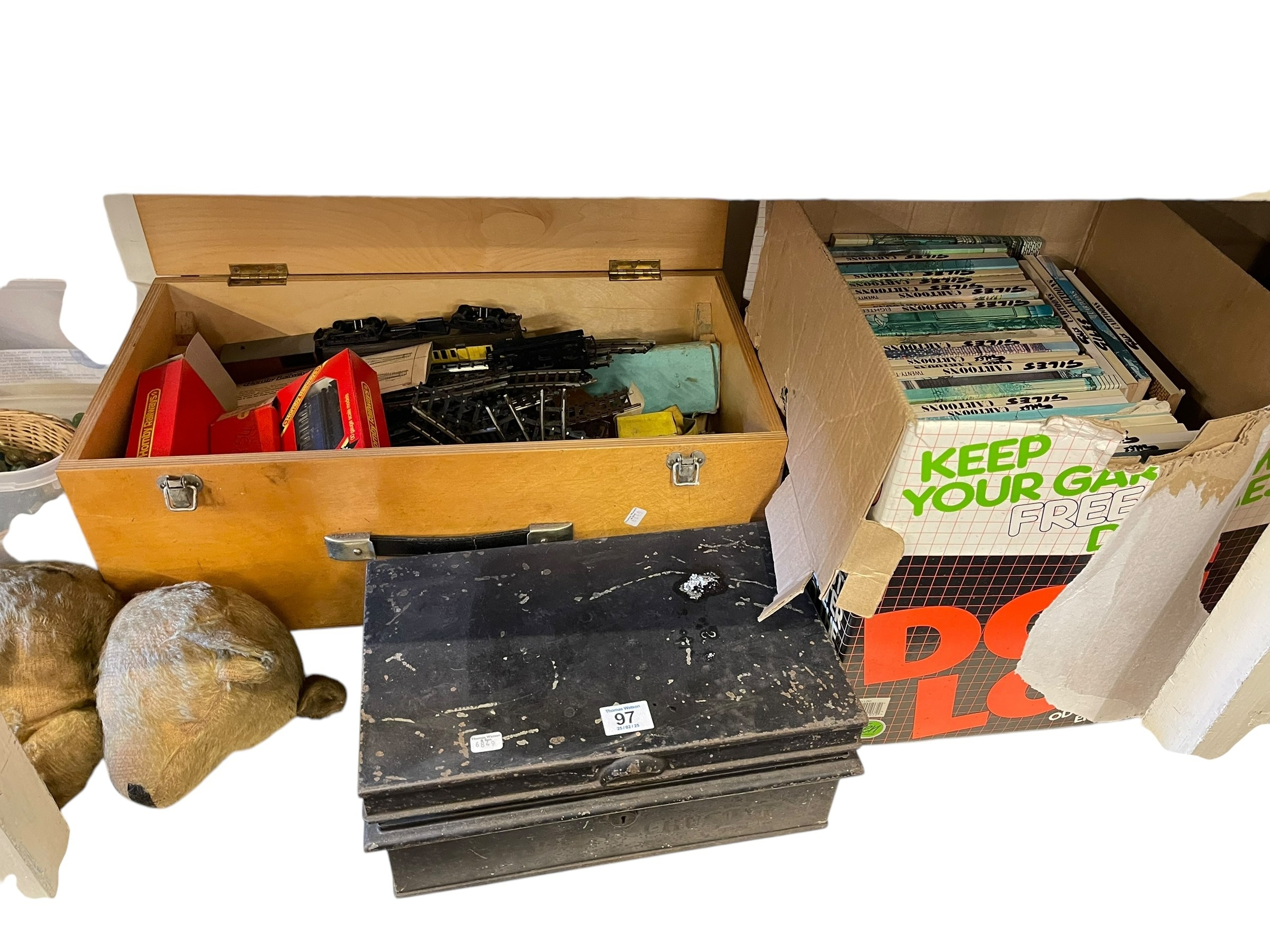 Collection of vintage toys and games, teddy bears, dolls, Giles books, marbles, bible, model railway, etc.