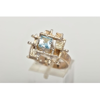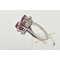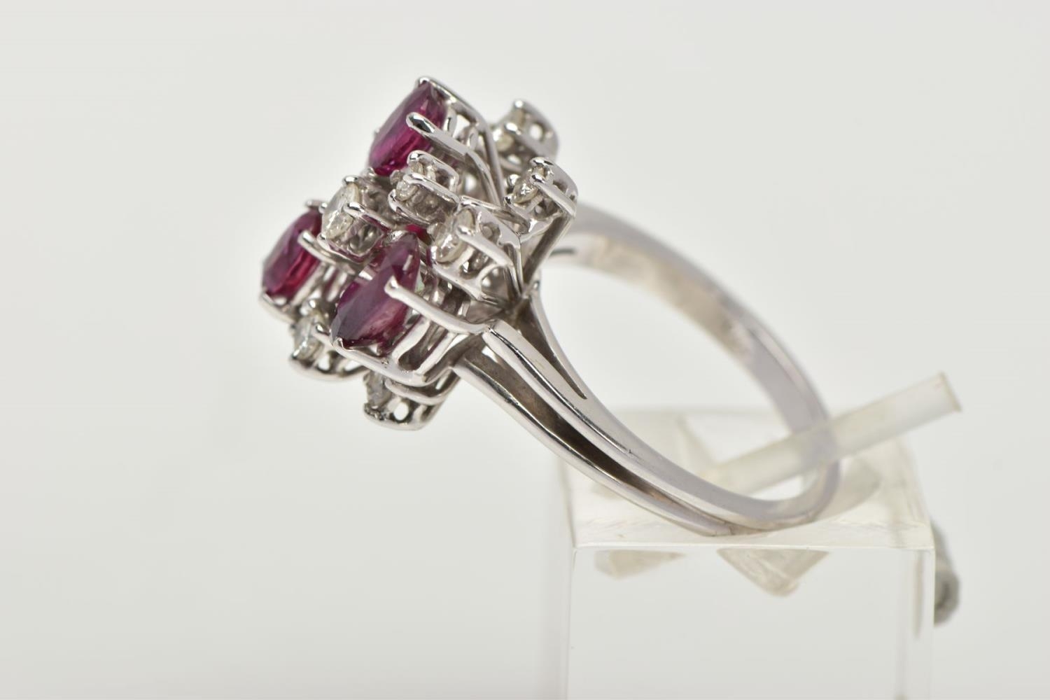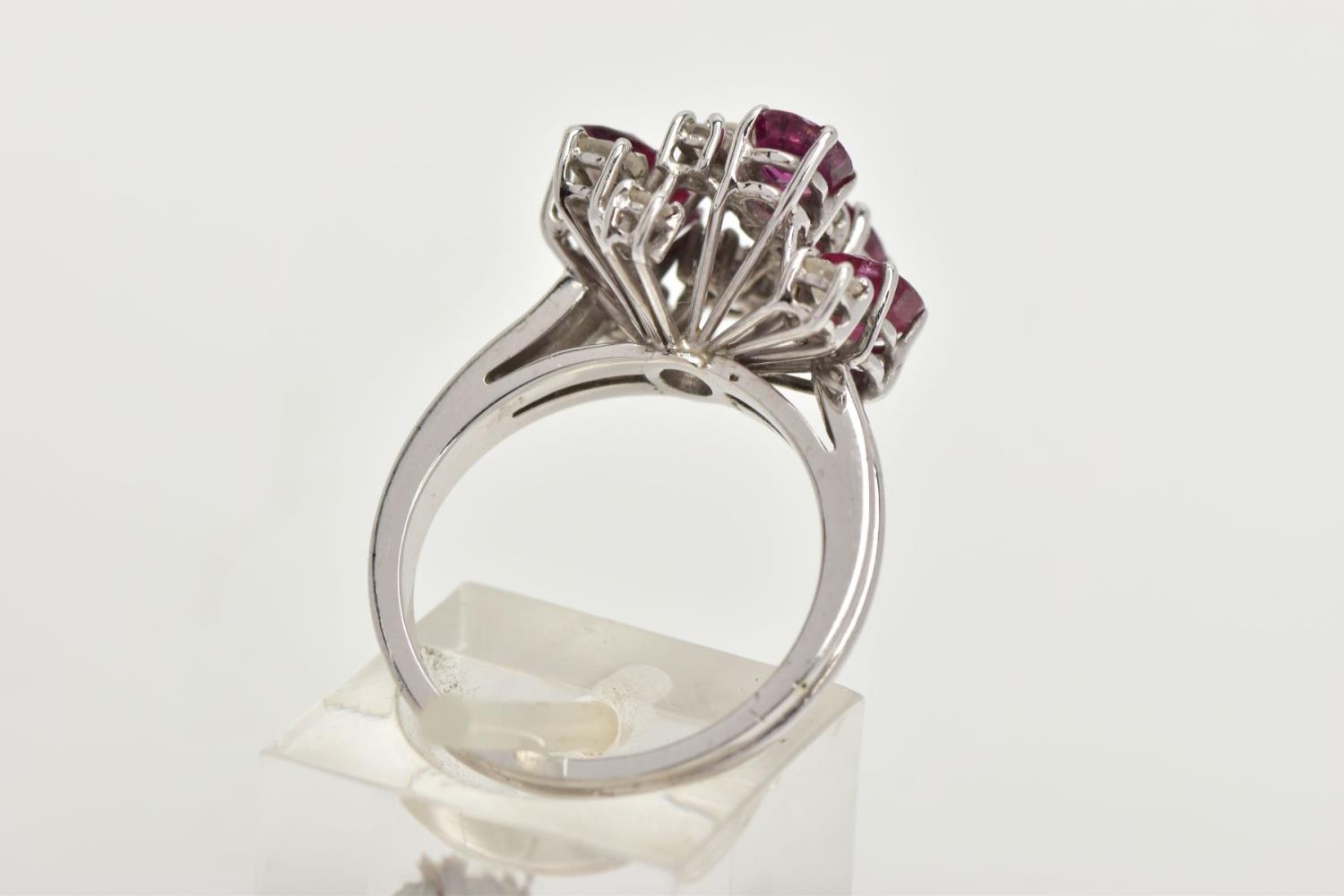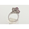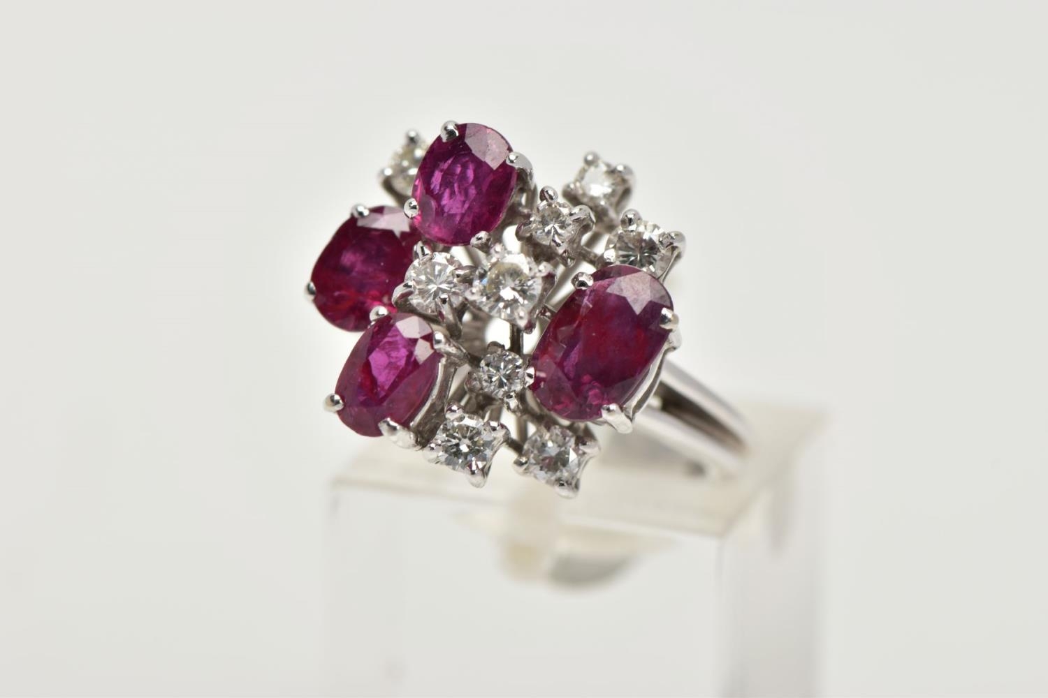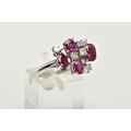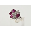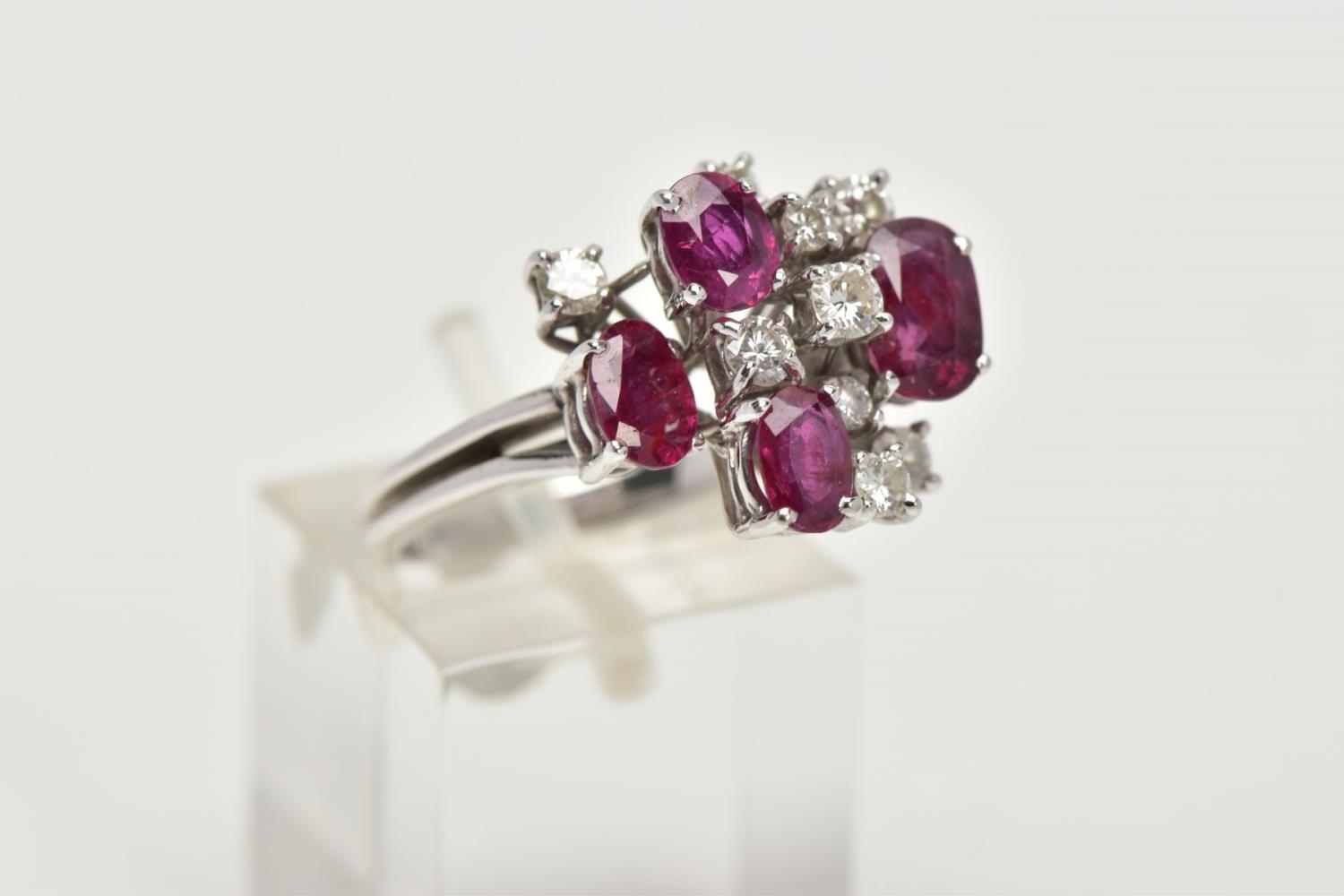 A WHITE METAL DIAMOND AND RUBY ABSTRACT DRESS RING, four oval cut rubies and nine round brilliant cut diamonds, estimated total diamond weight 0.60ct, prong set at different levels, leading onto white metal bifurcated shoulders, stamped 750, ring size N, approximate gross weight 6.3 grams (condition report: general moderate wear, possible treatment to rubies, would benefit from a gentle clean)