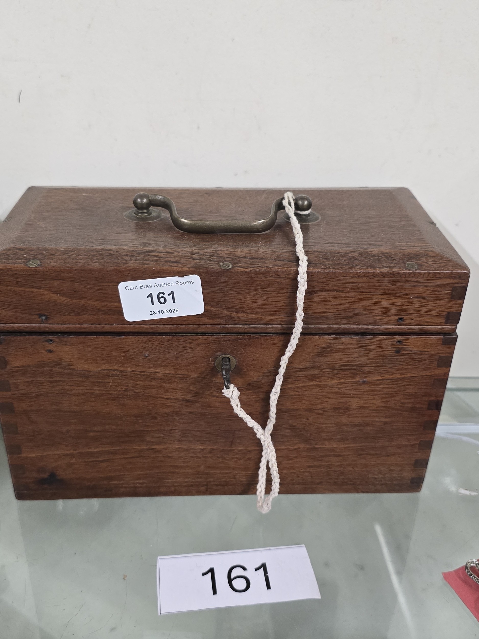 ANTIQUE MAHOGANY TEA CADDY WITH BRASS HANDLE AND KEY