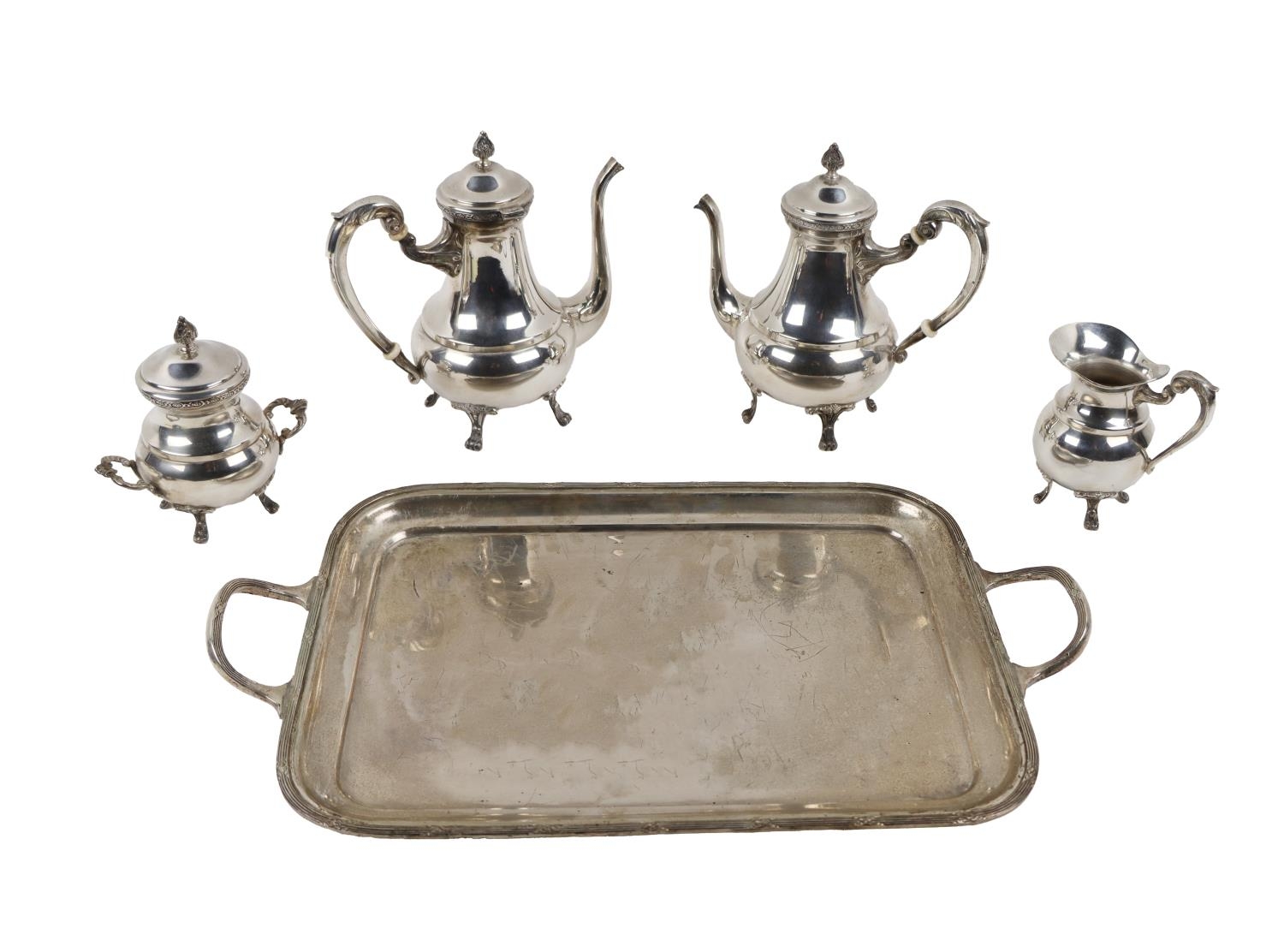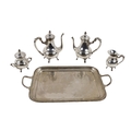An attractive 20th Century four piece silver Egyptian Tea & Coffee Service, with decorative finials and ornate borders, scroll handles, each on paw feet; together with a matching Serving Tray, approx. 3.8kg. (5)