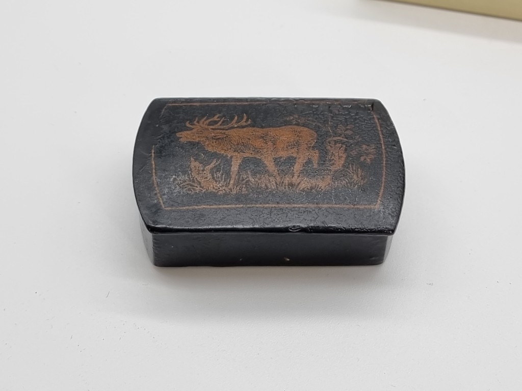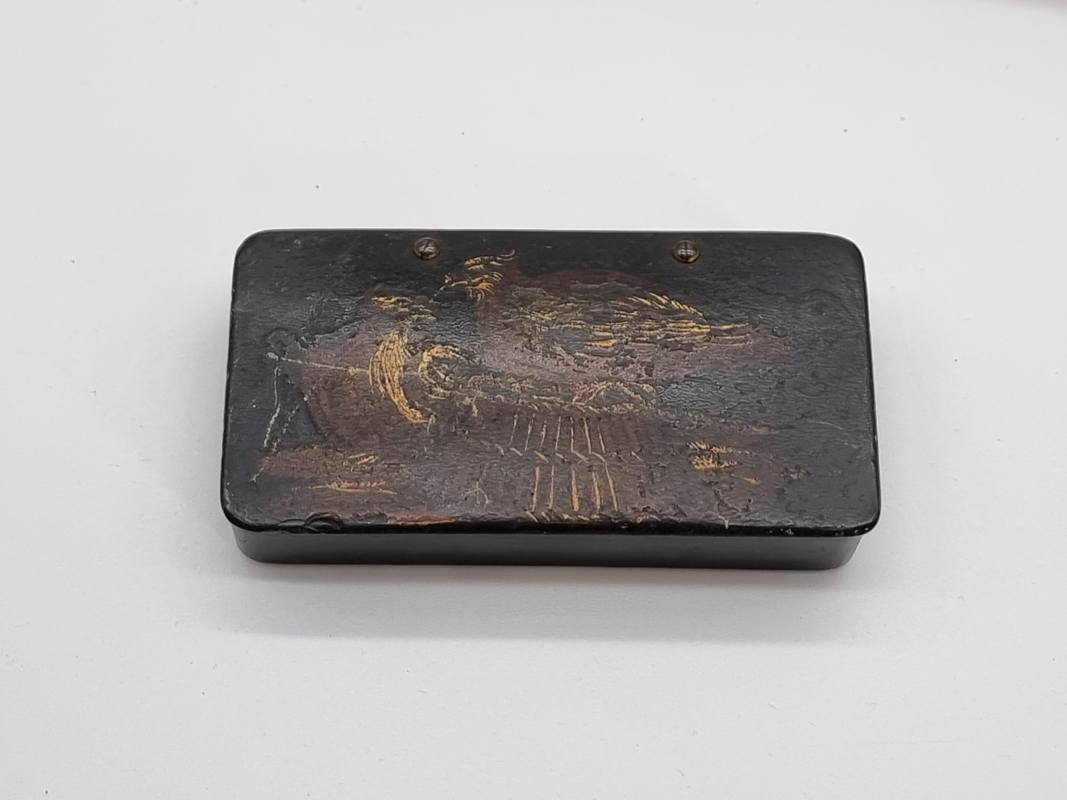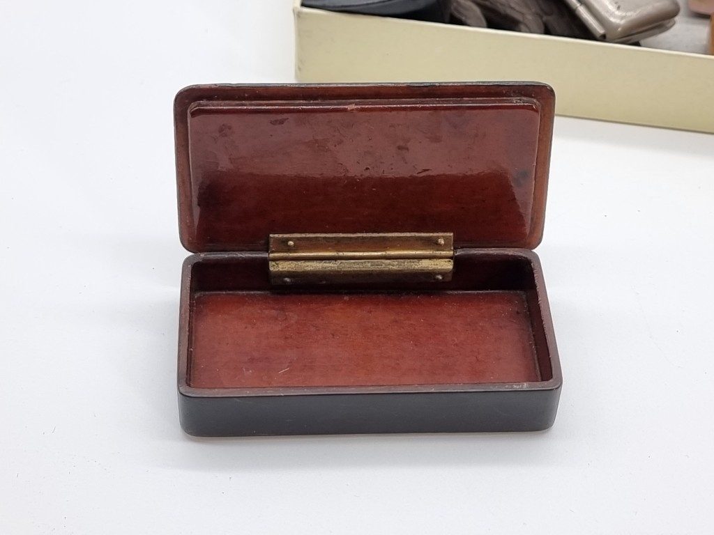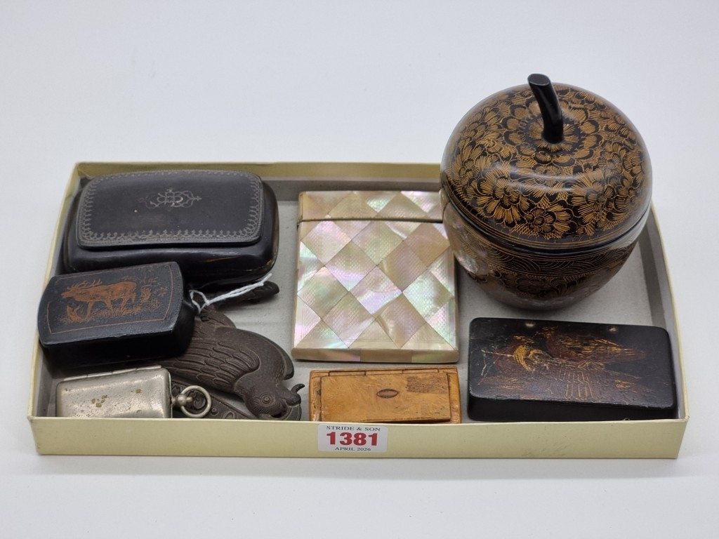 A mixed group of works of art, to include Georgian papier mache snuff boxes; and a Victorian mother-of-pearl card case. (8)