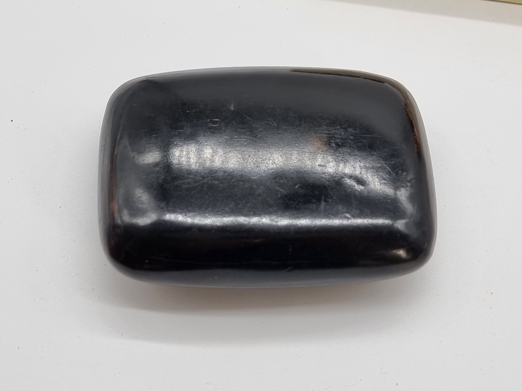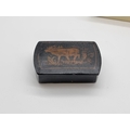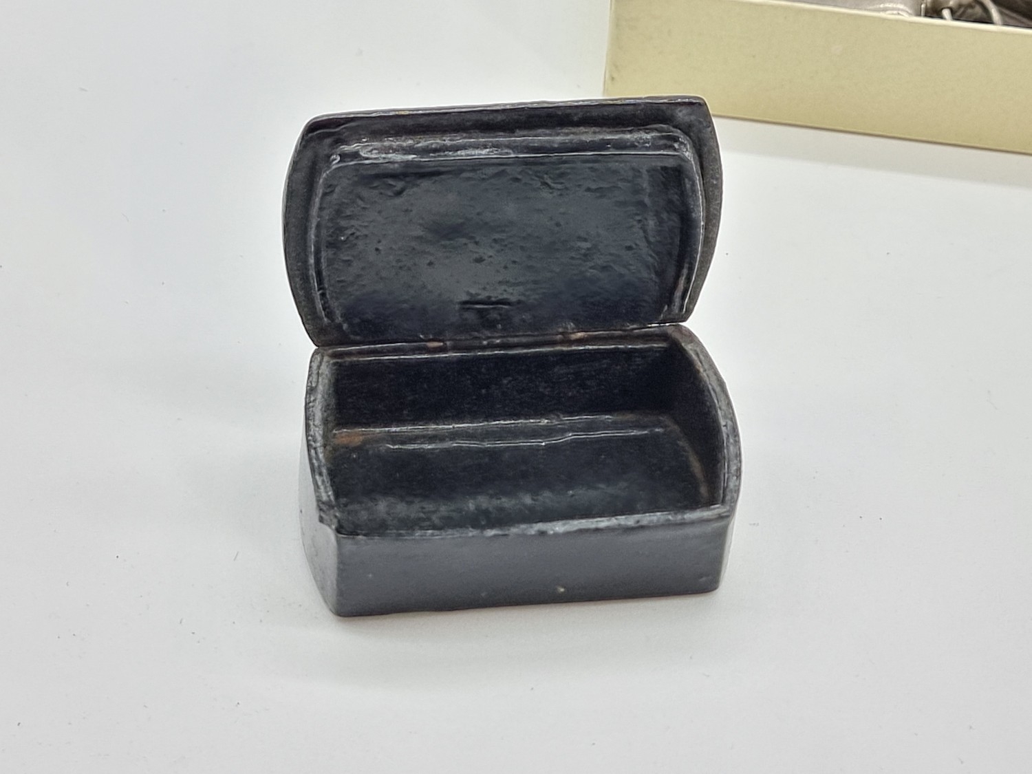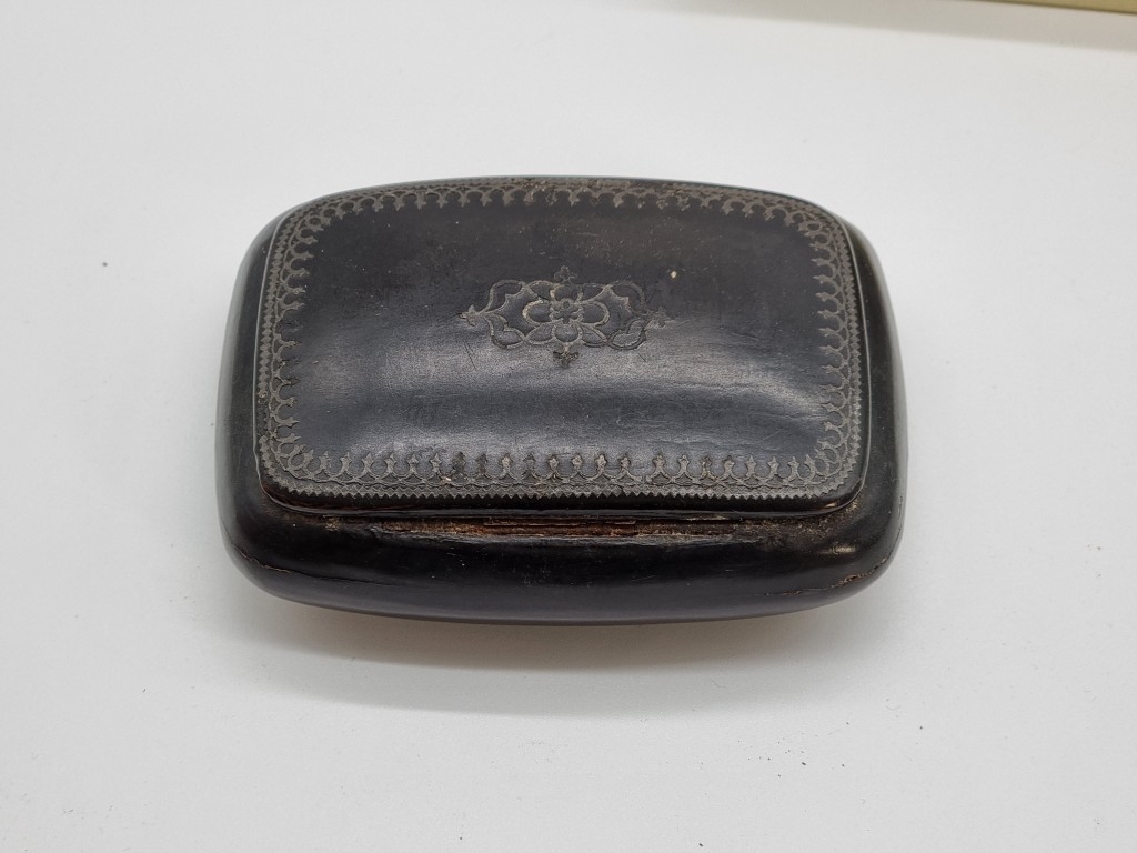 A mixed group of works of art, to include Georgian papier mache snuff boxes; and a Victorian mother-of-pearl card case. (8)