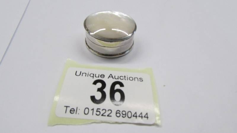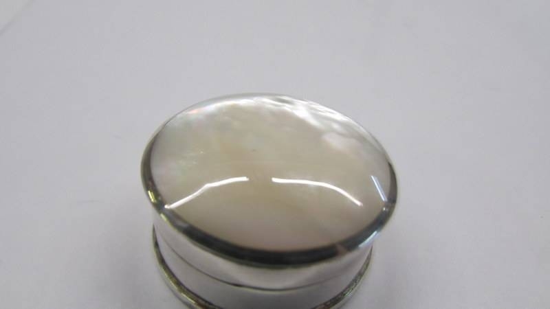 A silver and mother of pearl pill box.