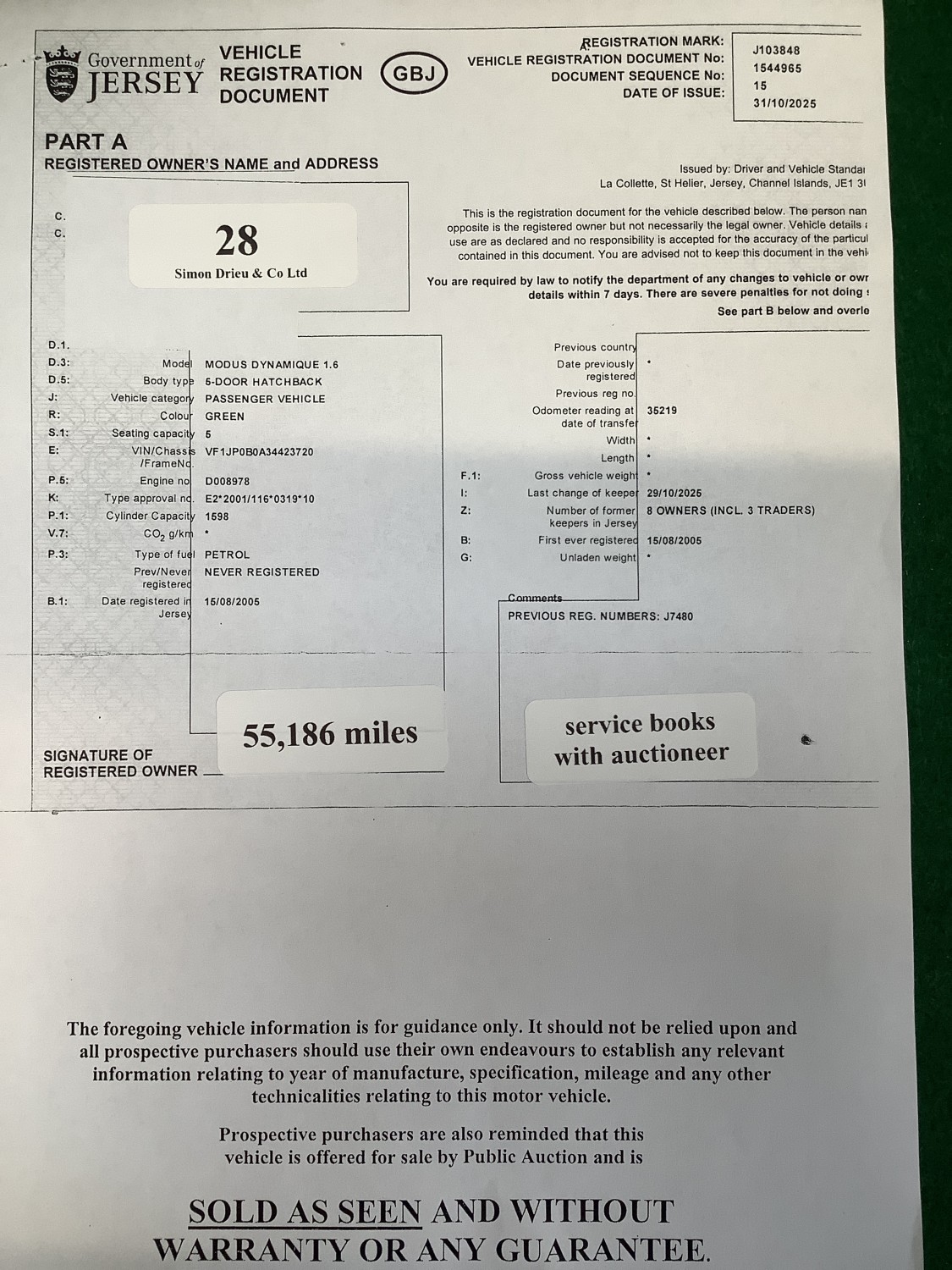 A 2005 Renault Modus Dynamique 1.6 five door hatchback J103848 (petrol/automatic), odometer reading 55,186 miles