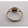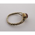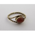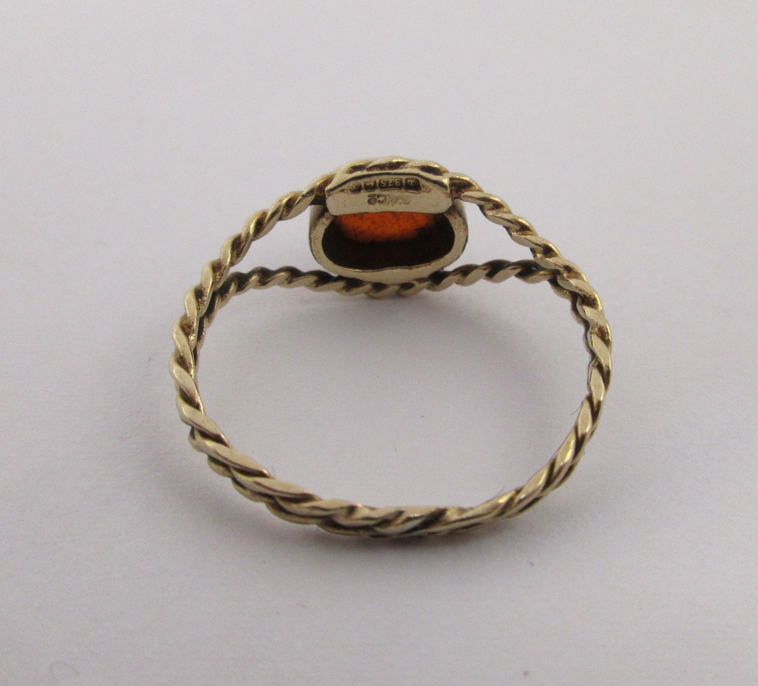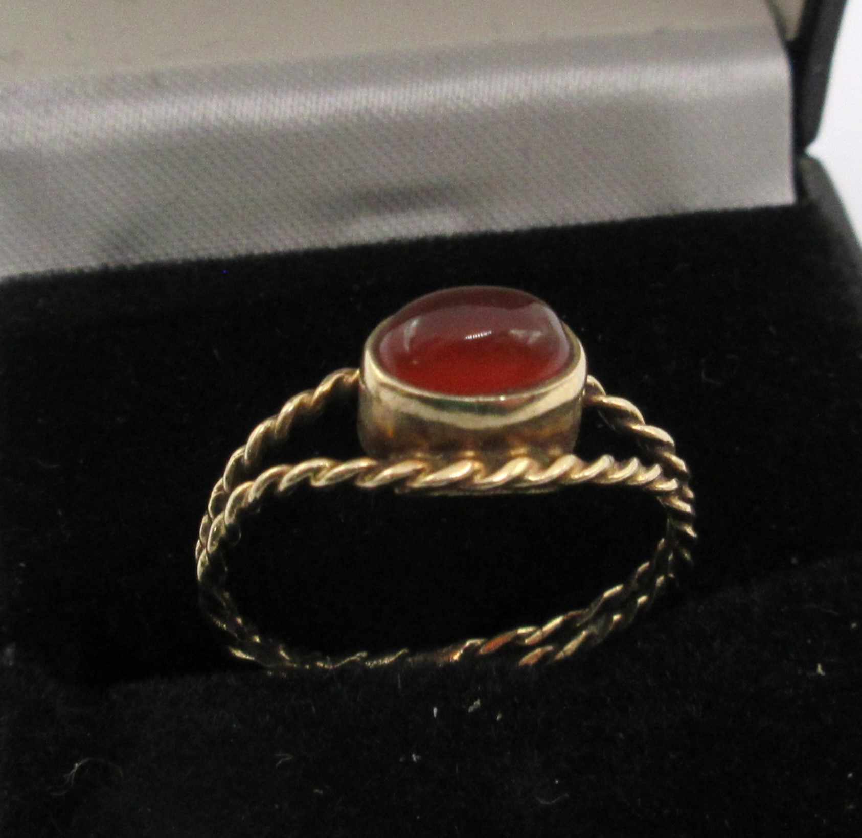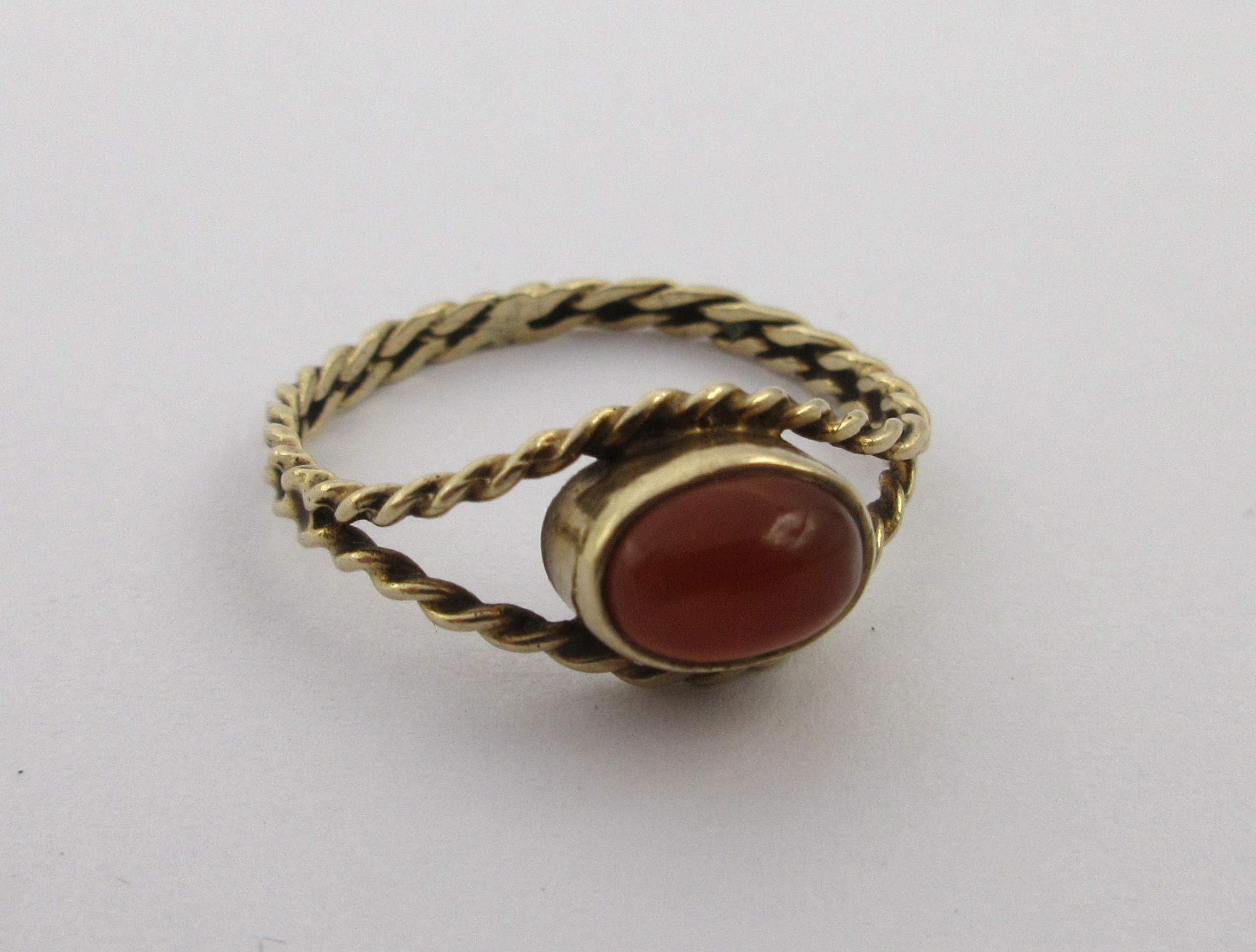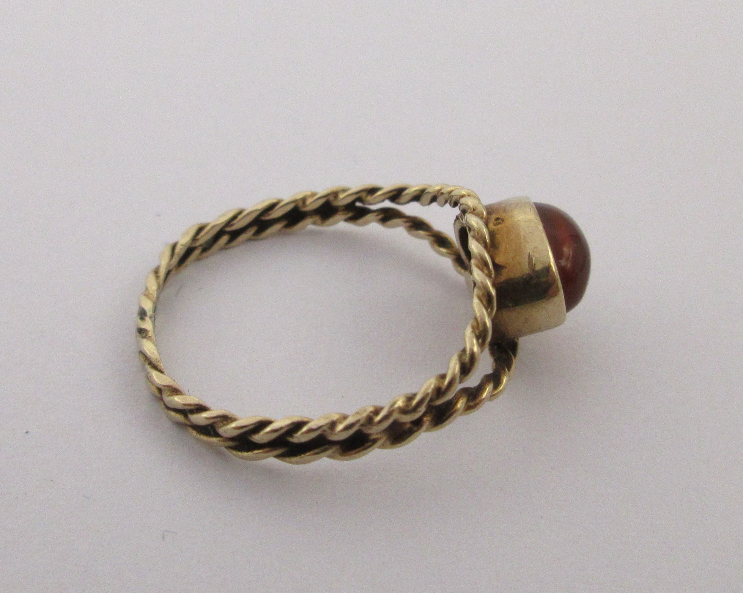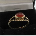 A distinctive rope twist 9 carat gold ring set with an oval carnelian in a bezel setting. British hallmarks, ring size M,