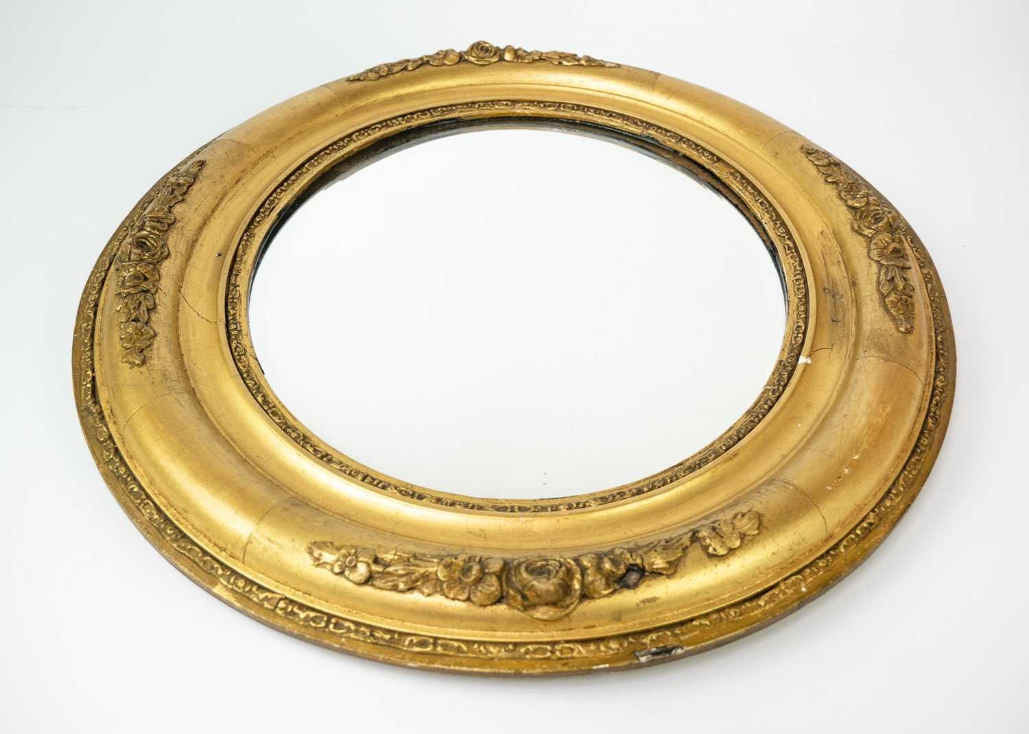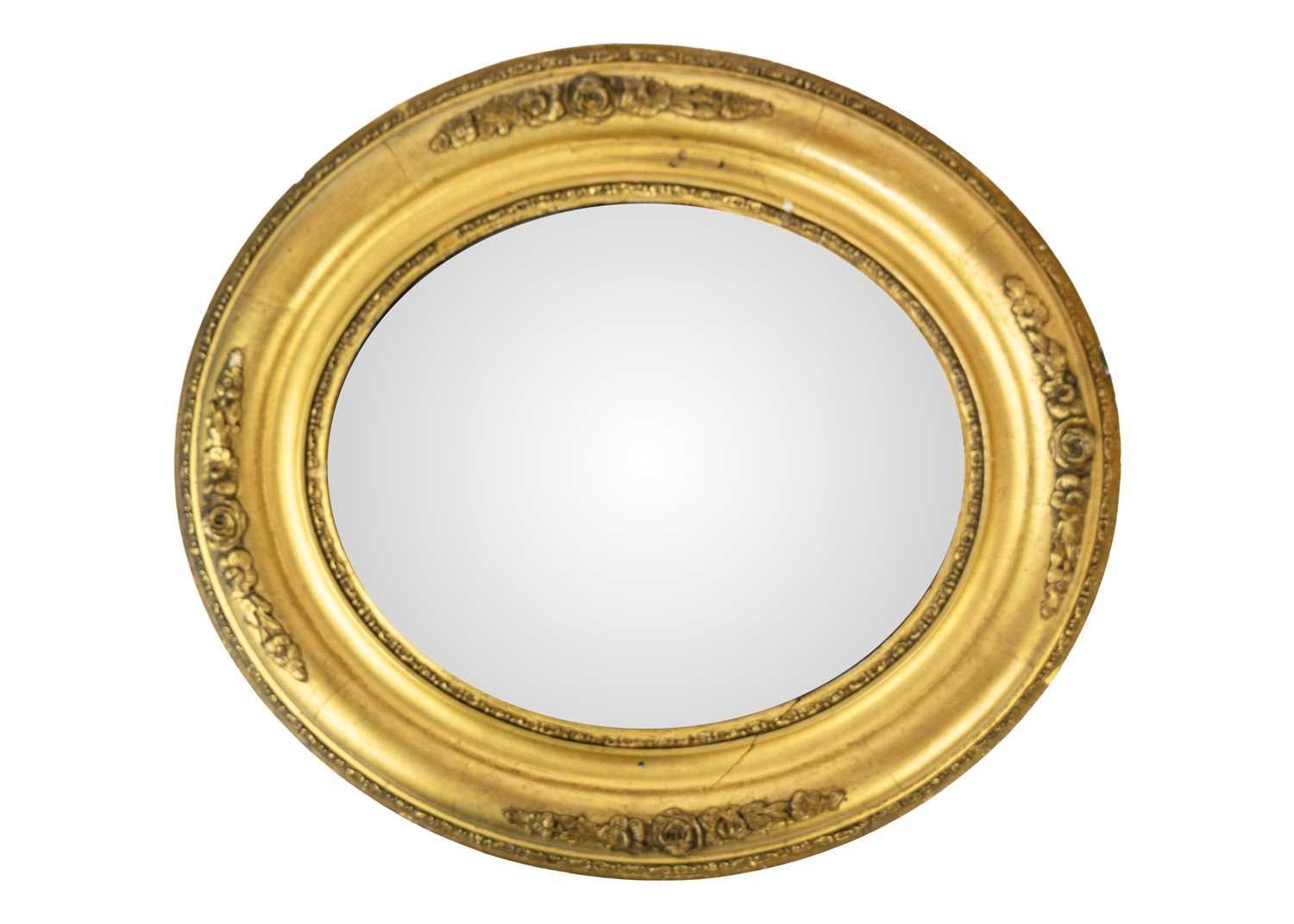 An Edwardian small oval gilt gesso wall mirror. The moulded frame applied with flowers and foliates, 43X39cm.