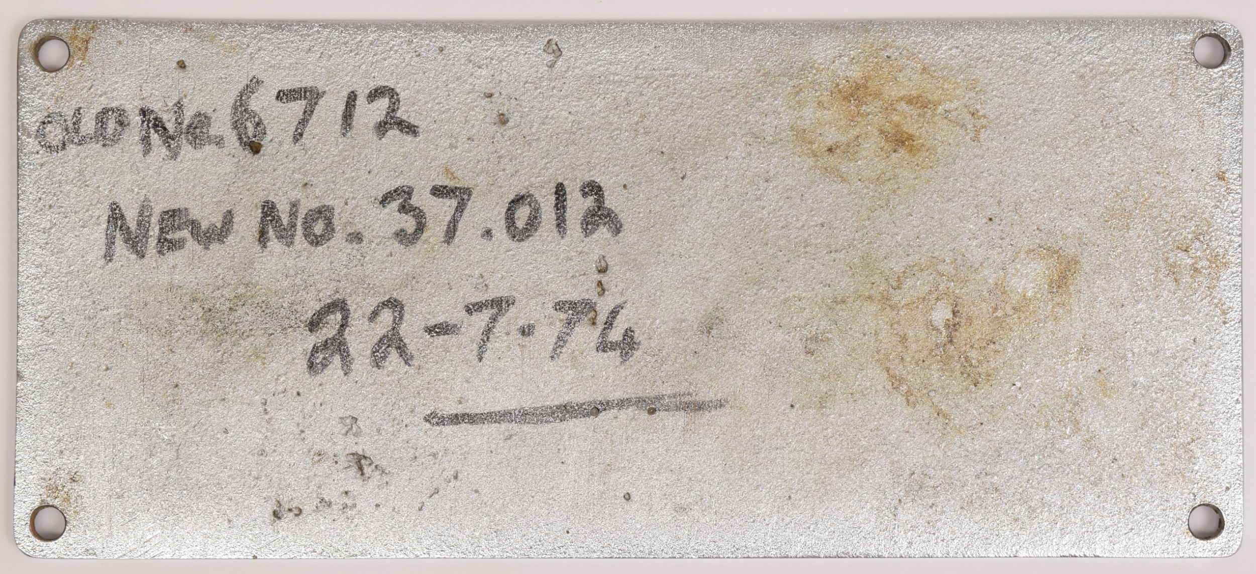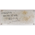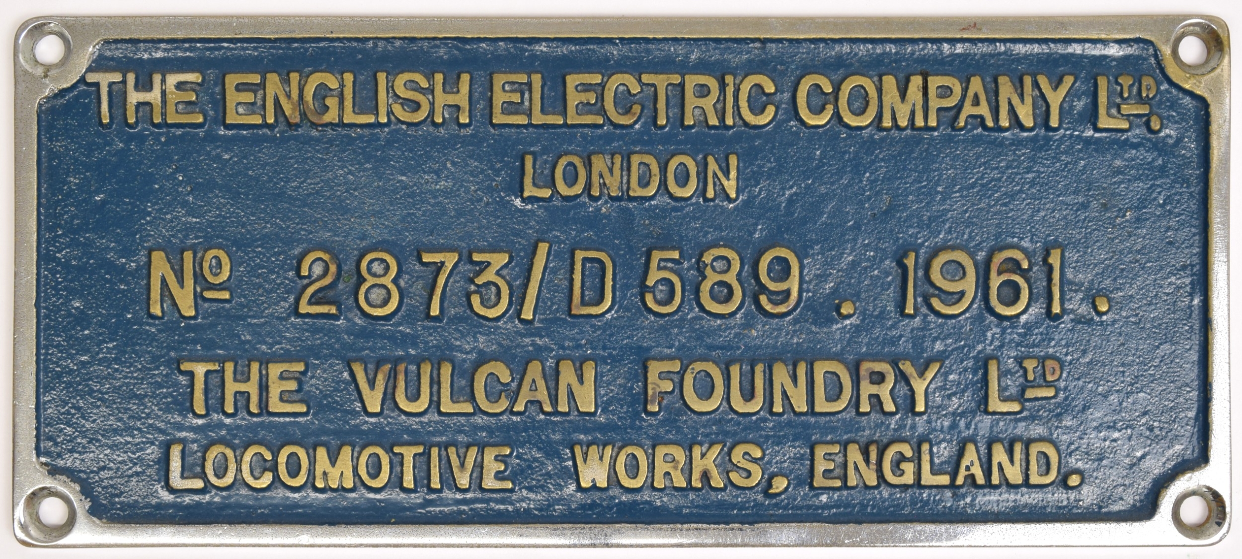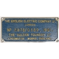 Worksplate, THE ENGLISH ELECTRIC COMPANY LIMITED LONDON No 2873/ D589 1961 THE VULCAN FOUNDRY LTD LOCOMOTIVE WORKS ENGLAND. This from class 37, D6712, 37012, named LOCH RANNOCH from 1982-6. New to Stratford, allocations included; Thornaby, Gateshead, March and Motherwell. Withdrawn in March 2003, and cut up five months later, by Sims. Front repainted, rear cleaned. According to our records, a plate from this locomotive has not been in auction before. Chromed brass, 1/8 x 4 7/16 inches. Shipping band - B.