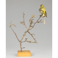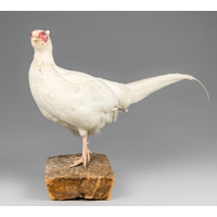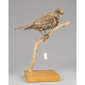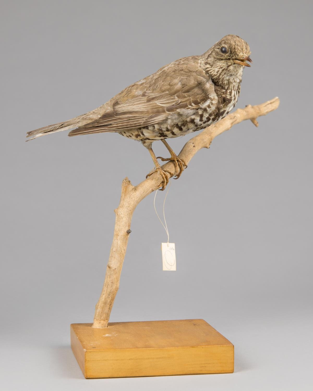 AN EARLY 20TH CENTURY TAXIDERMY MISTLE THRUSH UPON BRANCH WITH POLISHED WOODEN BASE. (h 32cm)