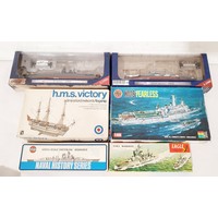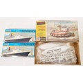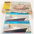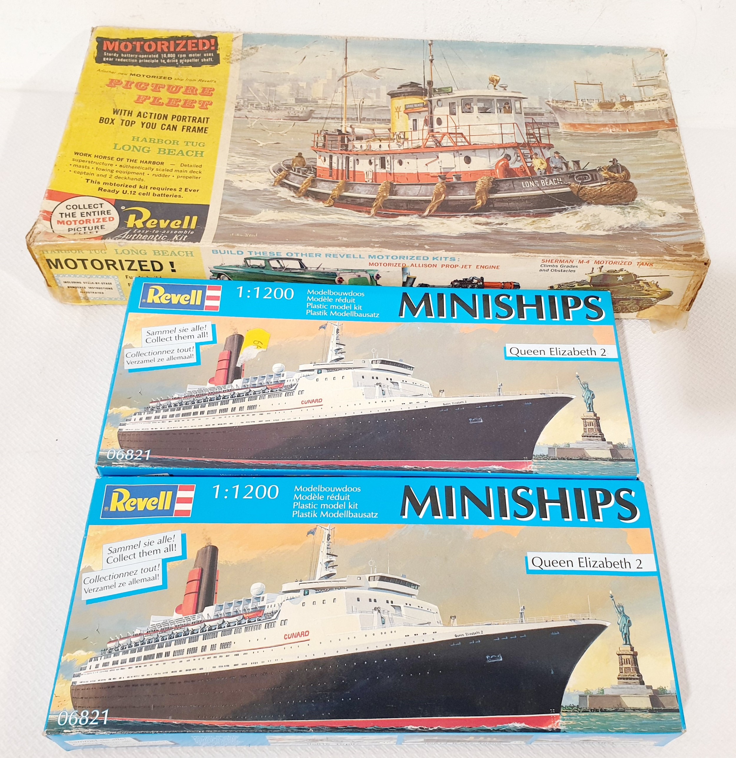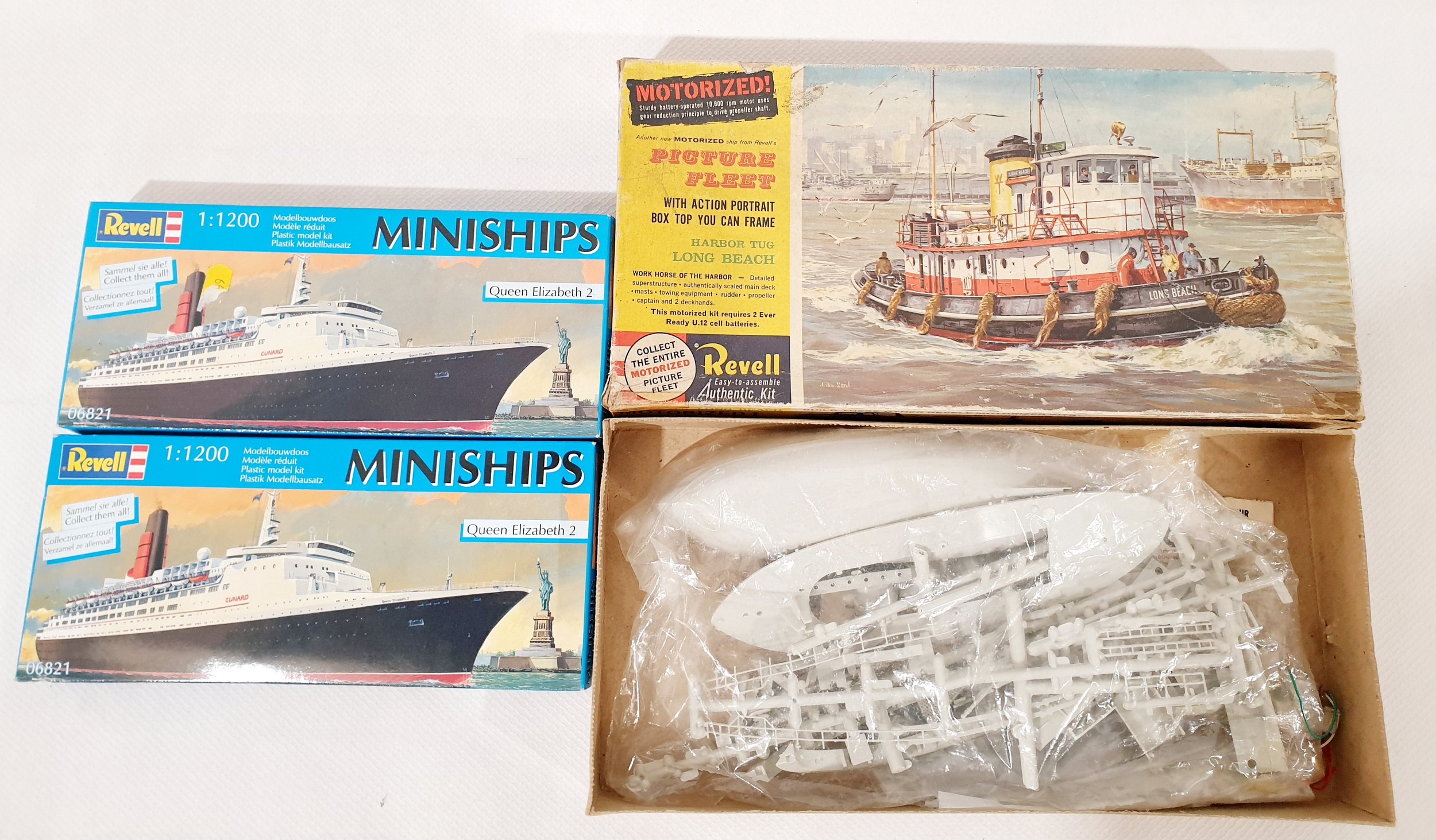 A Revell 1:108 scale model kit 'Harbour Tug Long Beach' and two Revell 1:1200 'Queen Elizabeth 2' miniship models.