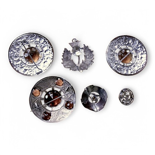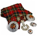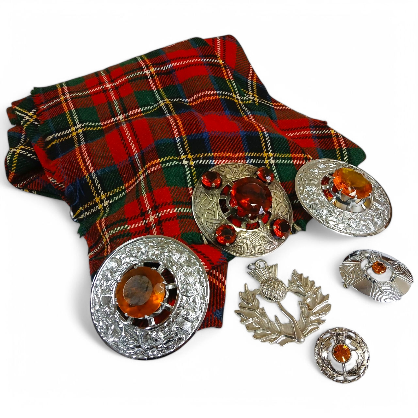 A Scottish tartan plaid together with five plaid brooches and badges. Shipping group (A).