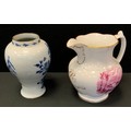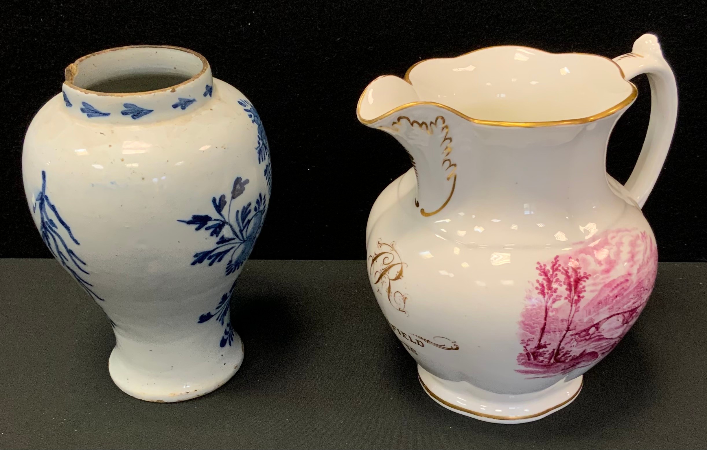 A 19th century Staffordshire jug, initialled R, Mansfield Notts, transfer printed with Ironbridge Shropshire; a Dutch delft jar (2)