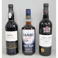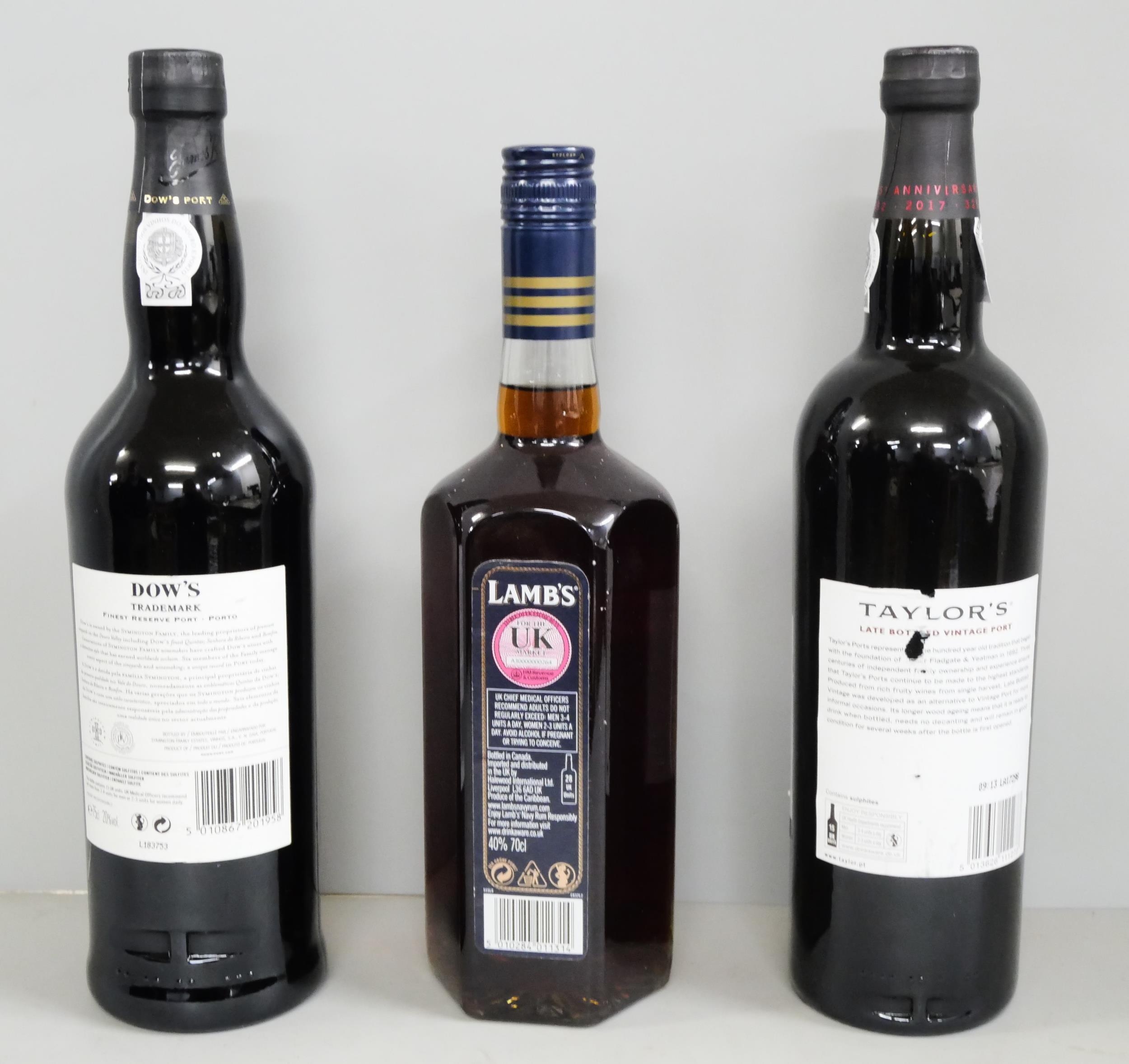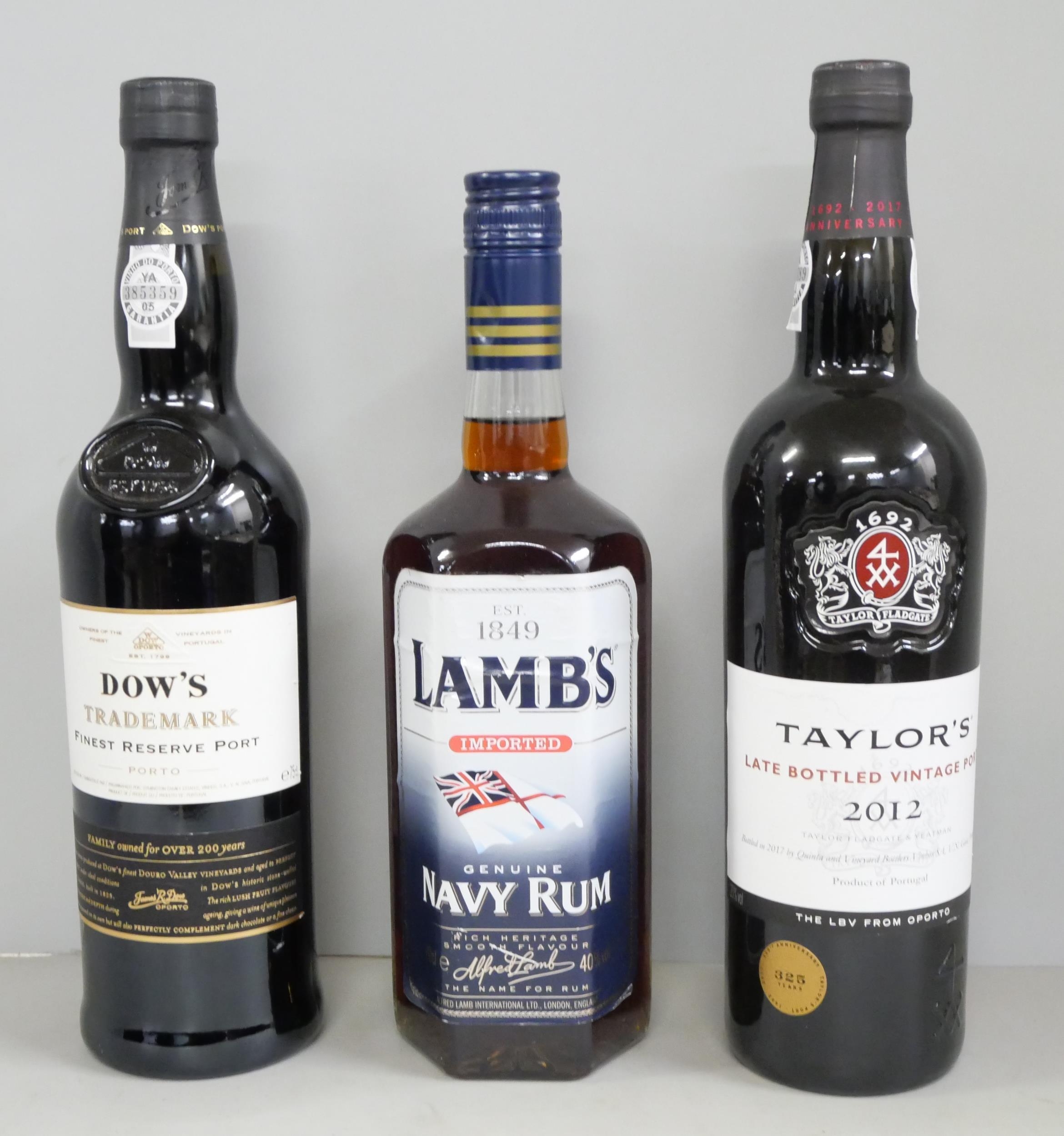 Two bottles of Port, Dow's Trademark Reserve and Taylor's bottled Vintage 2012 and a bottle of Lamb's Navy Rum **PLEASE NOTE THIS LOT IS NOT ELIGIBLE FOR IN-HOUSE POSTING AND PACKING**
