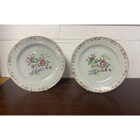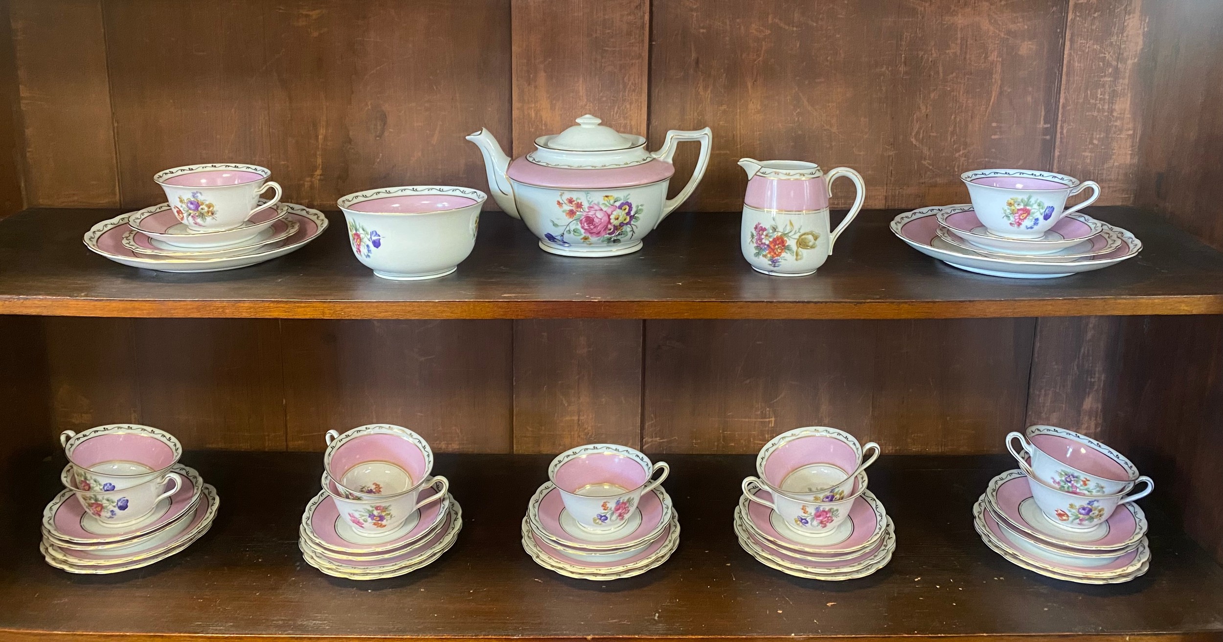 A vintage tea set, each piece transfer decorated with flowers in a pink and gilded border -