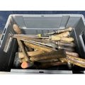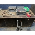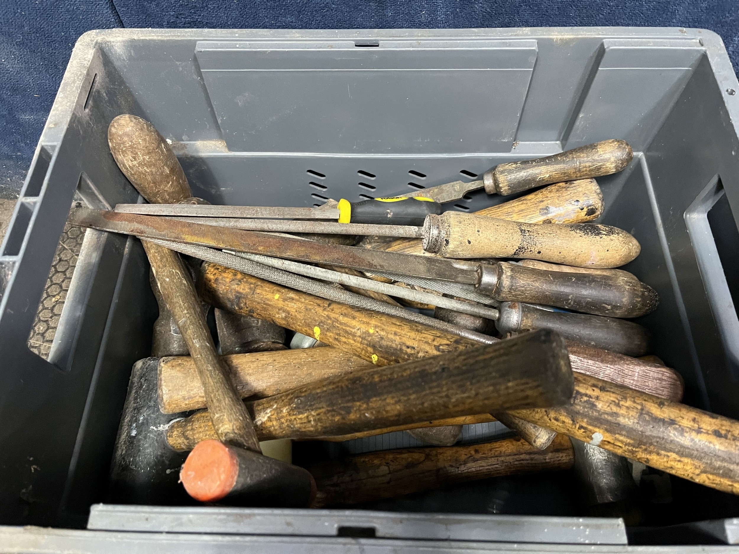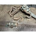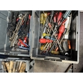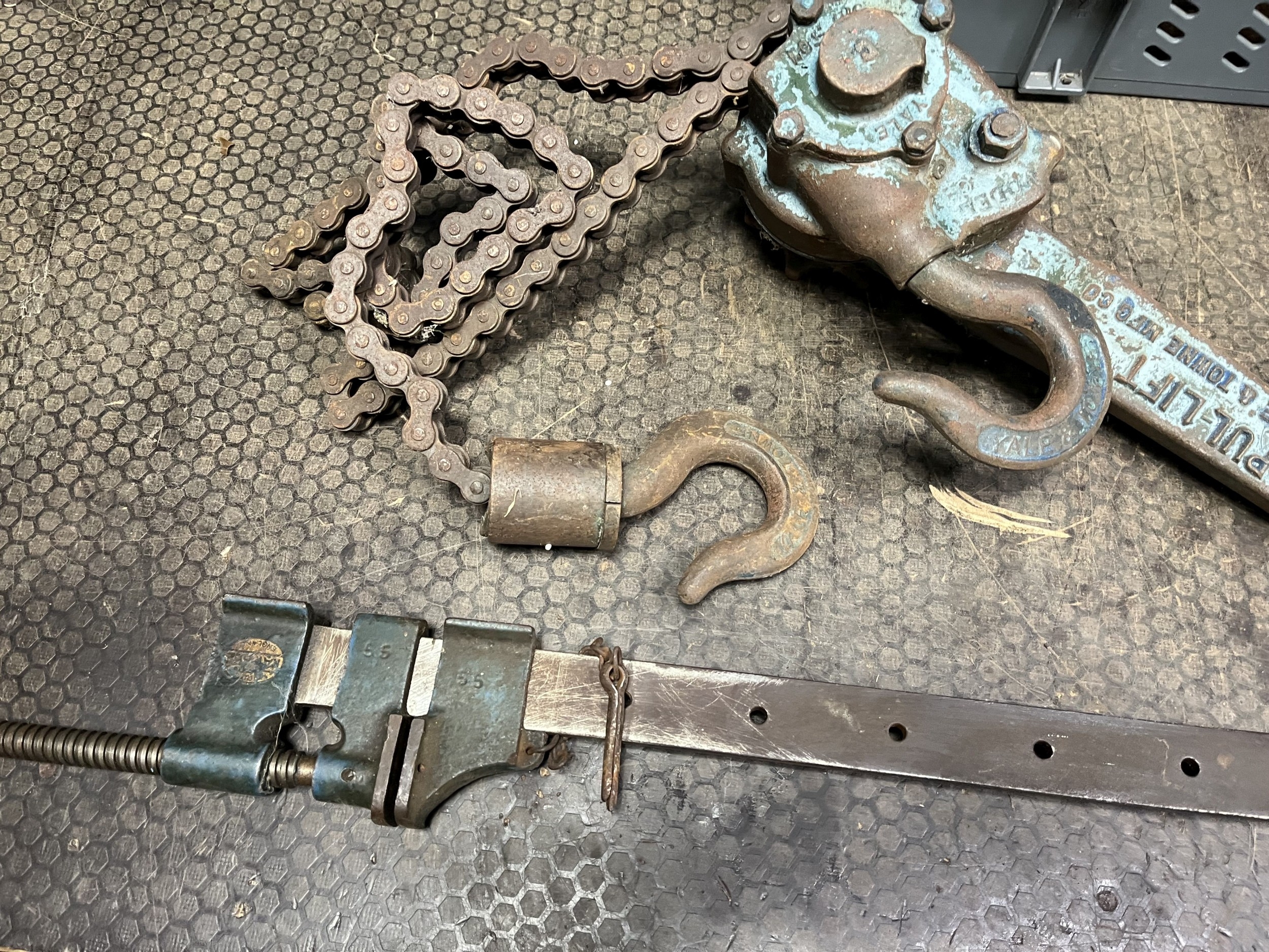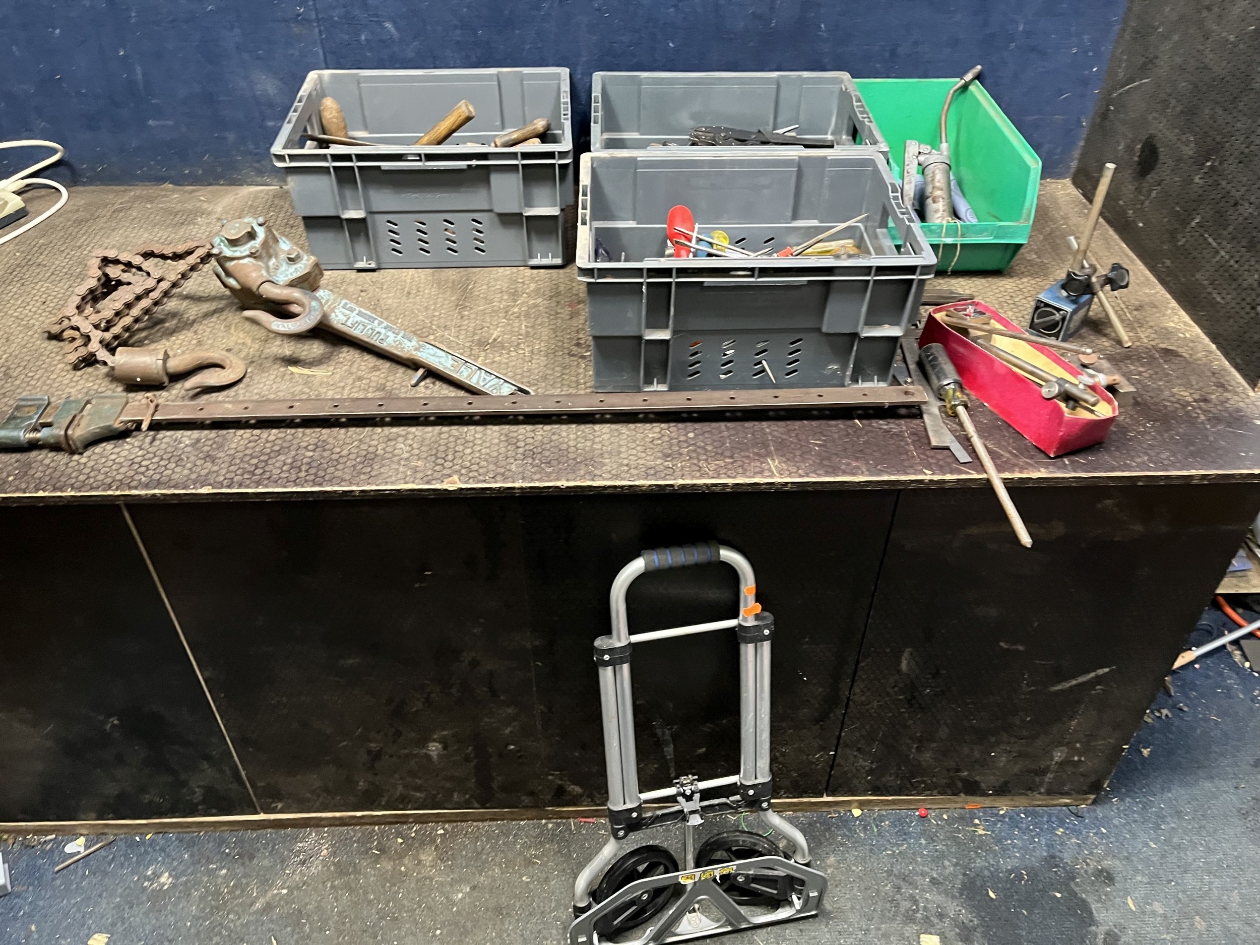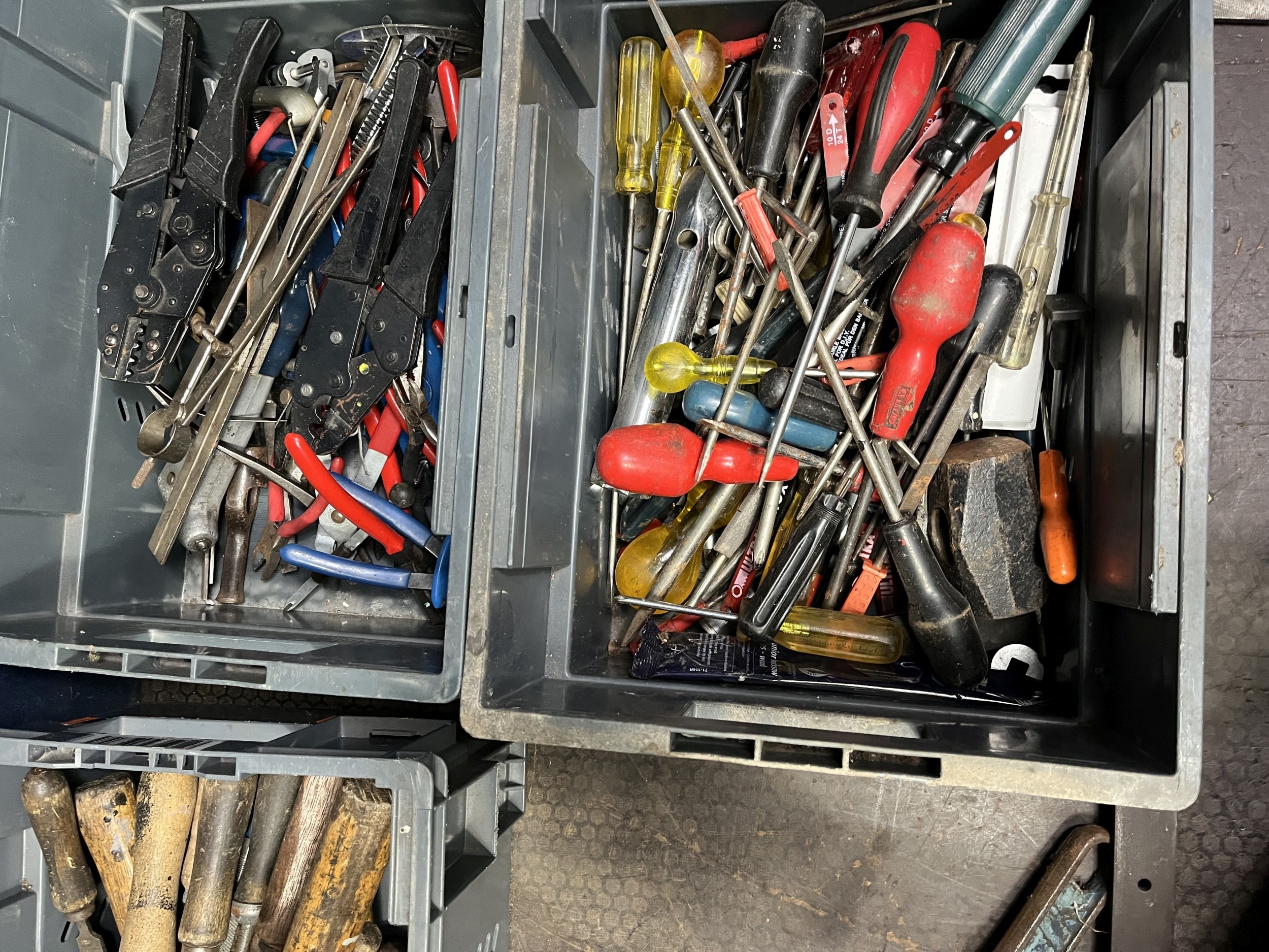 FOUR TRAYS CONTAINING TOOLS, including a Yale Pul-Lift, magnetic and adjustable marking stands, a sash cramp, crimping pliers, filers, mallets etc