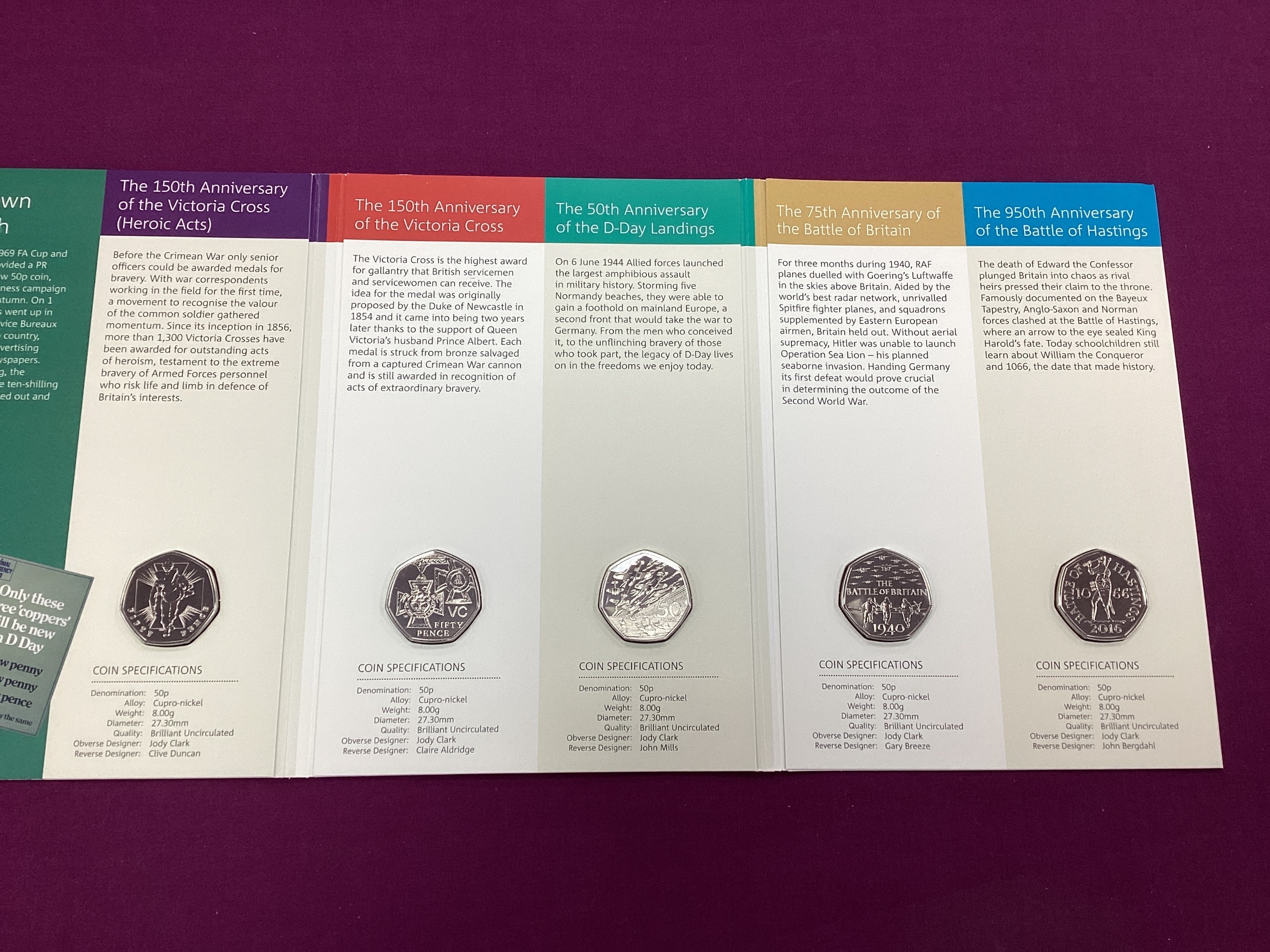 2019 Royal Mint 'Celebrating 50 Years Of The 50p' British Military Set, together with a Royal Mint 'A Year to Remember' collection of coins minted in 1964, both cased.