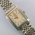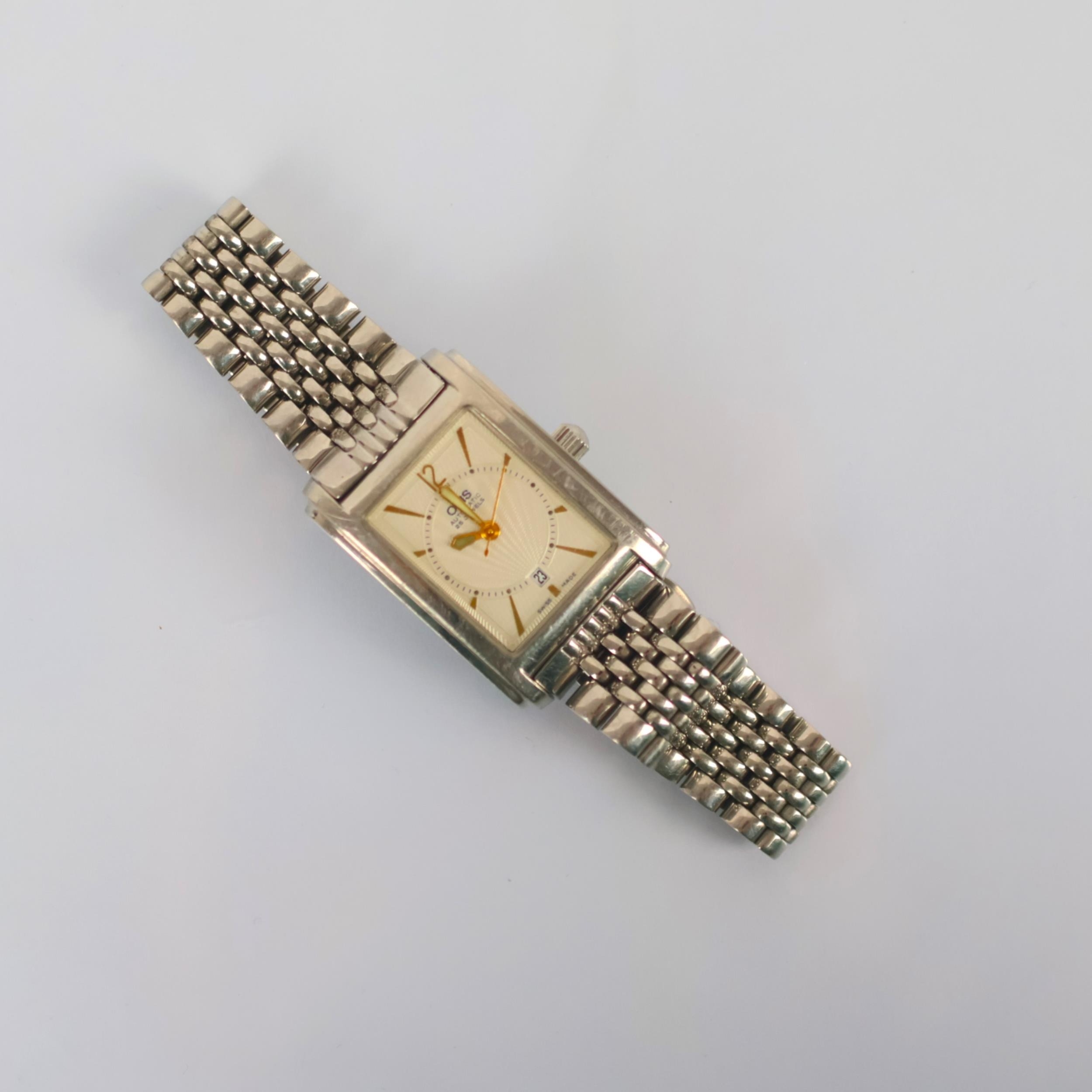 A ladies Oris automatic wristwatch, the rectangular dial with baton and Arabic numerals, date aperture to 6 o'clock, set to plain polished case with 'Oris' stamp to reverse' 3.5cm long, upon integral brick link bracelet, gross weight 59gms (including movement and bracelet)