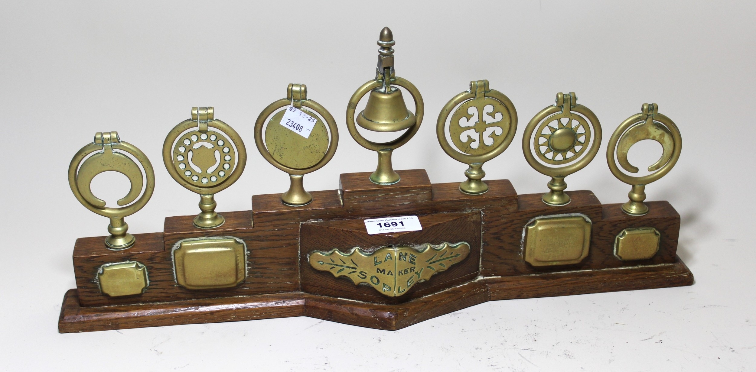 Group of seven Shire horse swingers mounted on a manufacturers display stand, Lane of Sopley