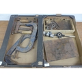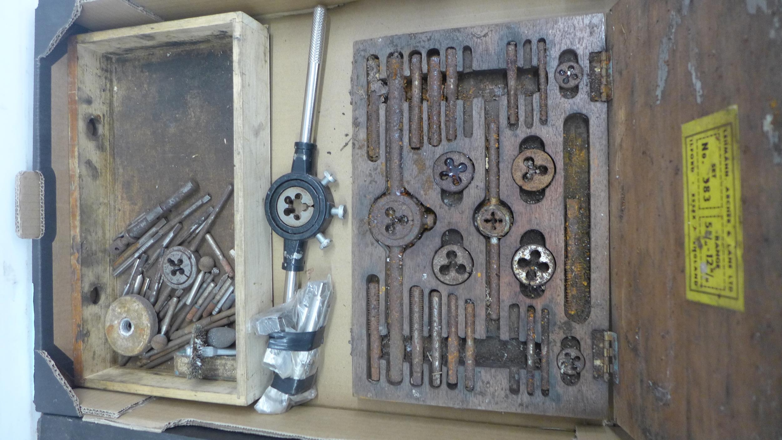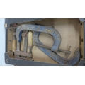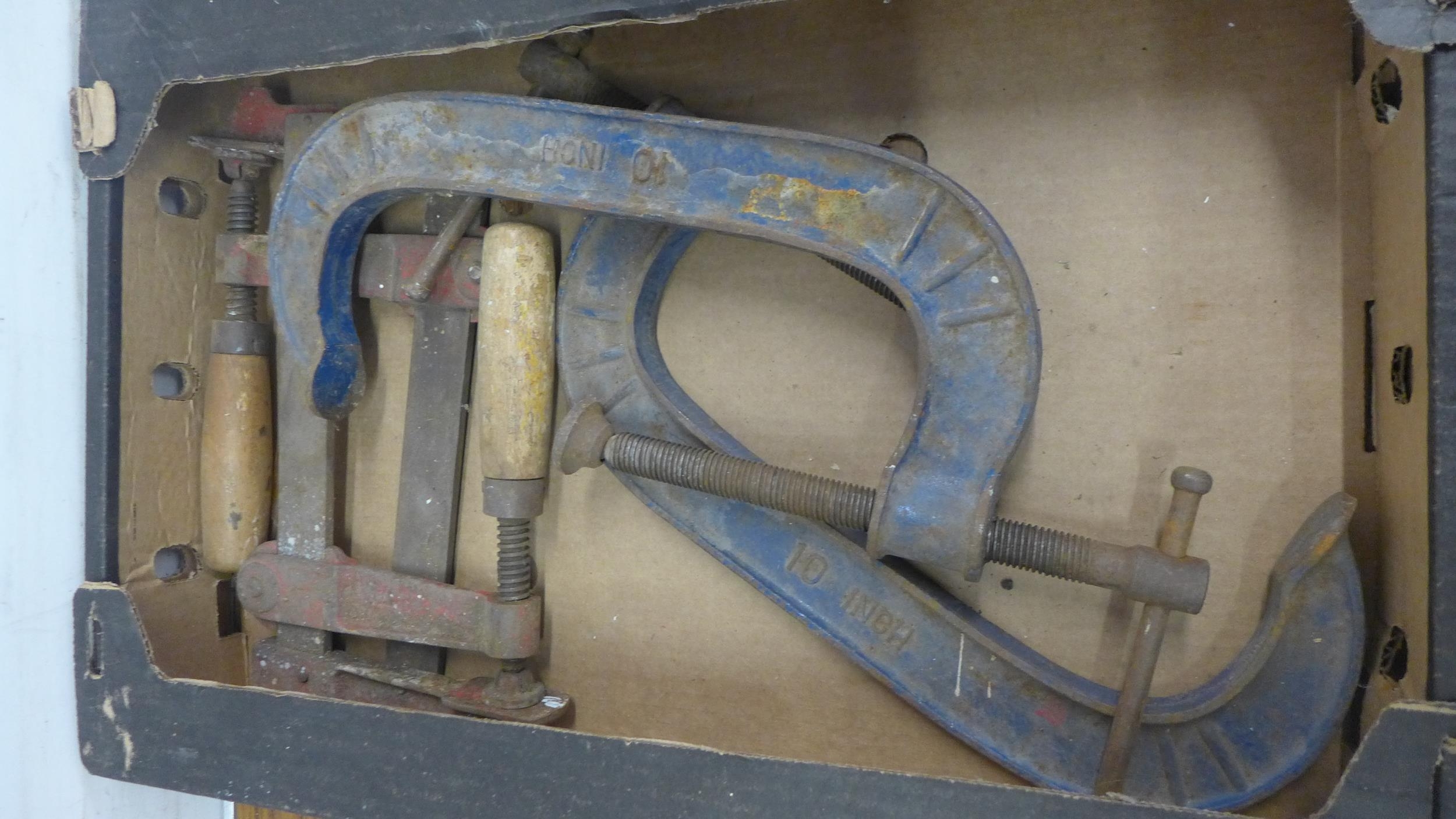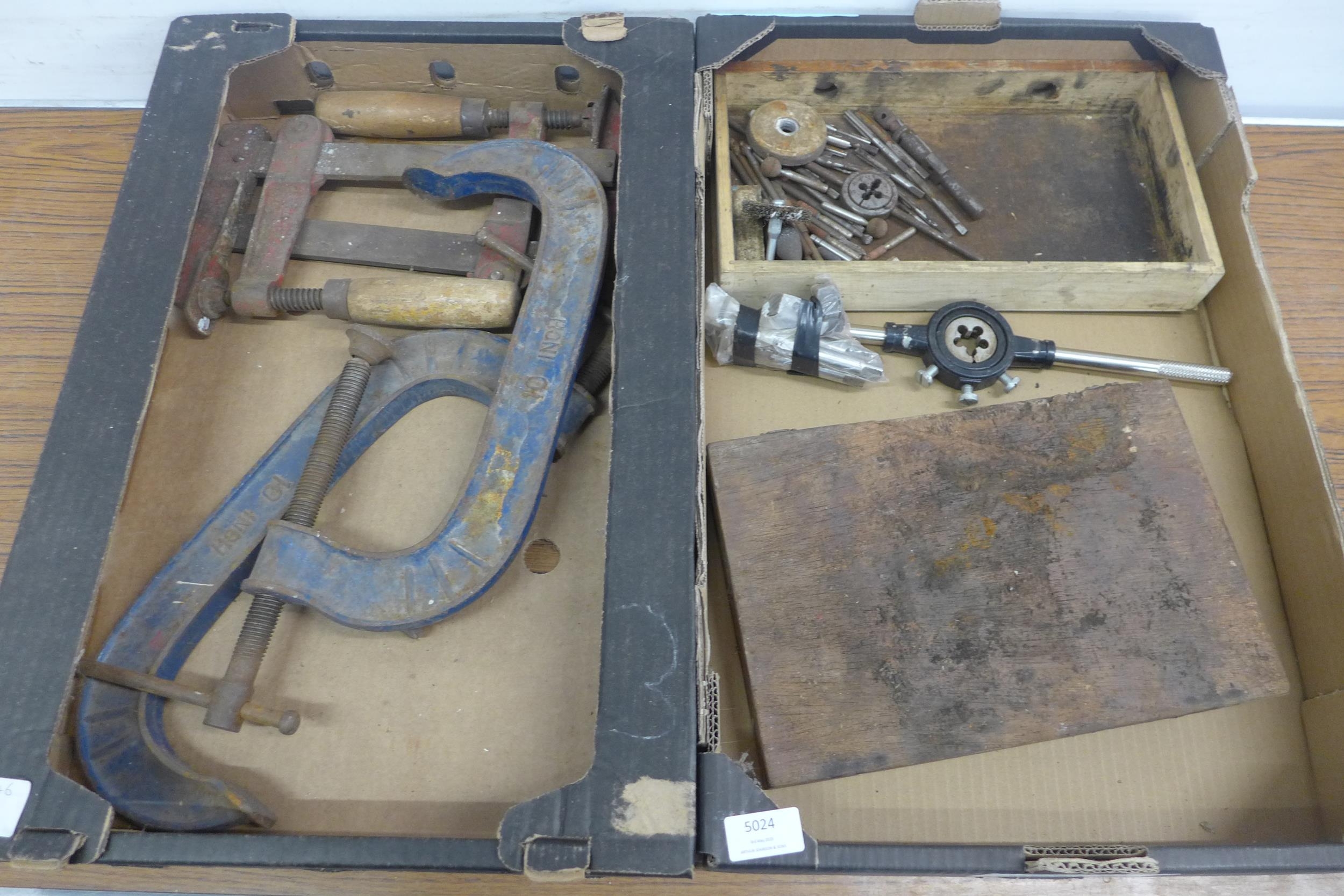 Two boxes of tools containing two 10 inch G-clamps, tap and die sets, etc.