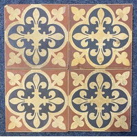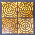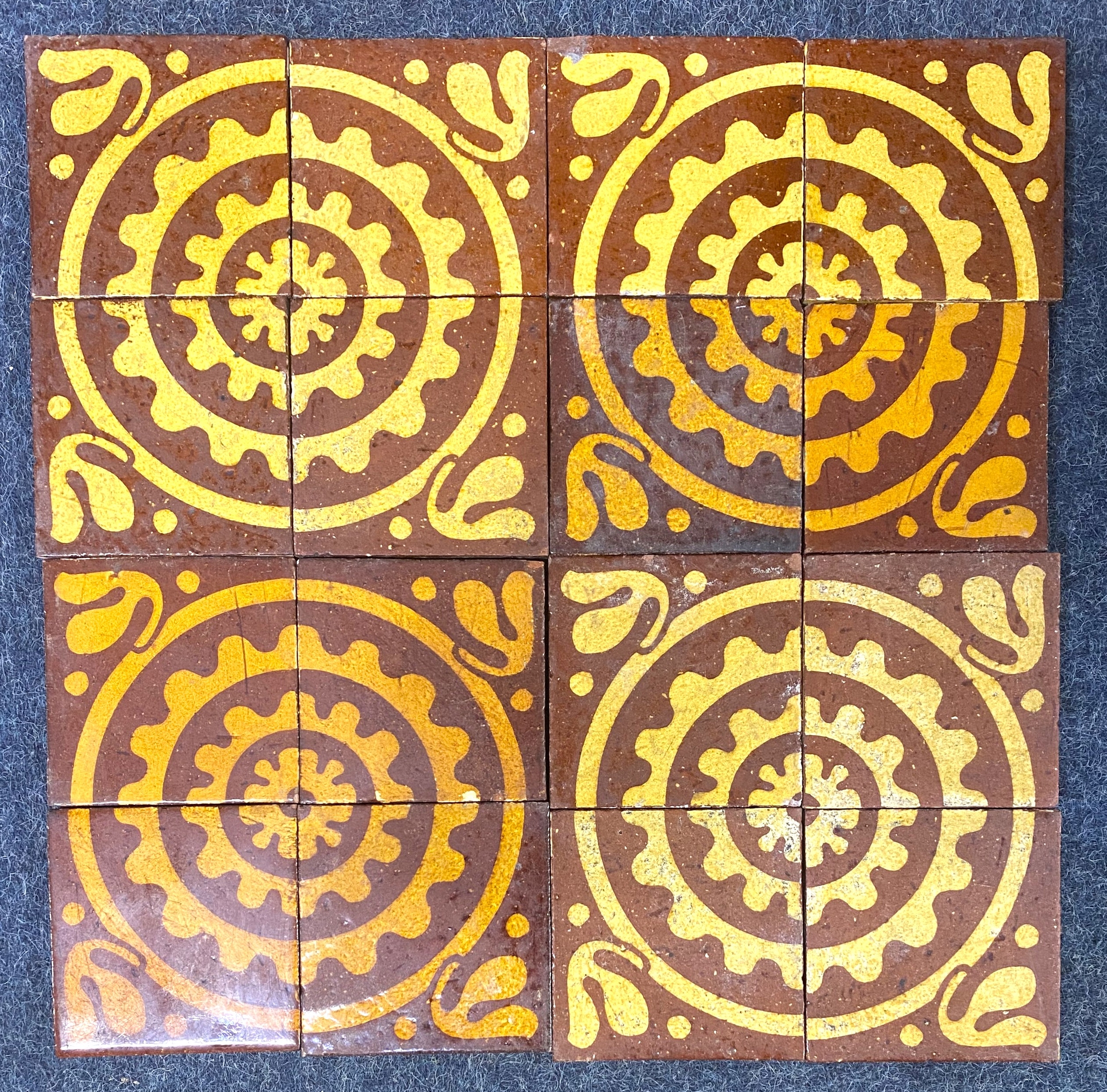 Four groups of four Craven Dunnill & Co encaustic tiles (sixteen total), with flower and circle design in yellow with red brown background 11.3cm by 11.3cm