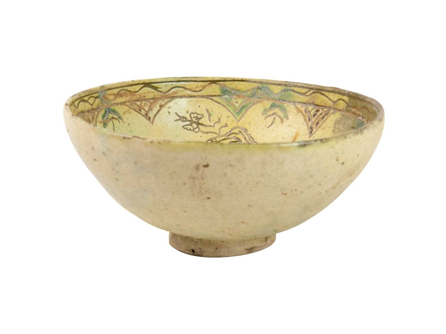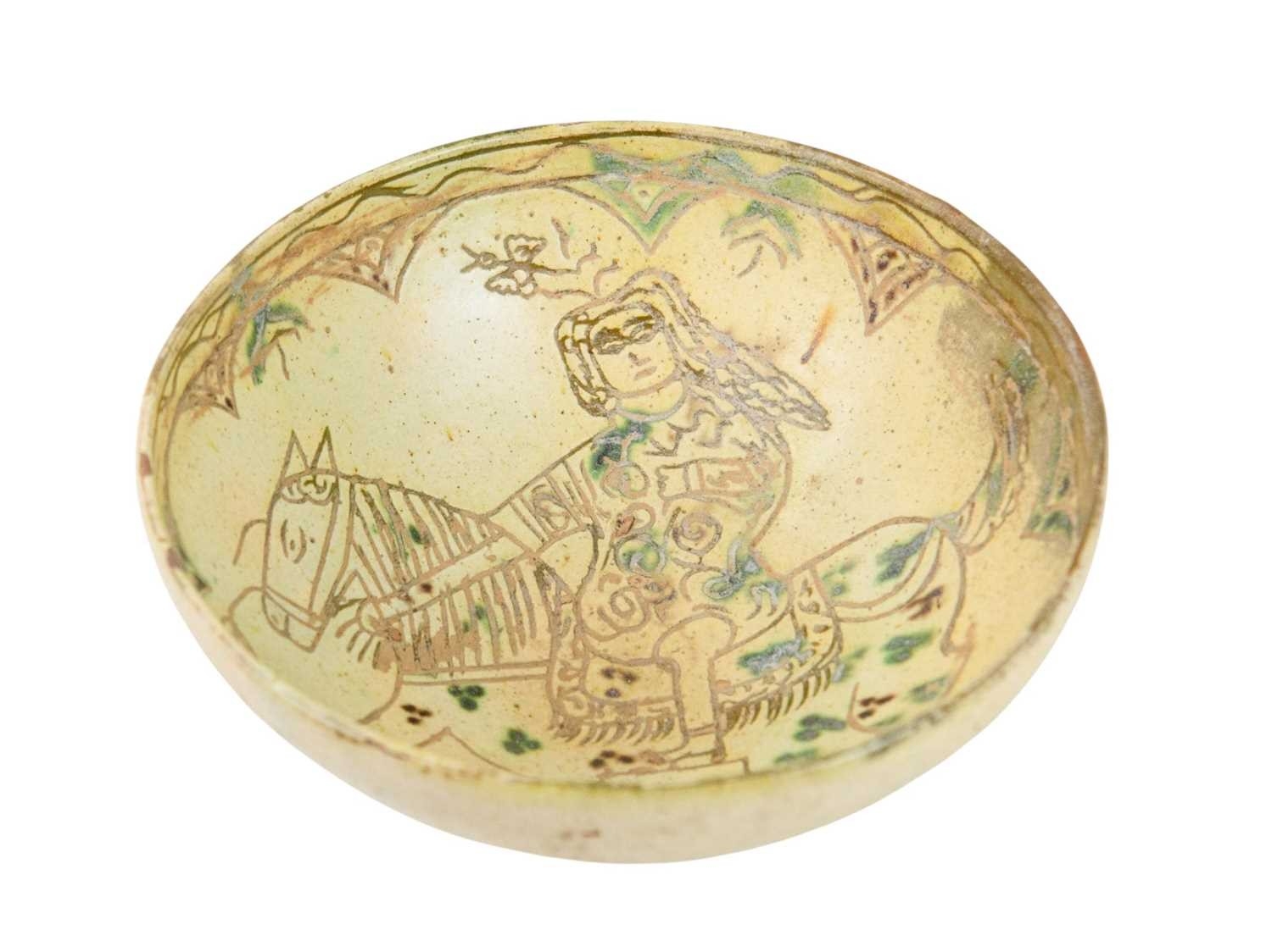 A Persian Kashan bowl. Incised and painted with a horse and rider, height 9cm, diameter 19.5cm. The collection of the late potter Peter Smith of Bojewyan Pottery in West Cornwall. Fellow of the Craftsman Potters Association, member of Newlyn Society of Artists and later chairman of Newlyn Gallery. Peter was also an influential teacher of ceramics at Falmouth University, where he encouraged a spontaneous and improvised approach based on developing technique and an understanding of the medium of clay as an expressive and practical form. Peter originally started as a research chemist before turning to pottery after attending evening classes. He started his own pottery at Bojewyan in West Cornwall in 1974. As well as being a renowned and experimental potter and tutor, he was also a keen collector of medieval and later pottery from the UK and further afield. His Guardian obituary can be read here:https://www.theguardian.com/artanddesign/2025/aug/13/peter-smith-obituary