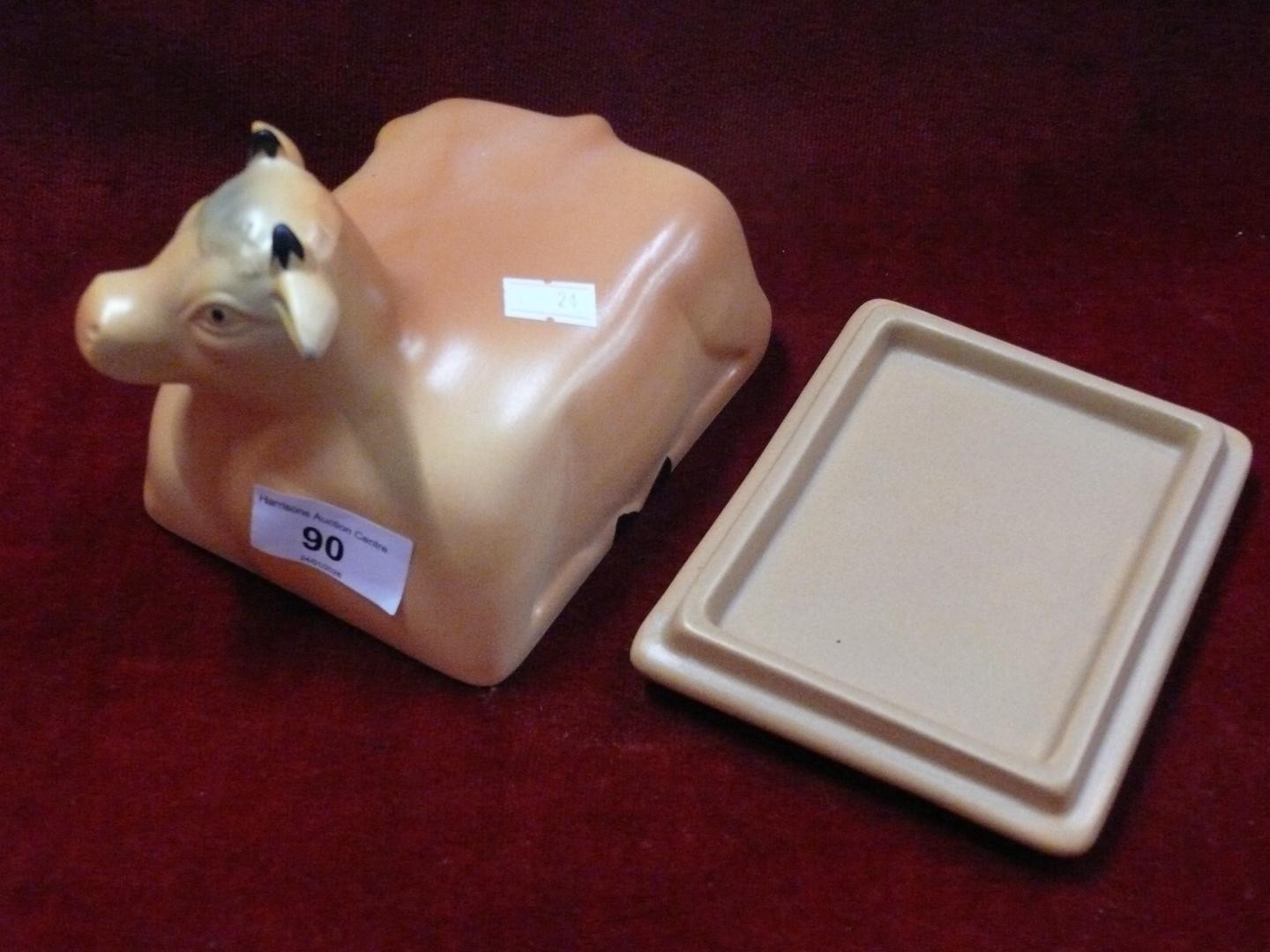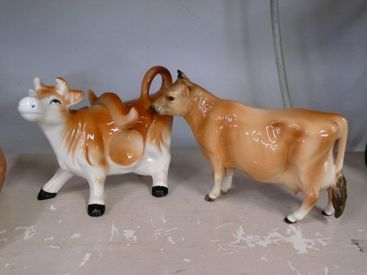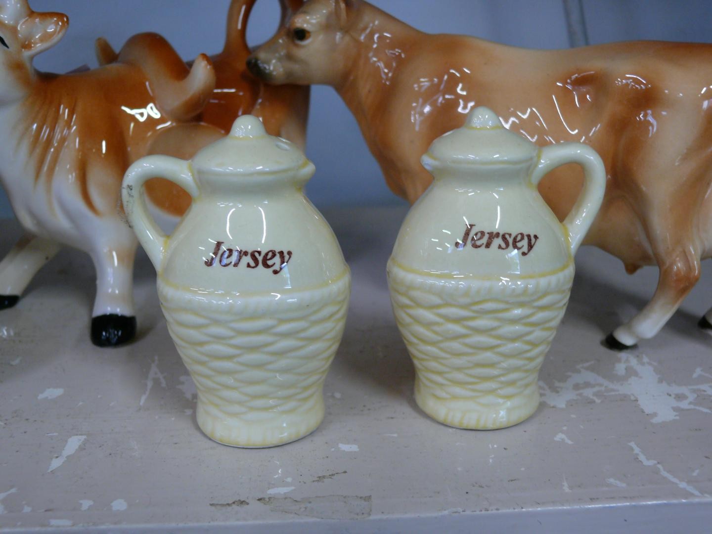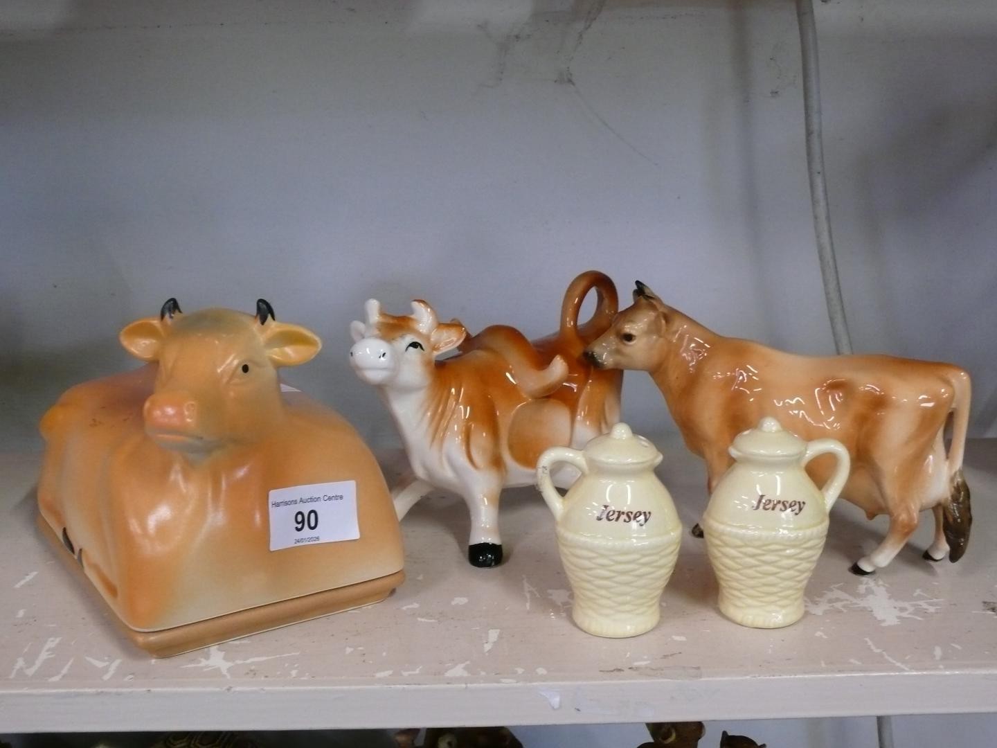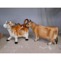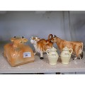 Pair of ceramic cow creamers plus a cow butter dish and a Jersey cruet set