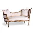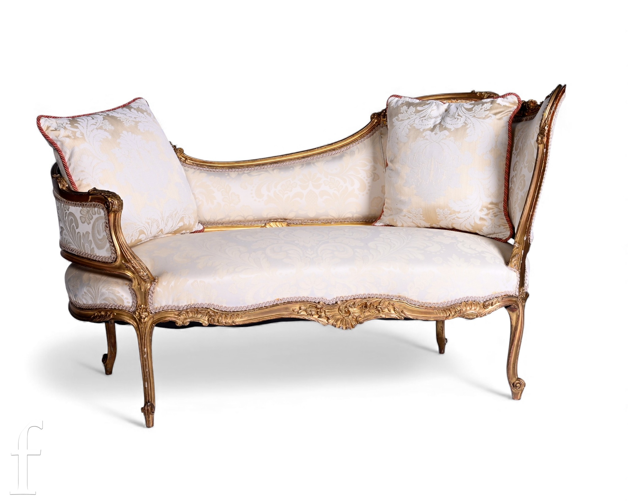 A small 19th Century gilt chaise longue, rococo and acanthus carved frame on cabriole legs, upholstered in cream damask, width 134cm.