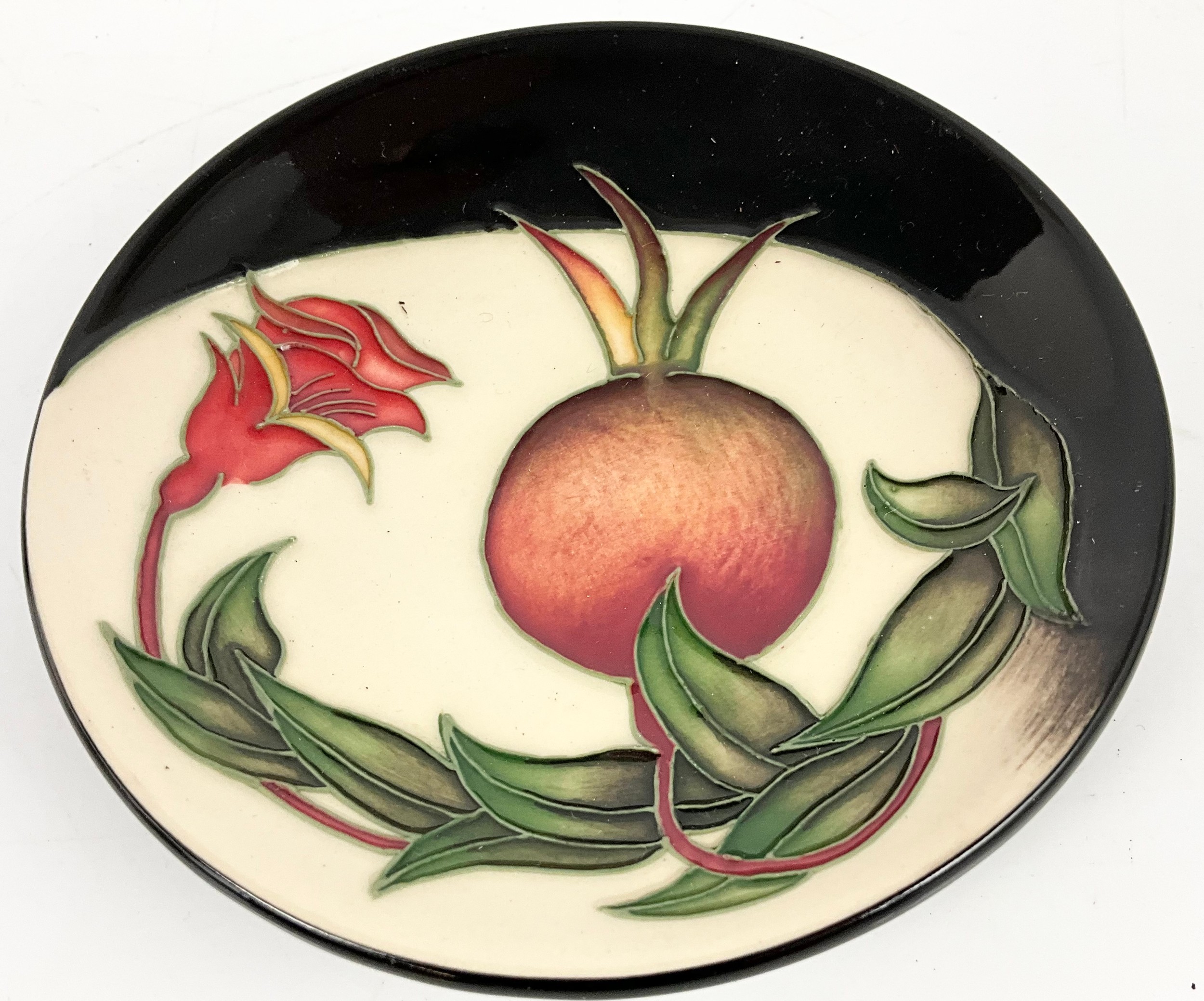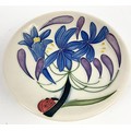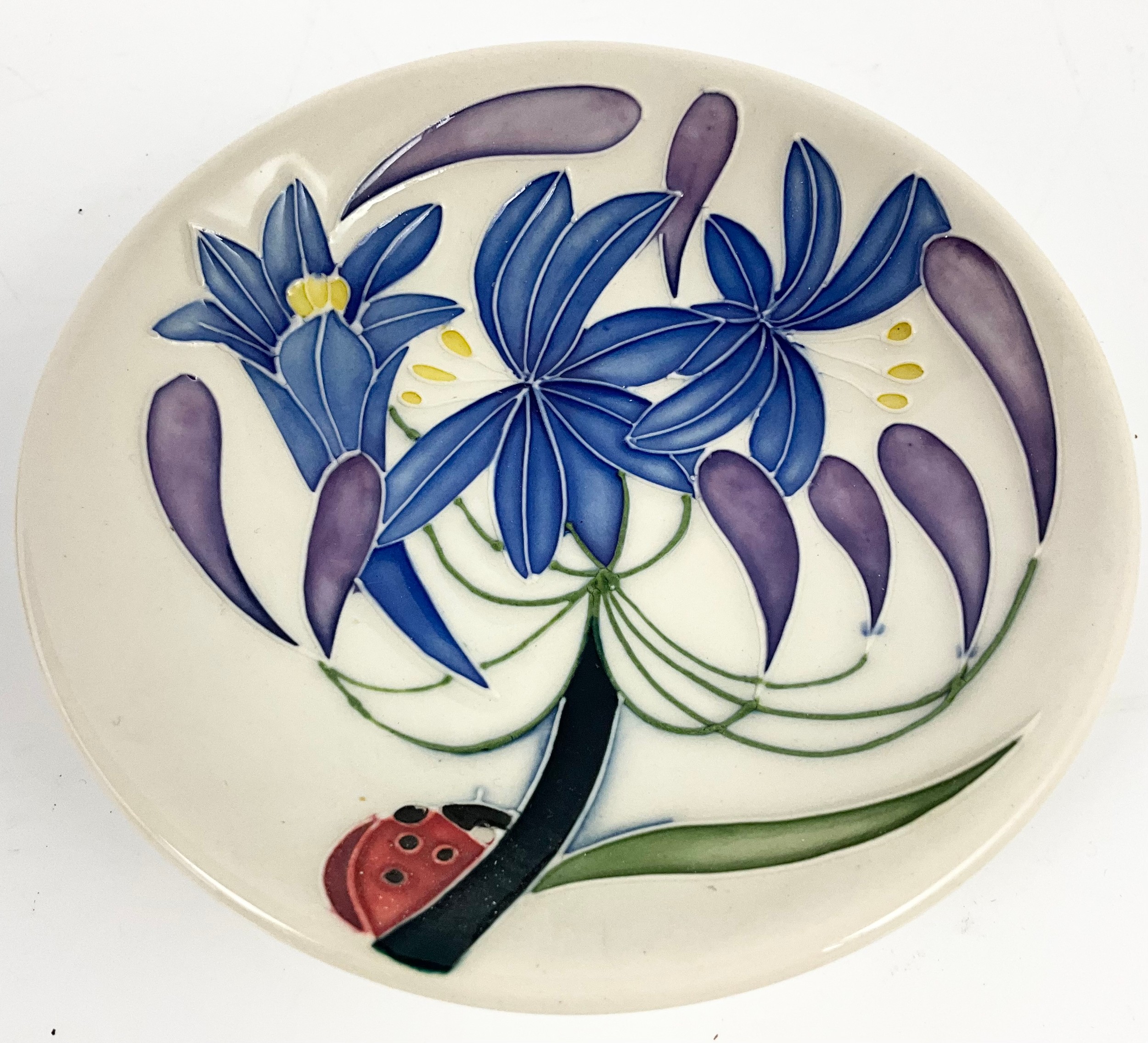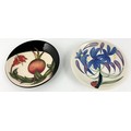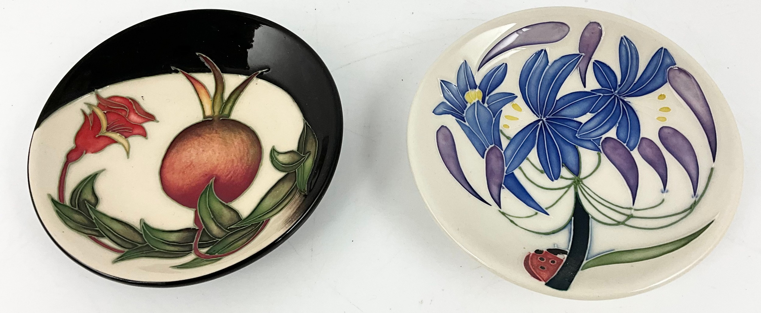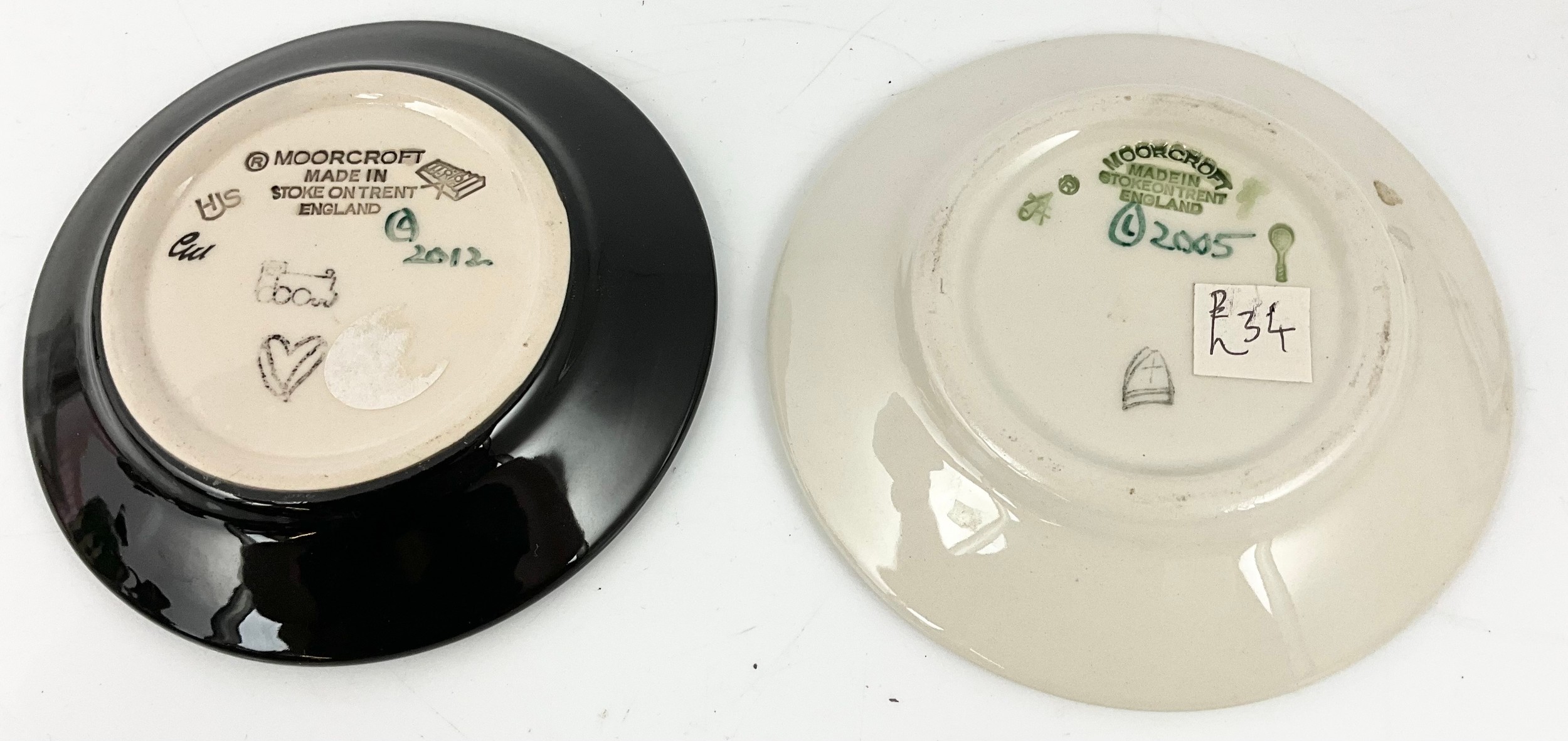 TWO MOORCROFT POTTERY PIN DISHES INCLUDING FLY AWAY HOME PATTERN WITH IMPRESSED BACKSTAMPS 11.5cm