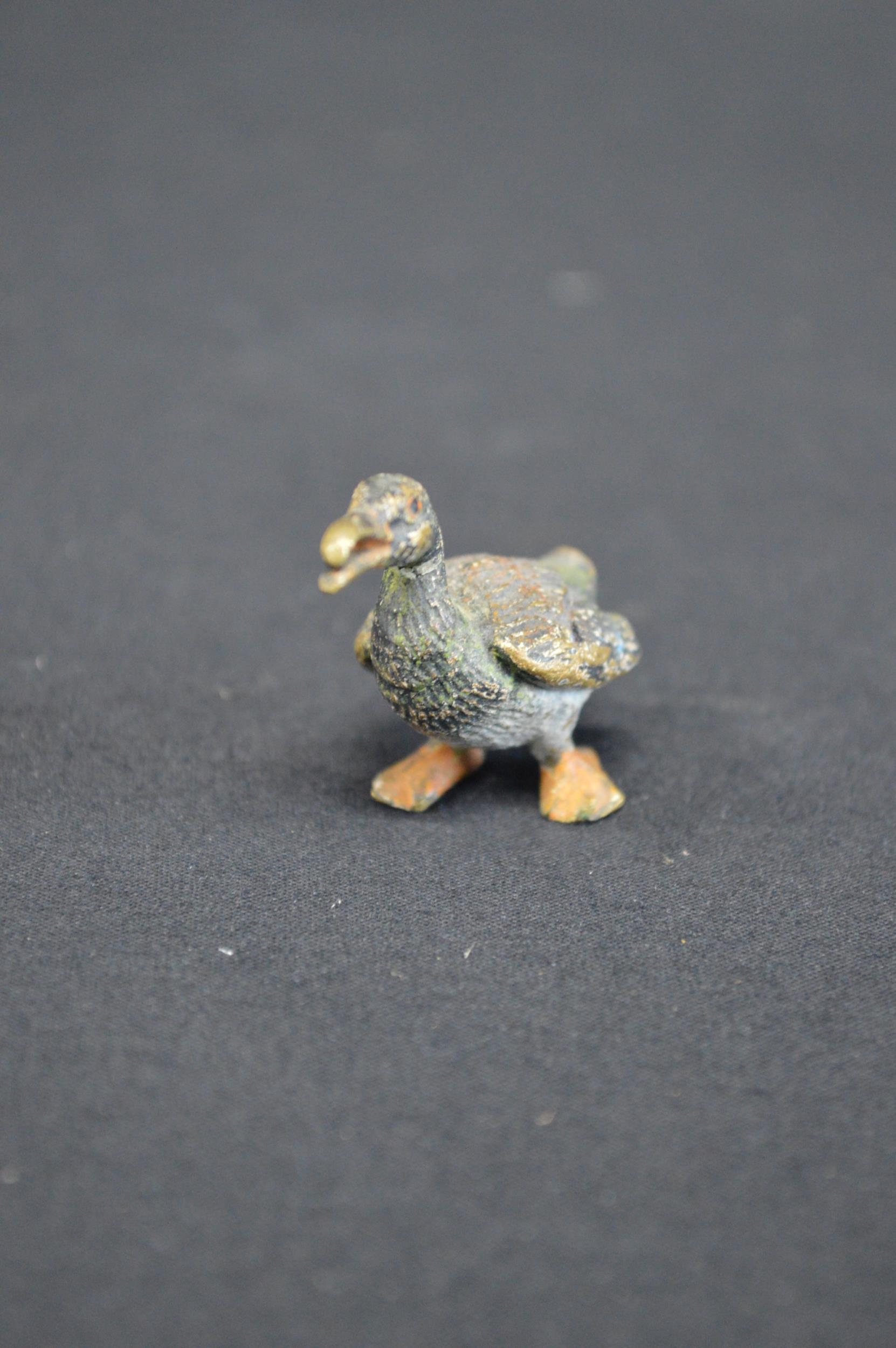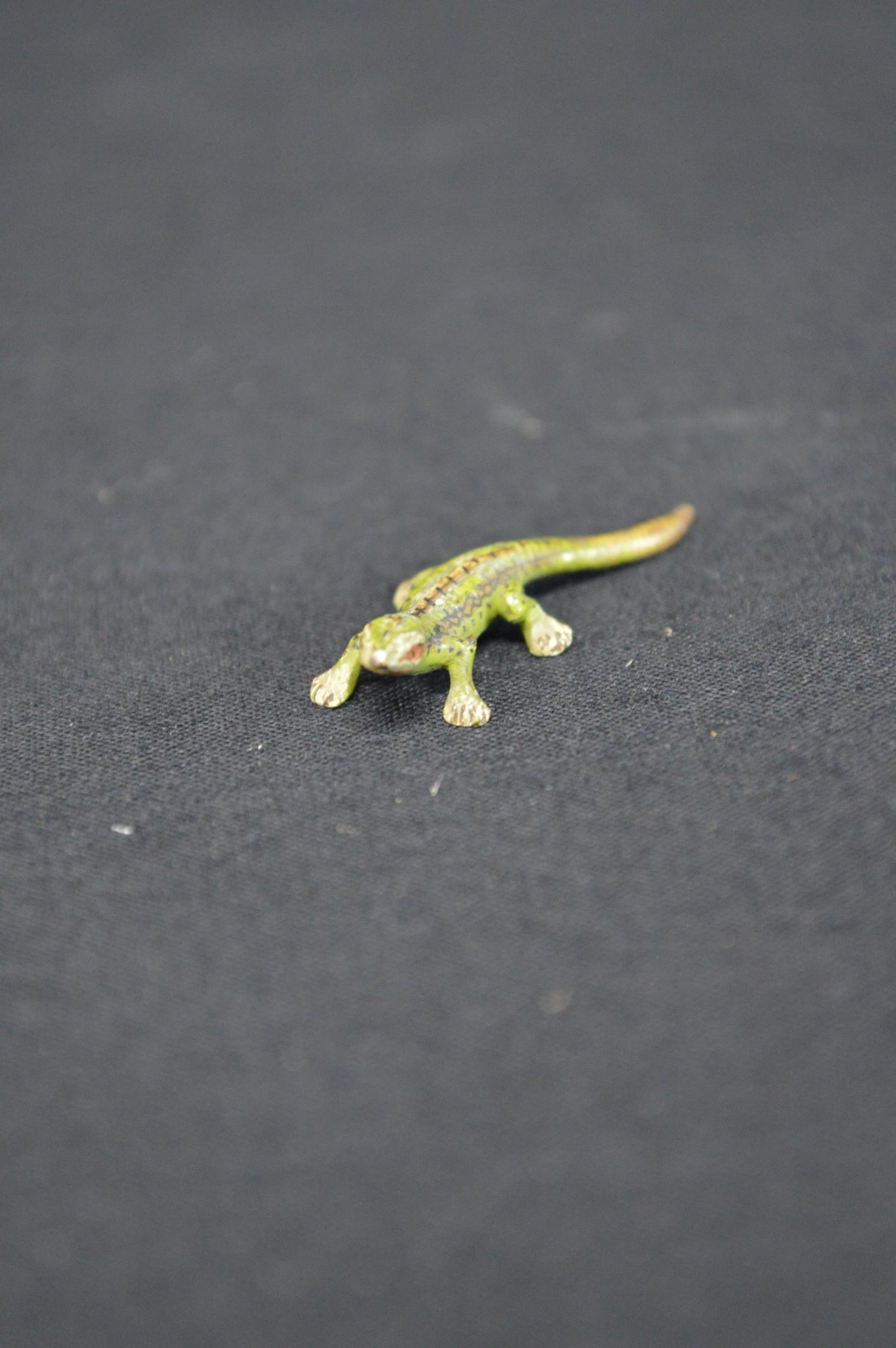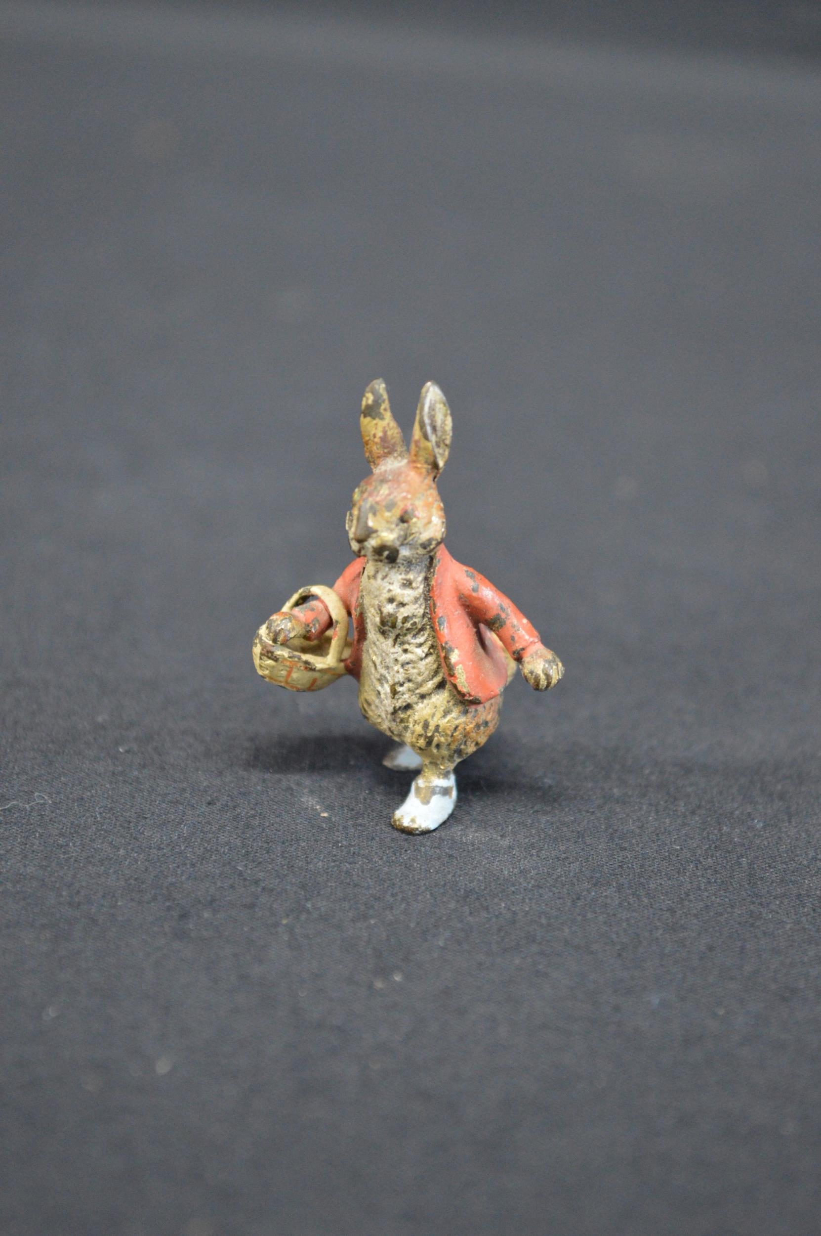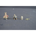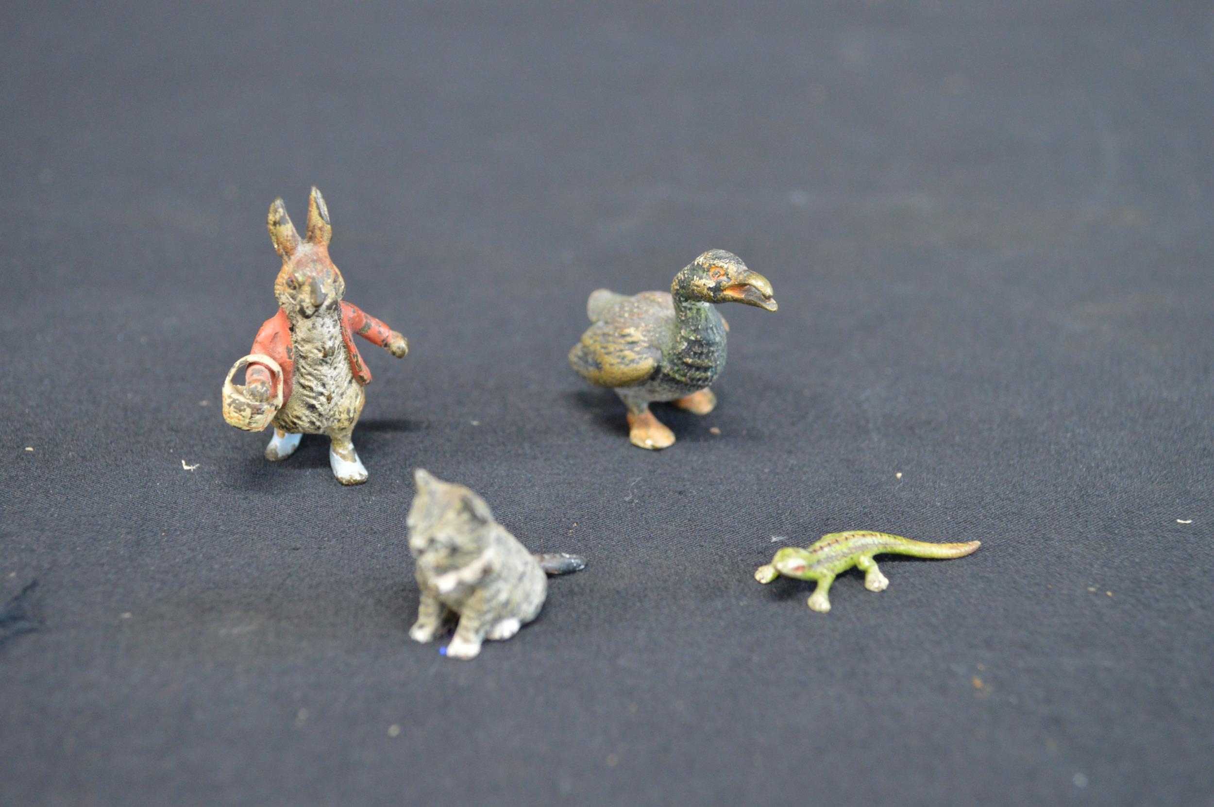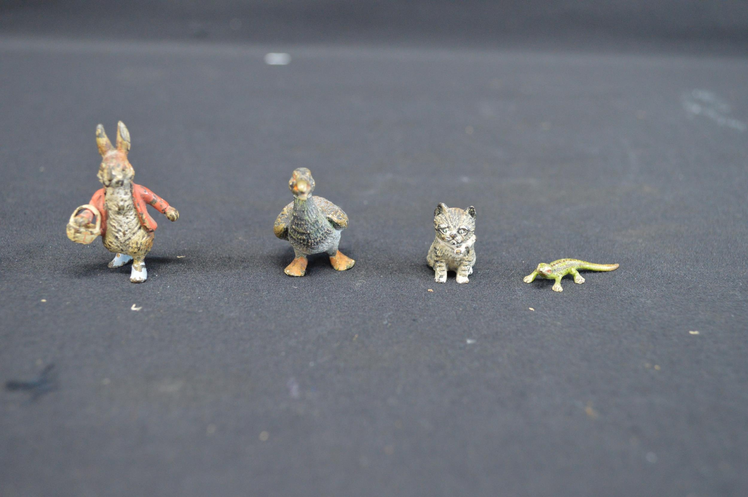 Group of four cold painted bronze figures to comprise: Peter Rabbit - 4cm tall, lizard, kitten and goose