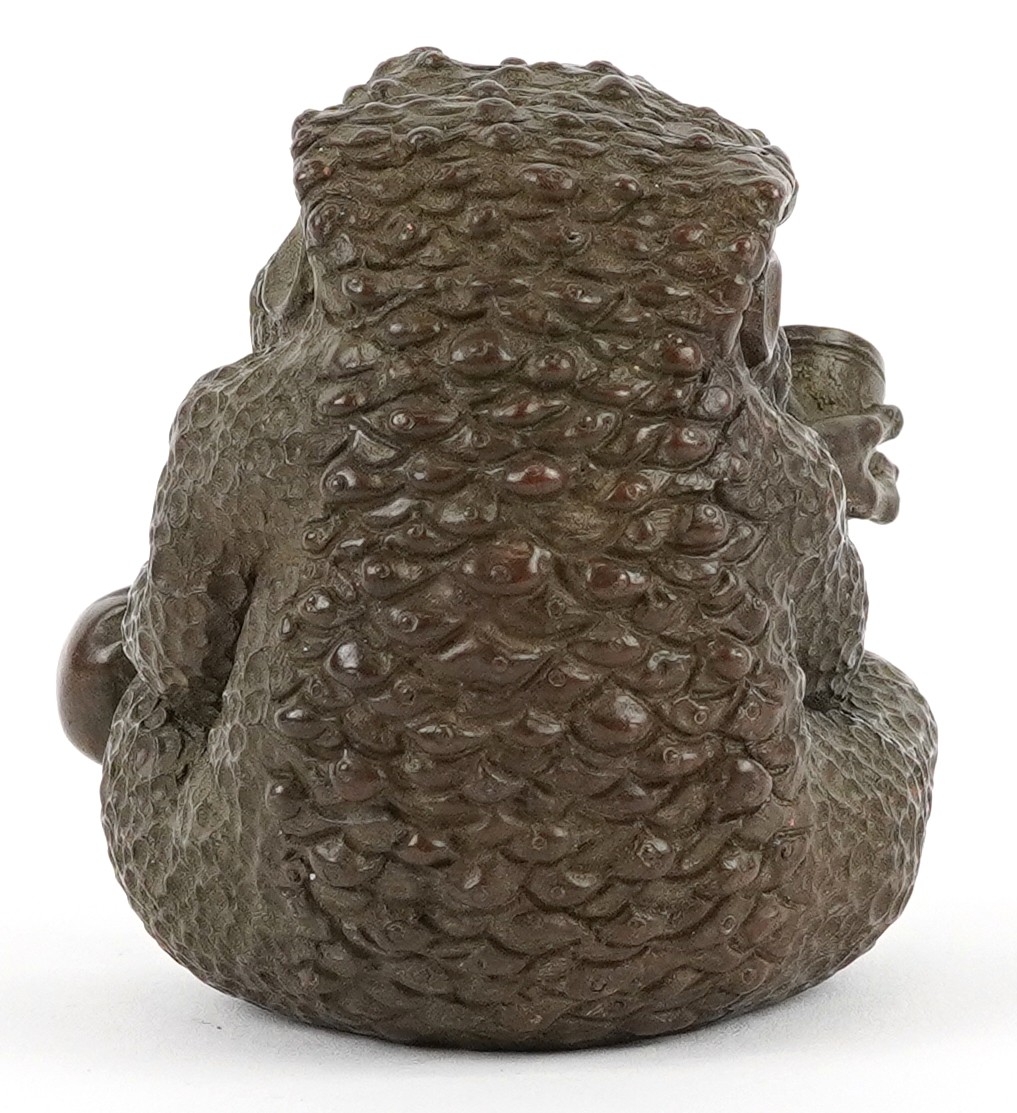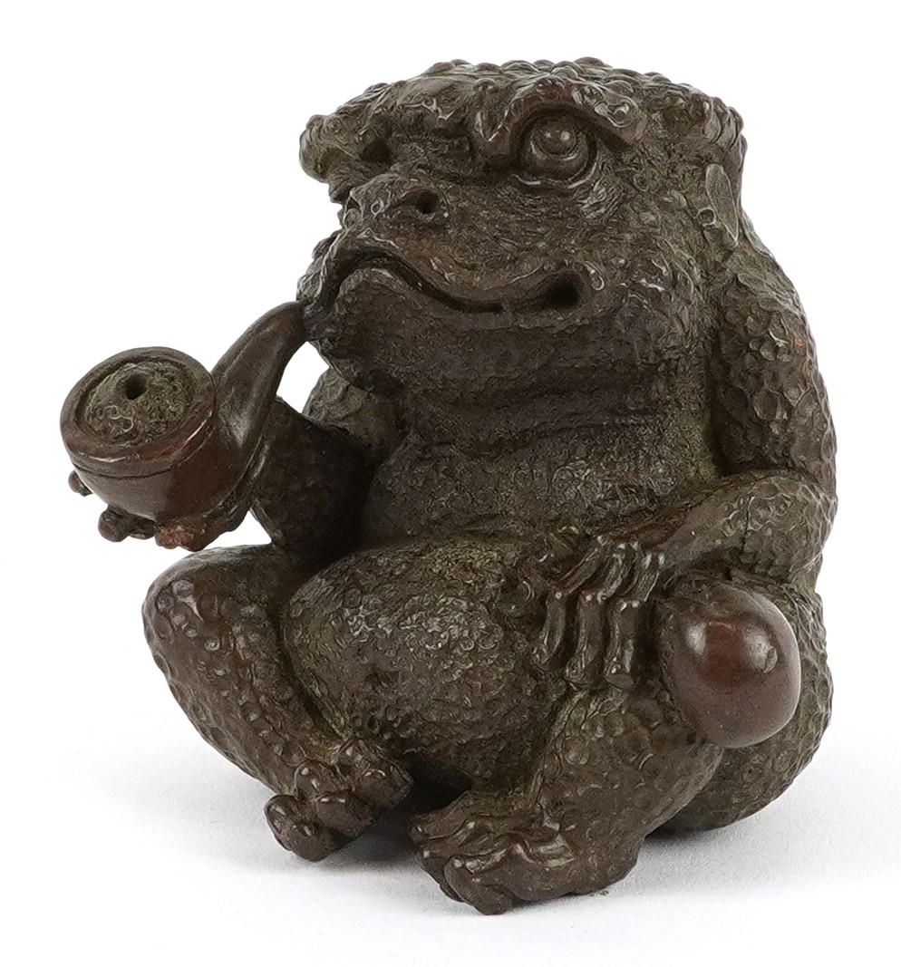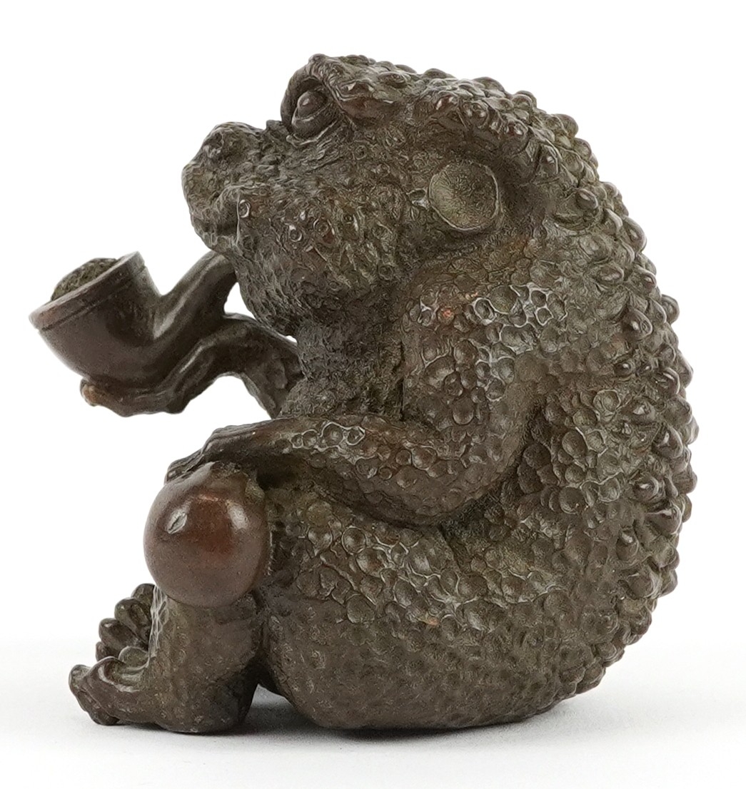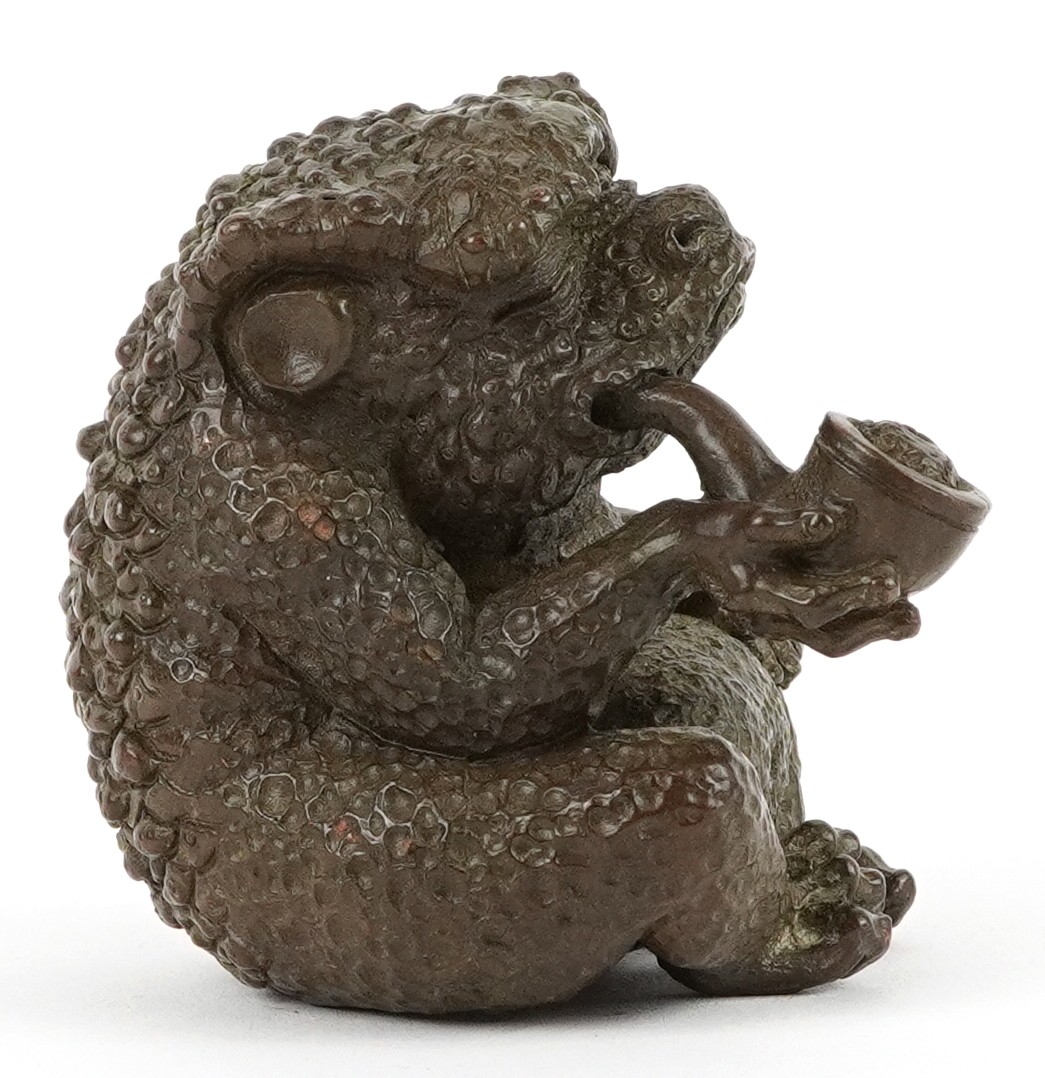 A Japanese patinated bronze study of a seated toad smoking a pipe, impressed character marks to the base, 7cm high.