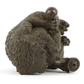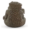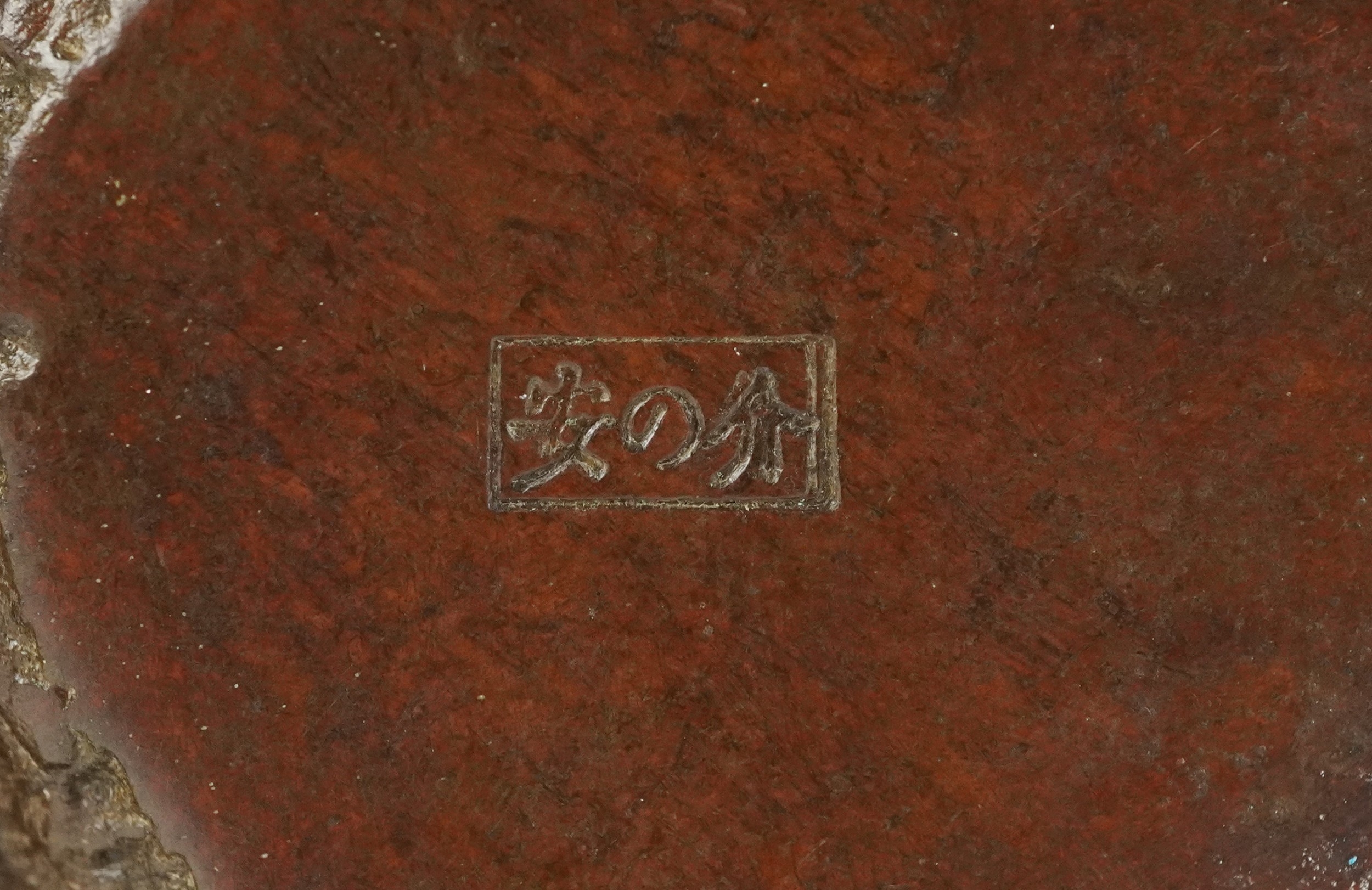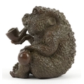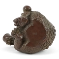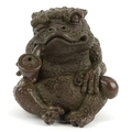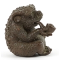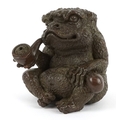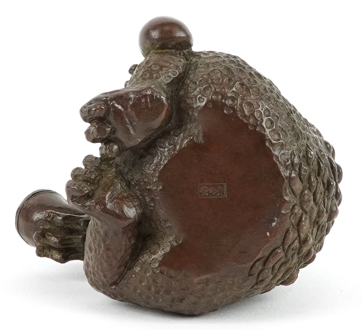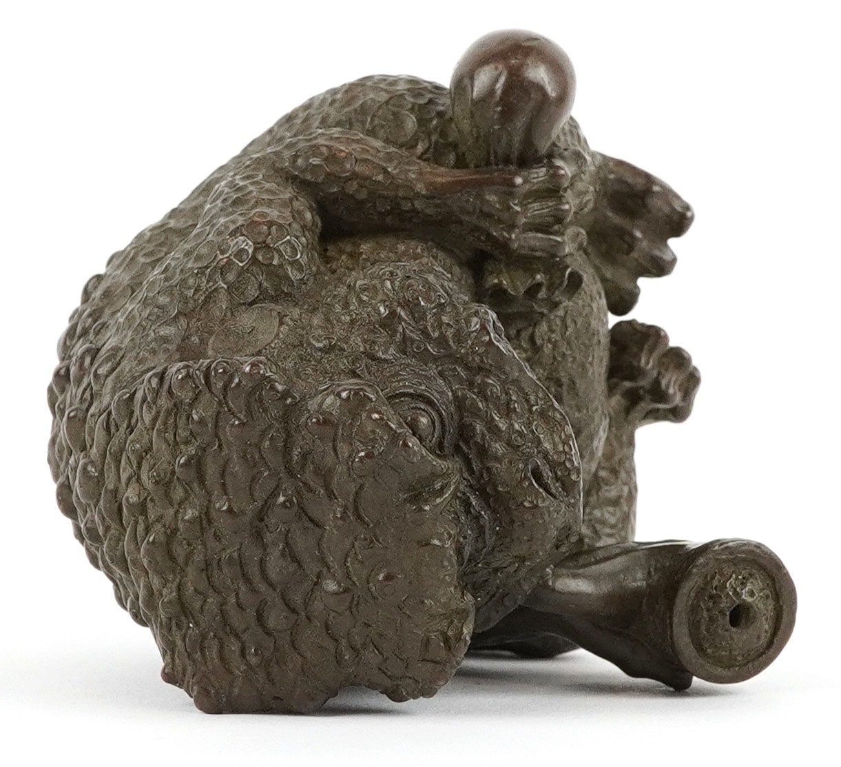 A Japanese patinated bronze study of a seated toad smoking a pipe, impressed character marks to the base, 7cm high.