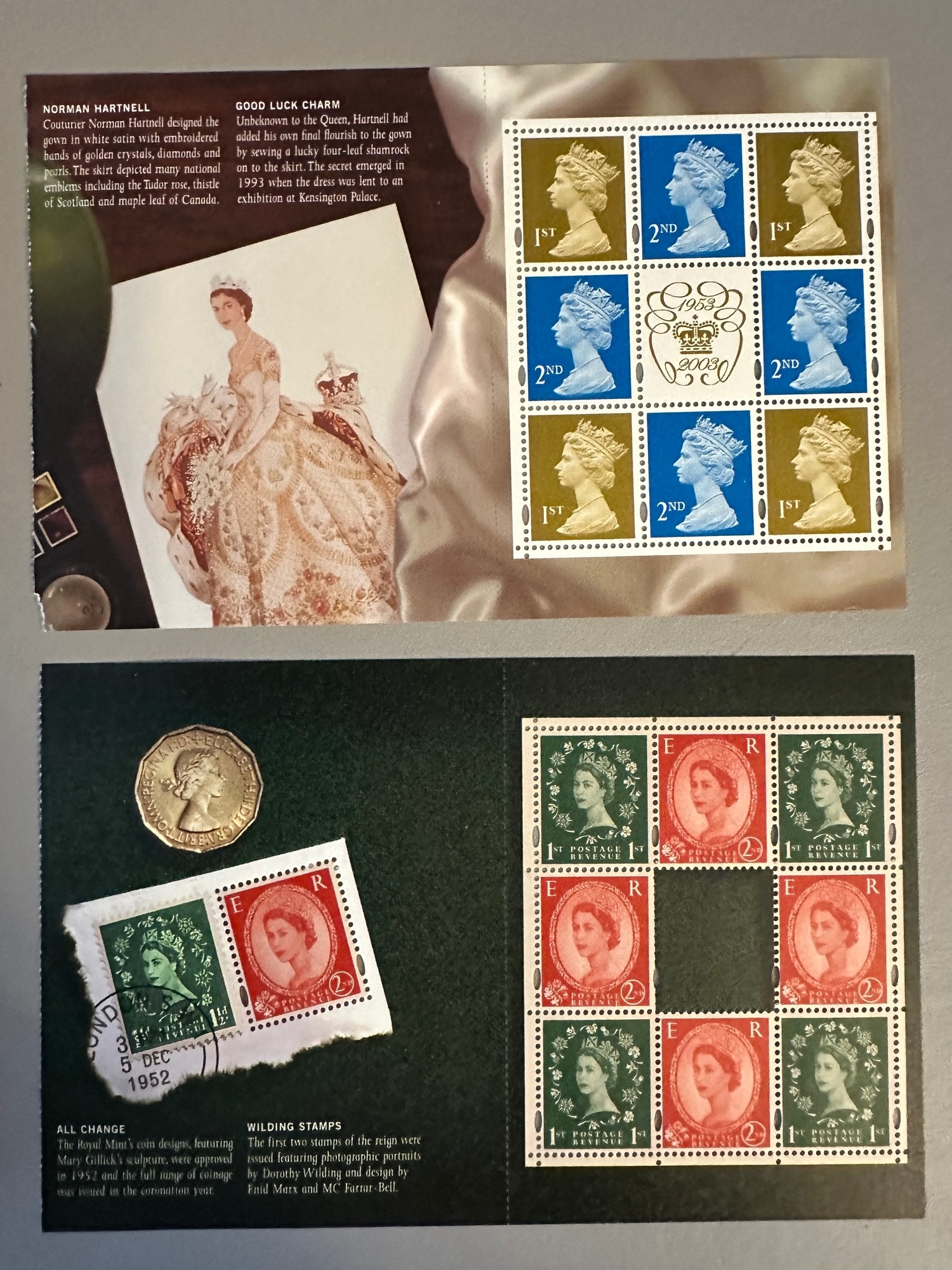 UK GB QEII Royal Mail first and second class machin and commemoratives stamps as two prestige booklet panes, mint nh, face value £20 (inc swap out scheme Machin Definitives)