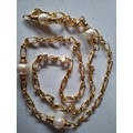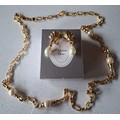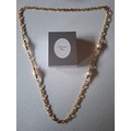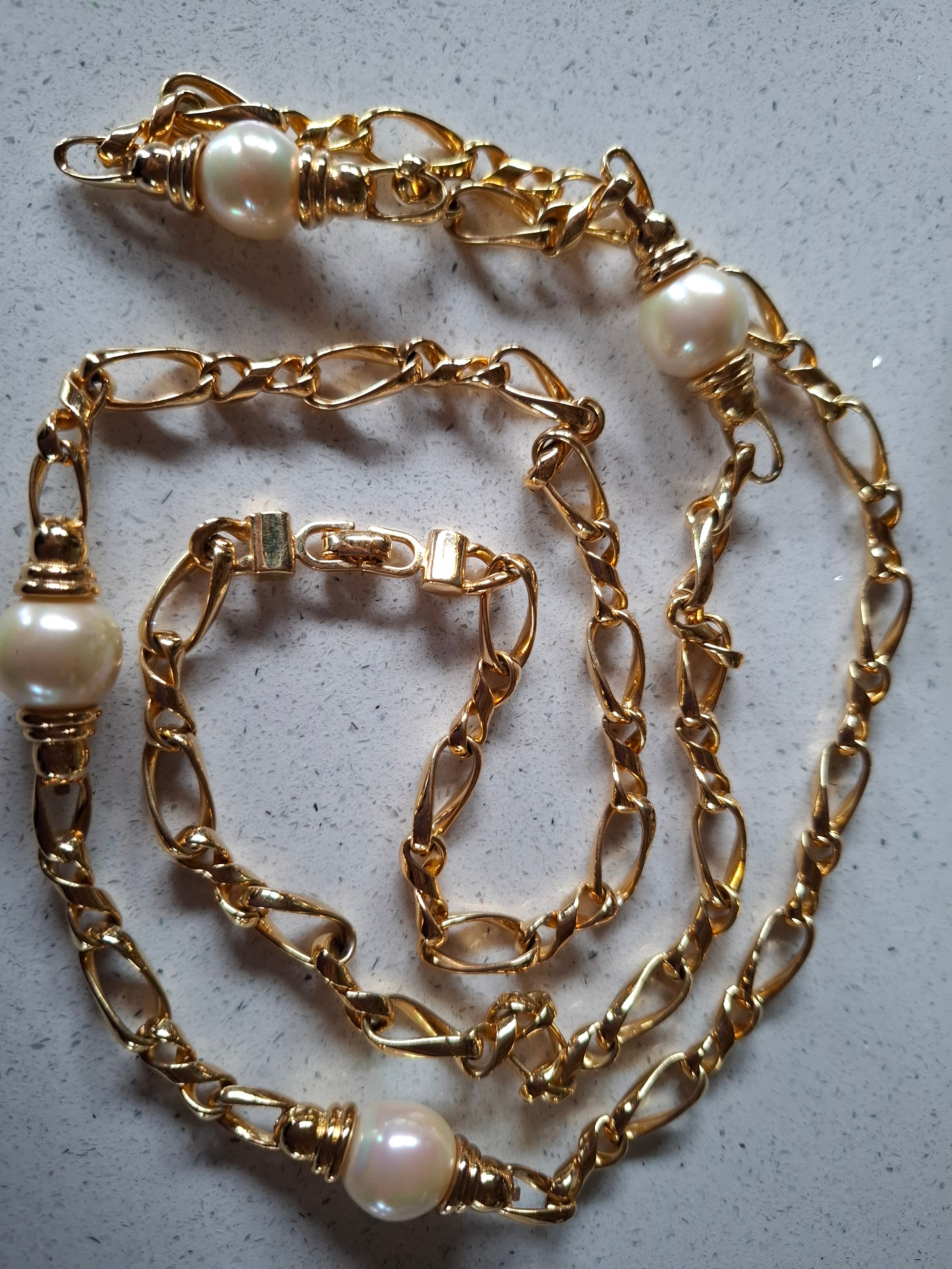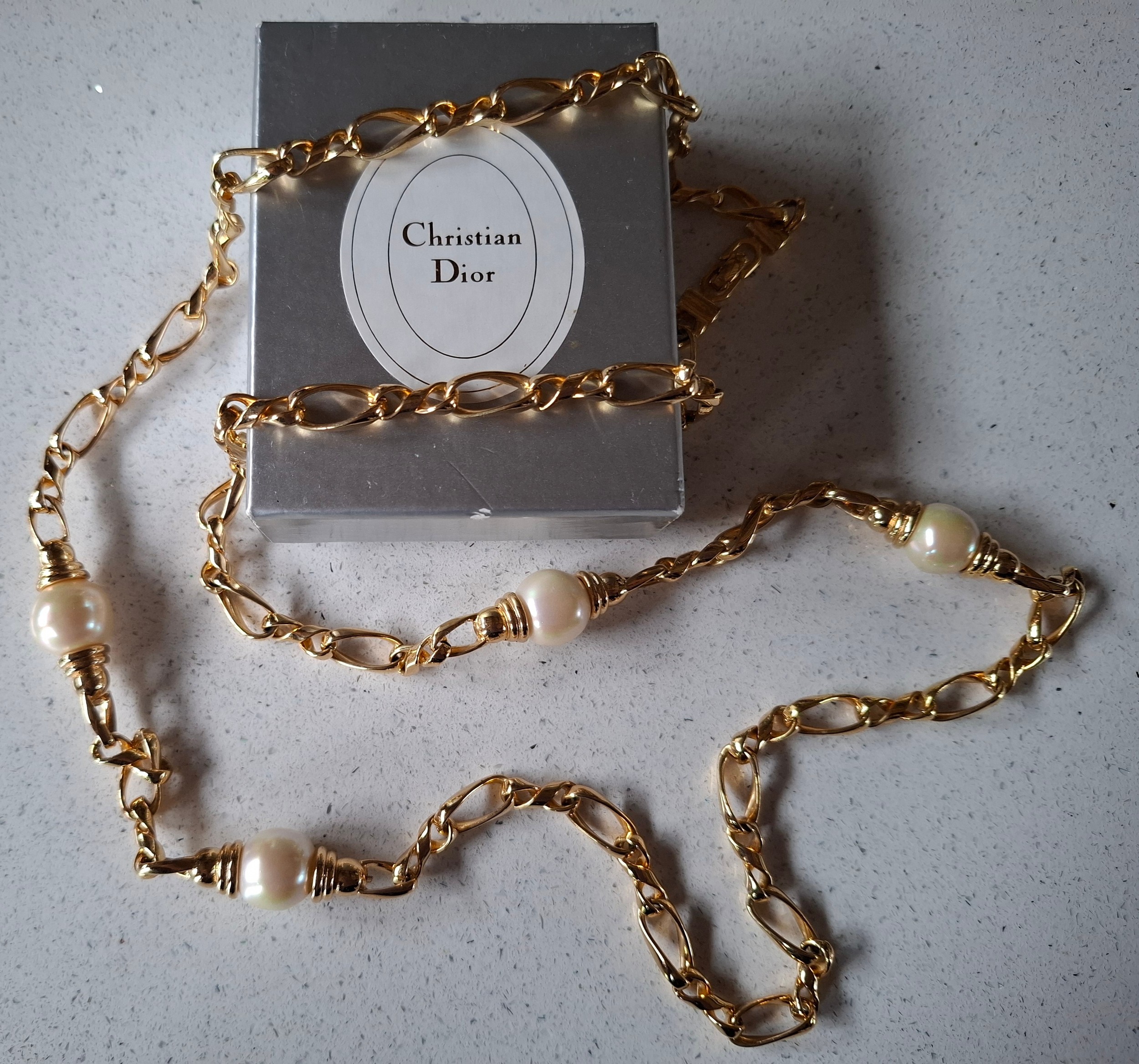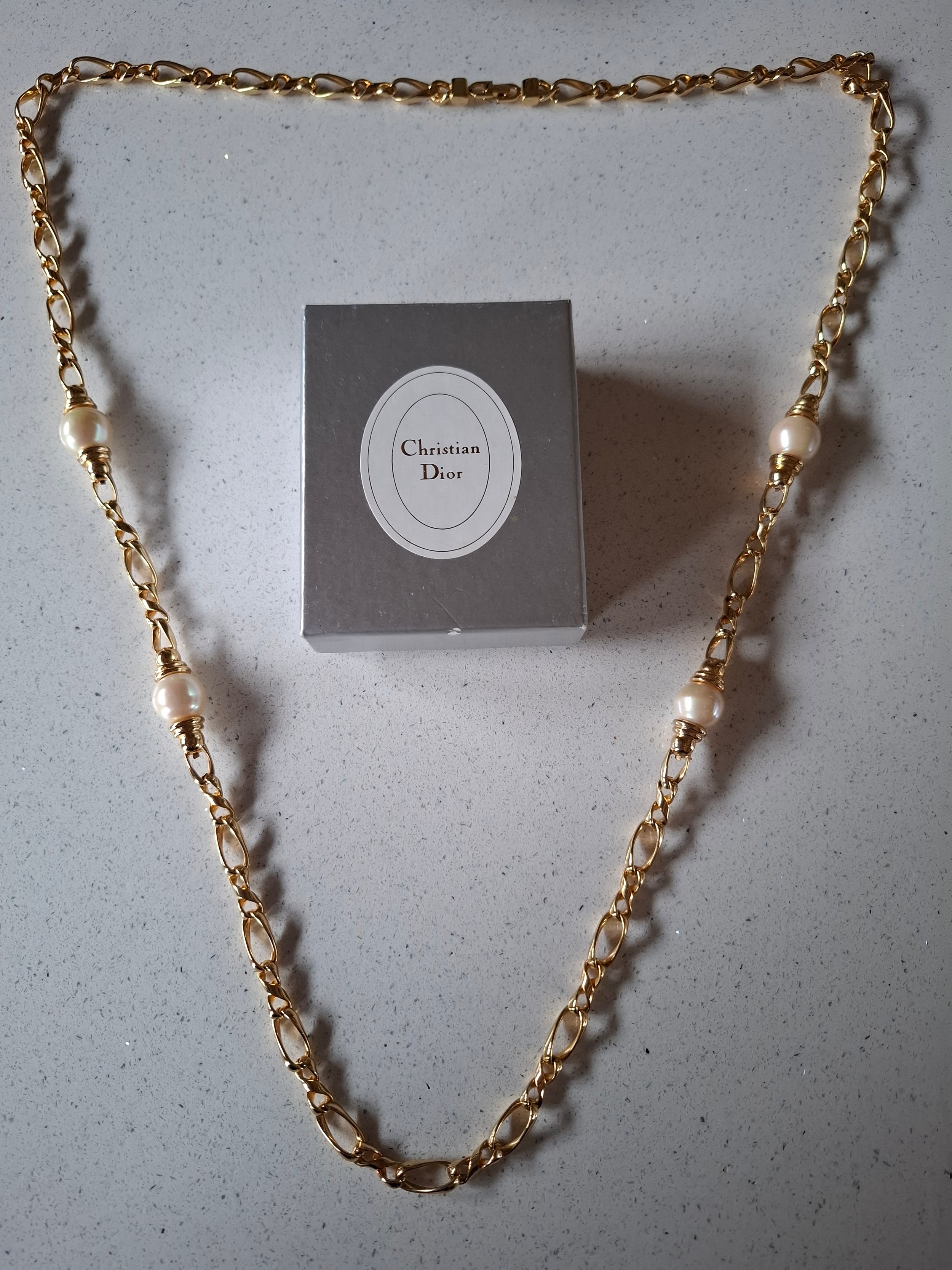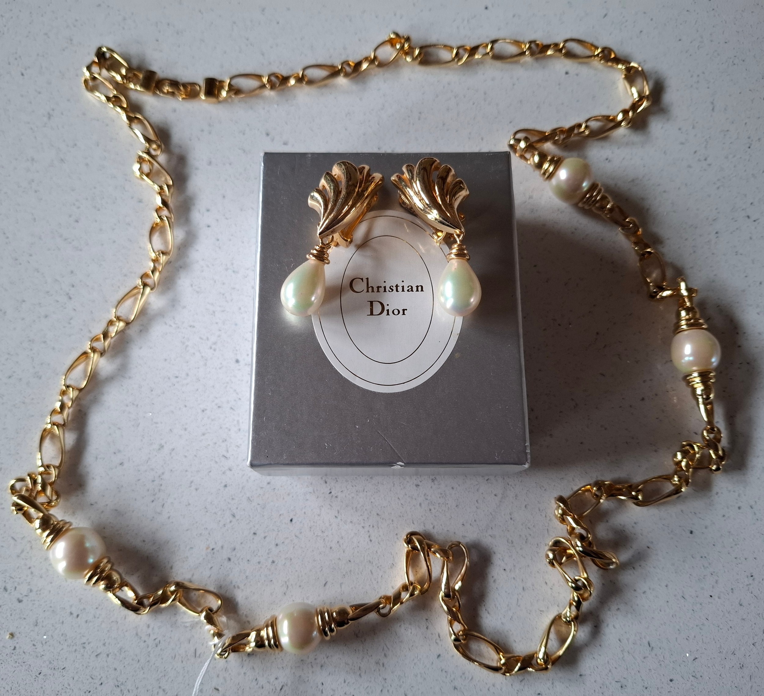 Christian Dior- A gold tone curb link necklace with 4 pearlised beads, stamped Chr.Dior© to clasp, approx 85cm long (box not provided) and a pair of matched CD gold tone and drop faux pearl clip on earrings, also stamped to clasps. Location:Cab 1