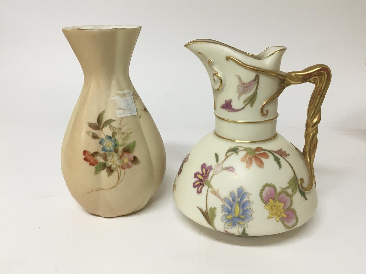 A Royal Worcester porcelain jug decorated with flowers and gilt handle and one other Worcester vase height 14cm (2)