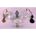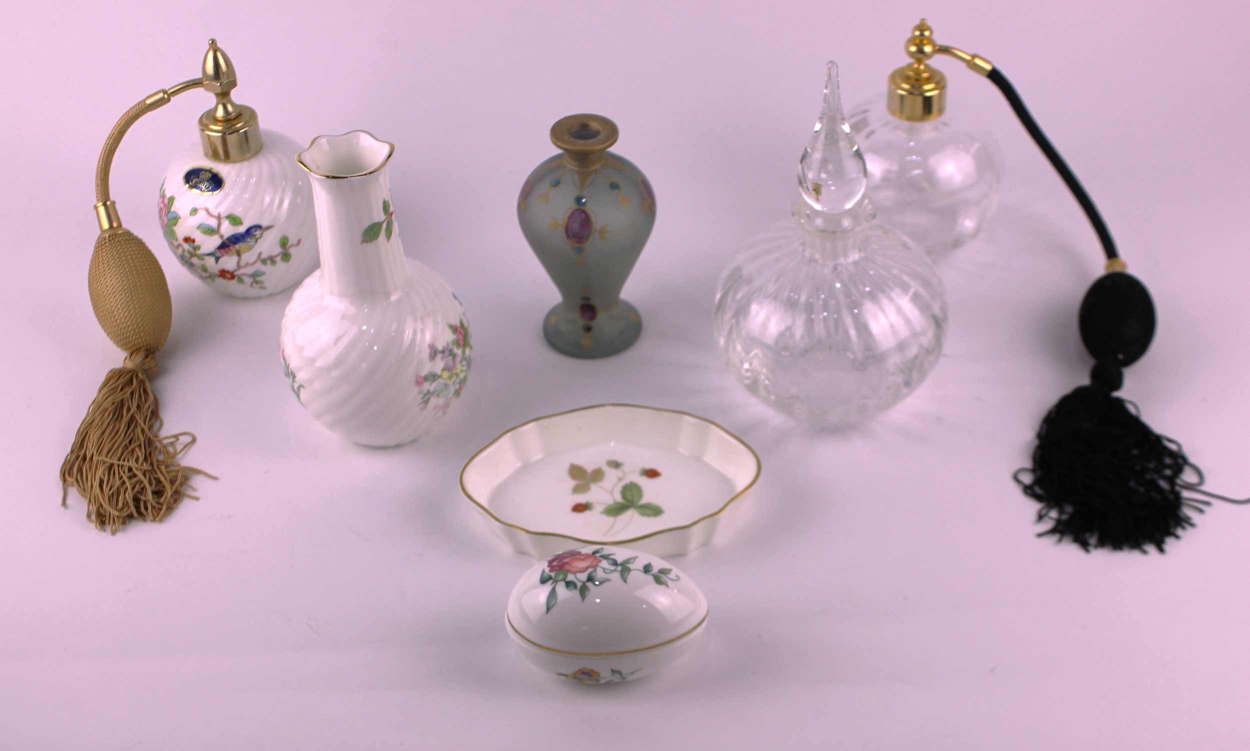 A Dartington crystal 'Rosemary' perfume spray with atomiser, and 'Angelica' cologne flask with dipper, an Aynsley china 'Pembroke' swirl atomiser, A Wedgwood 'Wild Strawberry' trinket dish and an egg shaped box, all with boxes, together with a small Aynsley 'Wild Tudor' pattern vase