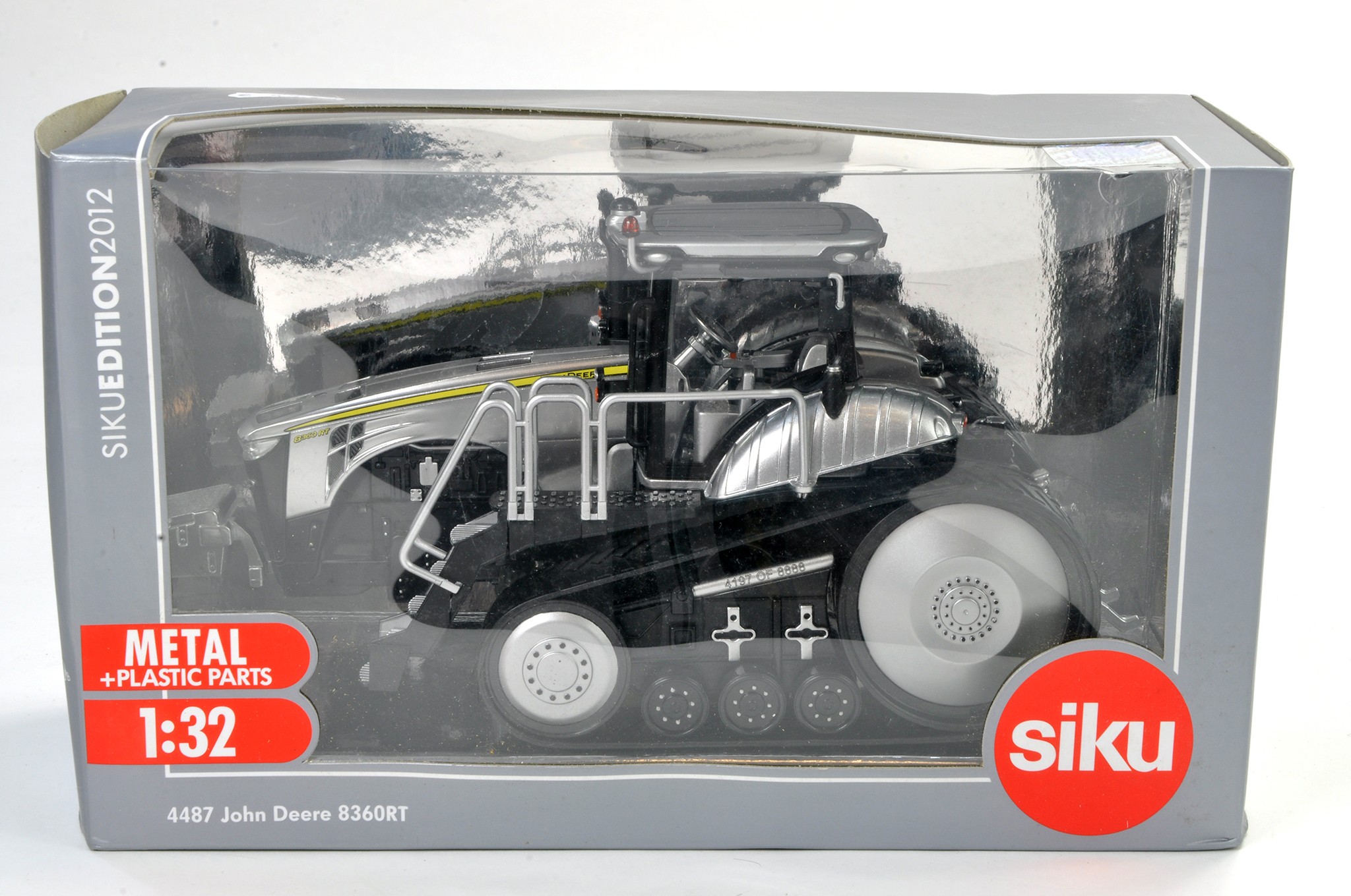 Siku 1/32 Model Farm Issue comprising John Deere 8360RT Tractor Silver Special Edition. Excellent, appears to have never been removed from box. Box has some very minor deformation.