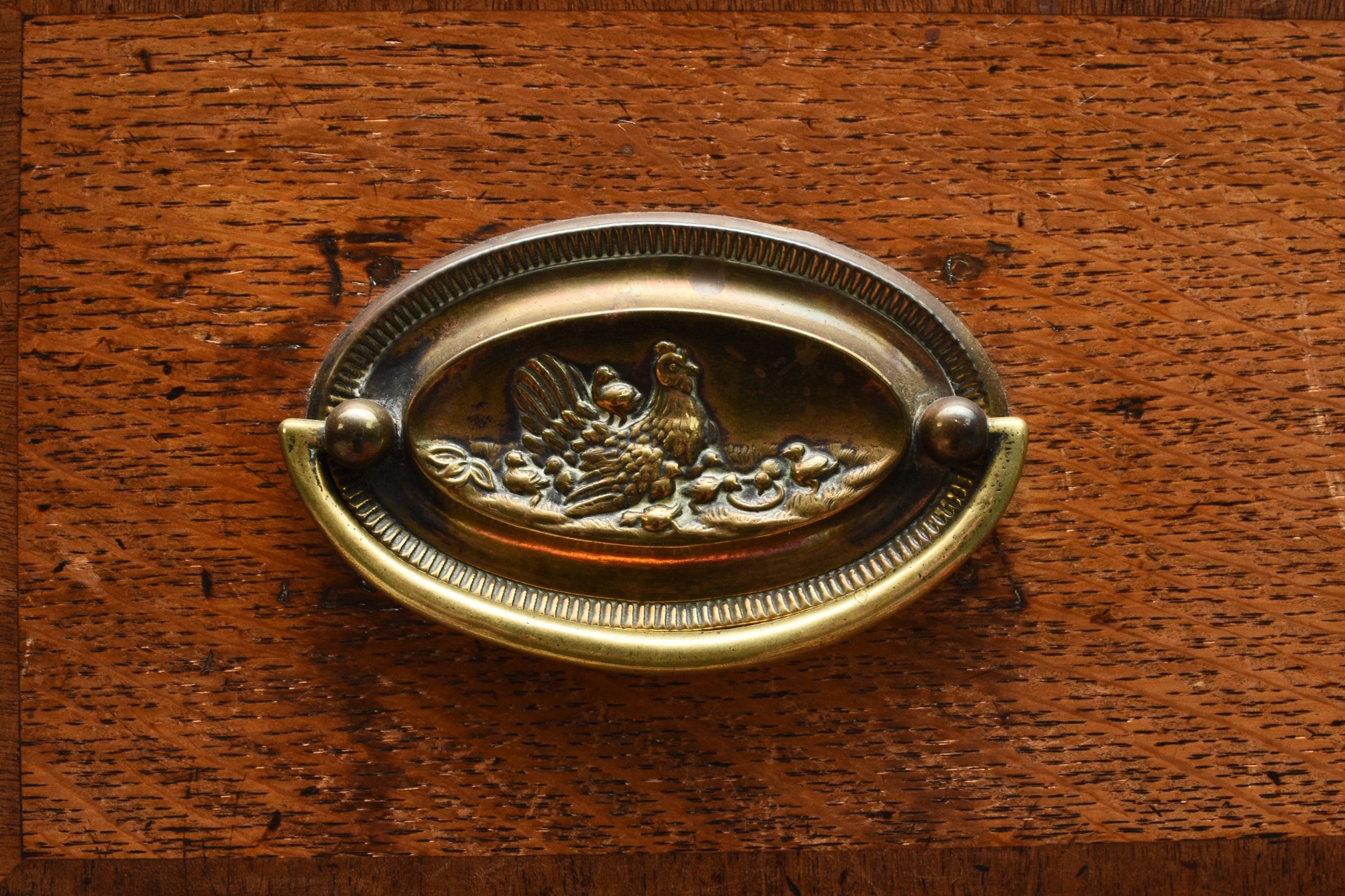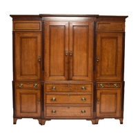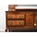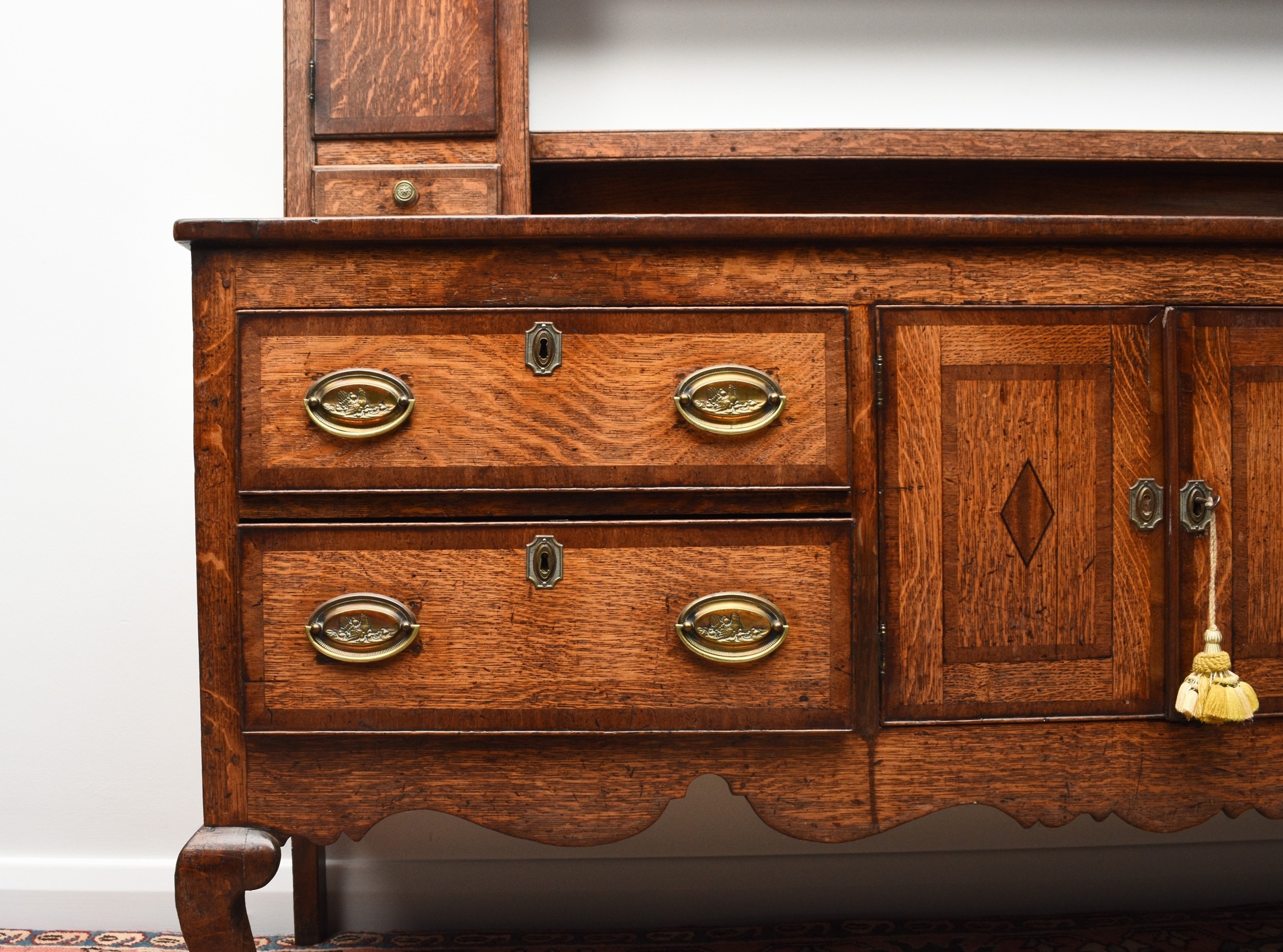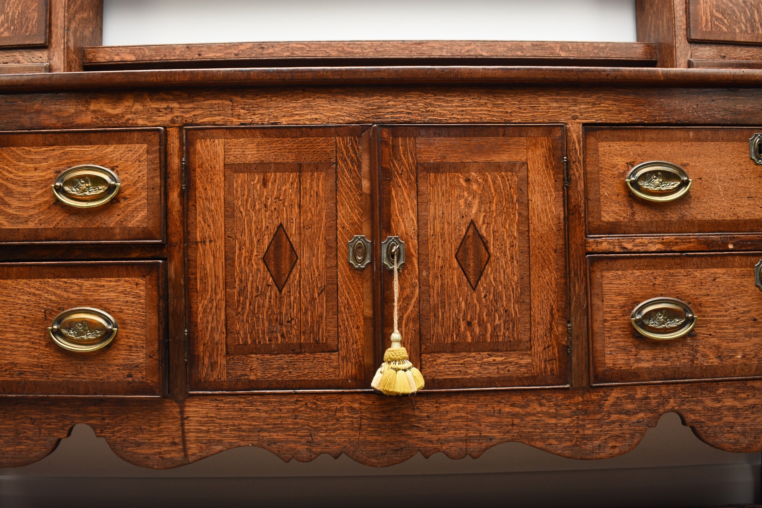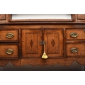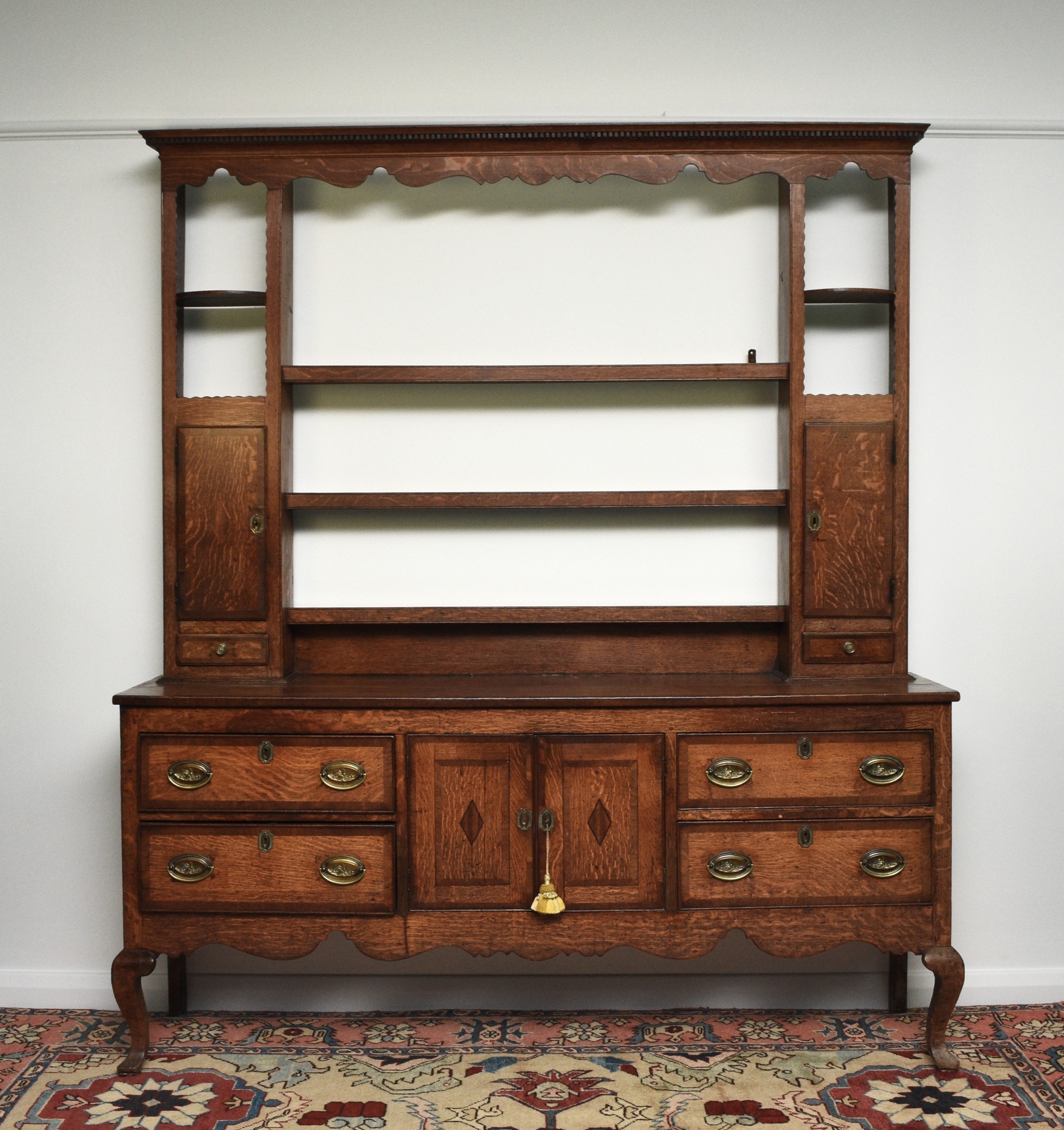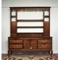 A George III cross-banded oak dresser and rack, Shropshire The open rack with dentil cornice and scroll cut frieze, above a pair of cupboard doors over a small drawer flanking three shelves, the lower section with two pairs of drawers centred by a pair of cupboard doors, conforming scroll apron, on cabriole front legs terminating in pad feet. 178cm wide x 44cm deep x 207cm high Condition:Generally good with good colour and figuring. Some minor cosmetic marks consistent with age and use. Top of base section has some board shrinkage splits. No evidence of worm found.