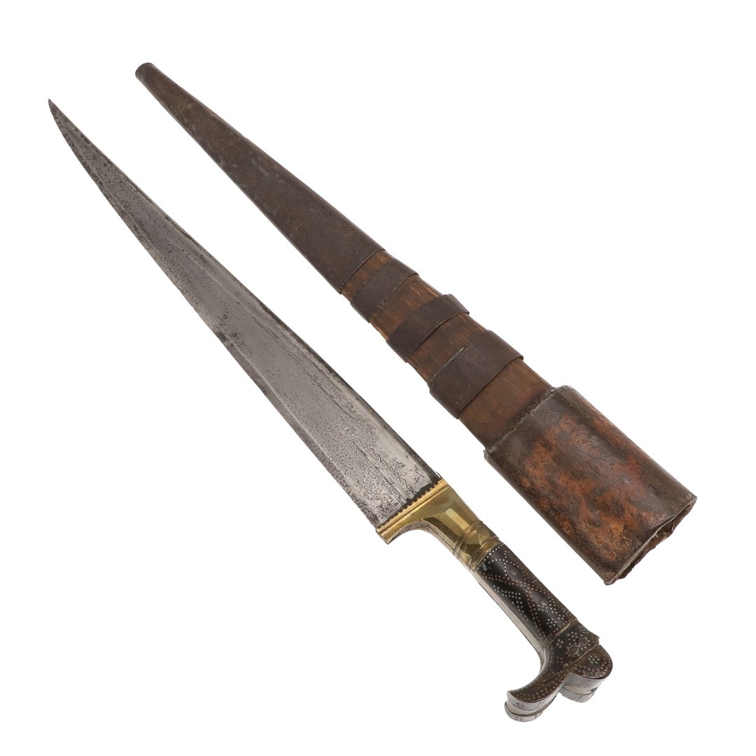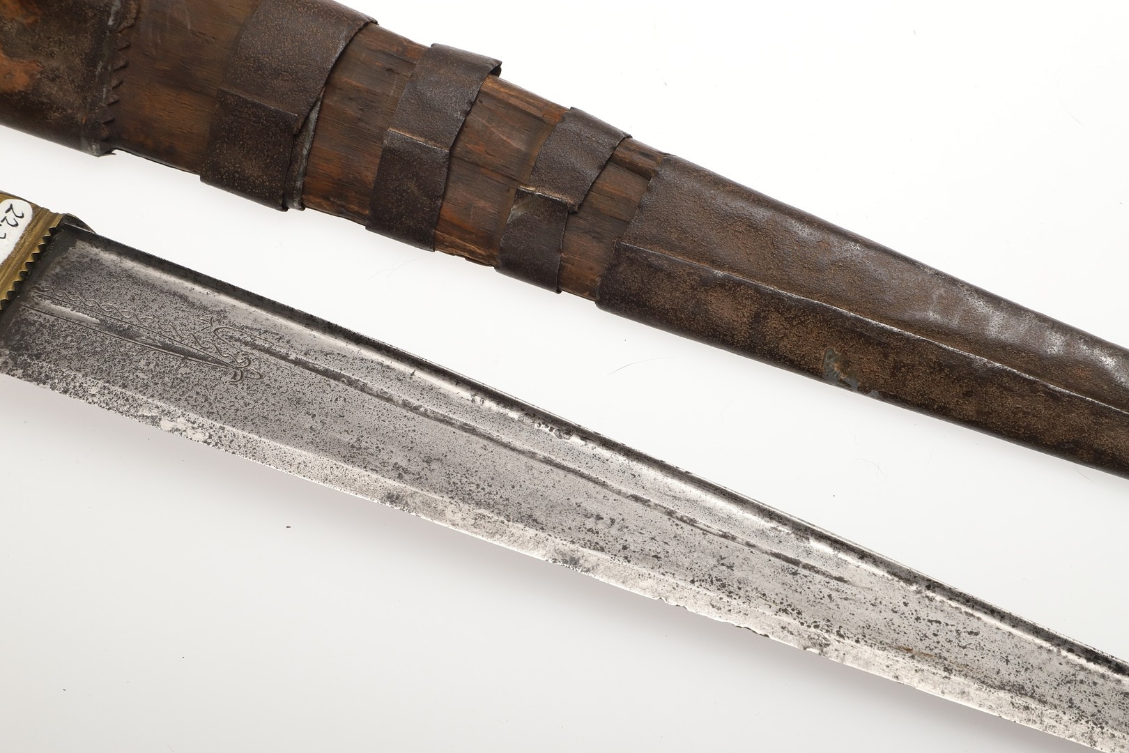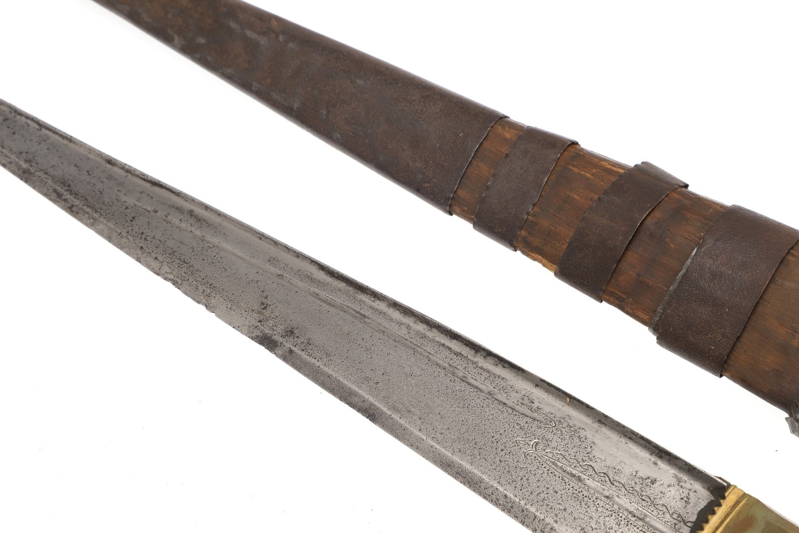 A 19TH CENTURY AFGHAN KHYBER KNIFE AND SCABBARD. The 33 cm long straight pointed 'T' shaped blade with a broad back and slight decorated fullers to both sides. On a brass mount and decorative grip with nail head 'dot' patterning throughout. In a metal bound wooden scabbard. 47 cm.