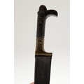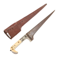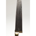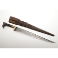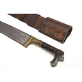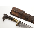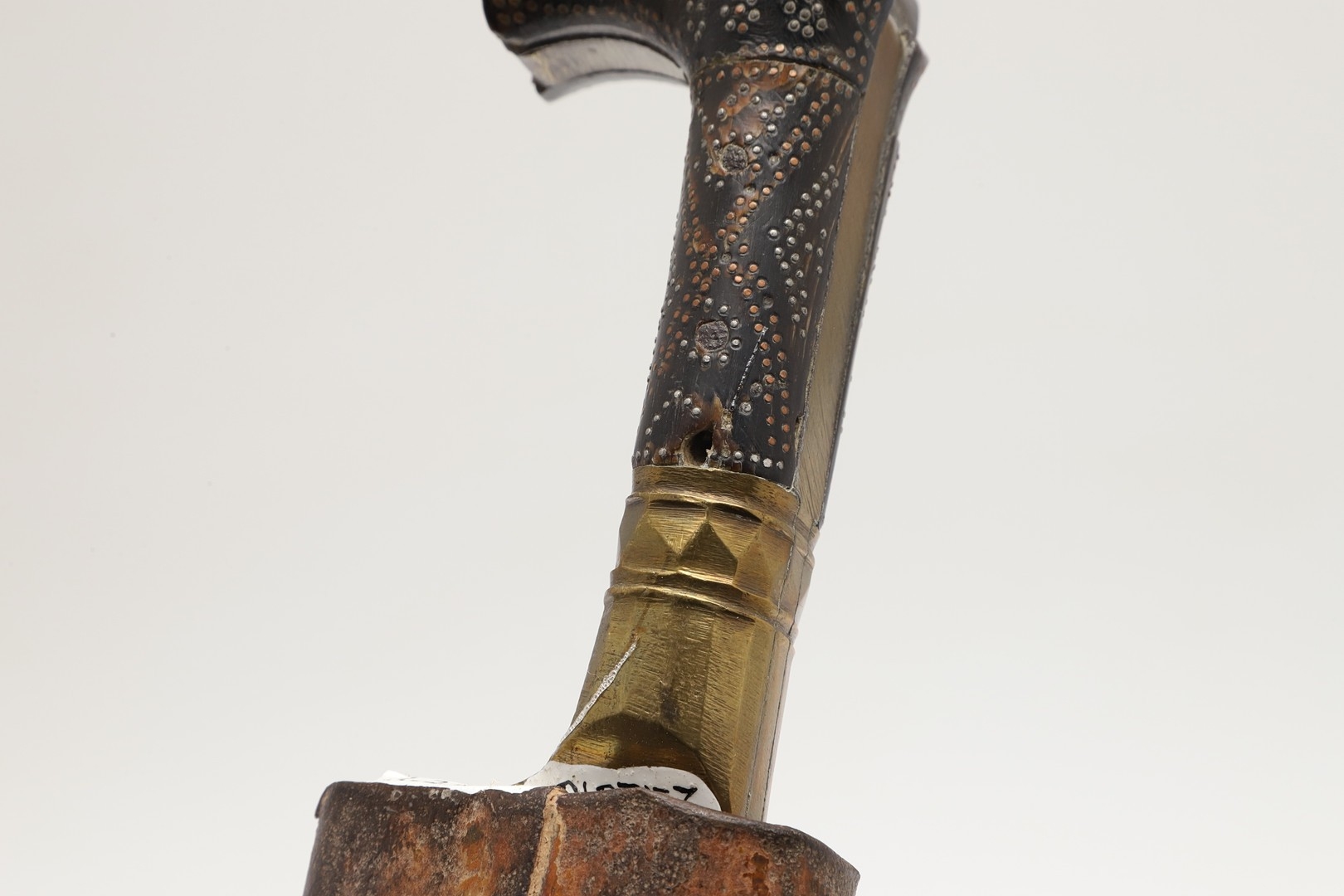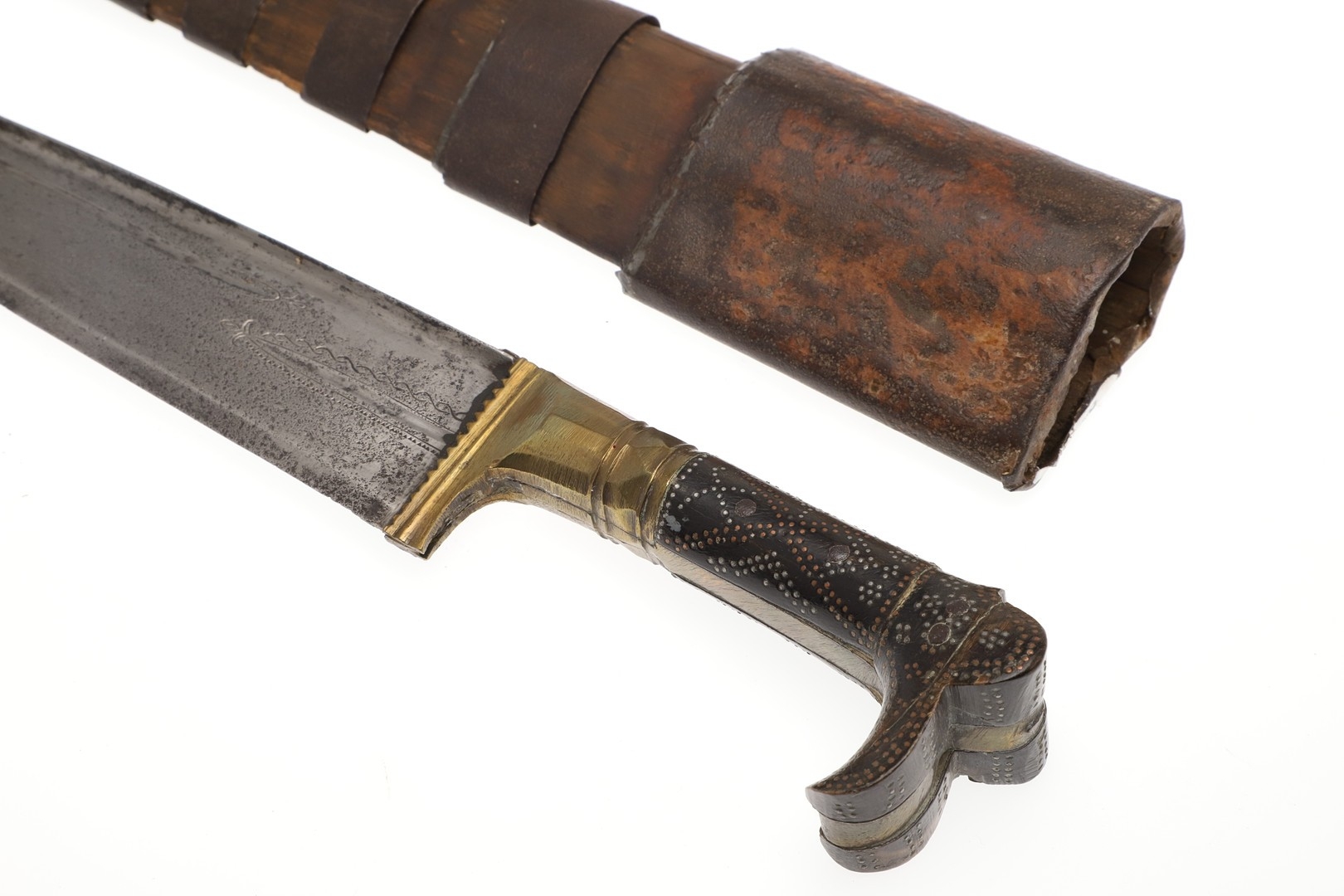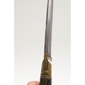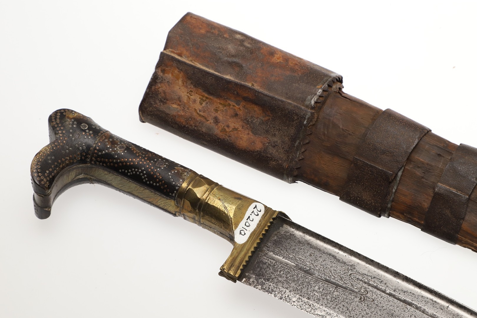 A 19TH CENTURY AFGHAN KHYBER KNIFE AND SCABBARD. The 33 cm long straight pointed 'T' shaped blade with a broad back and slight decorated fullers to both sides. On a brass mount and decorative grip with nail head 'dot' patterning throughout. In a metal bound wooden scabbard. 47 cm.